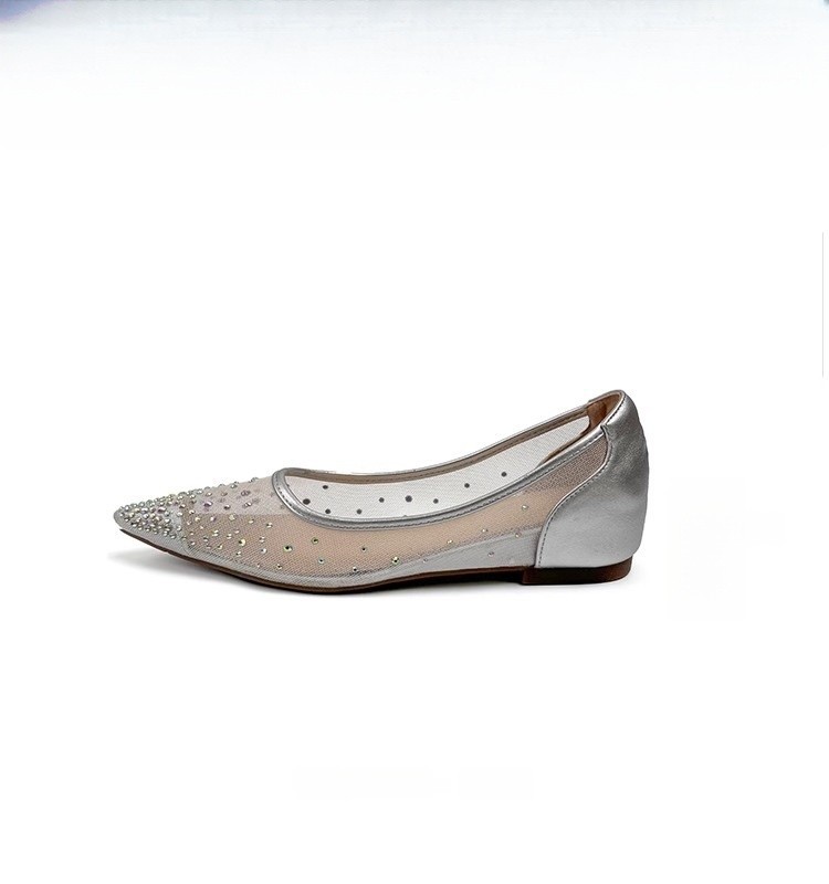 샴페인 아름다운 메쉬 라인스톤 포인팅 얕은 입 신발 여성의 2025 년 여름 새로운 프랑스 우아한 플랫 샌들스토어 가기