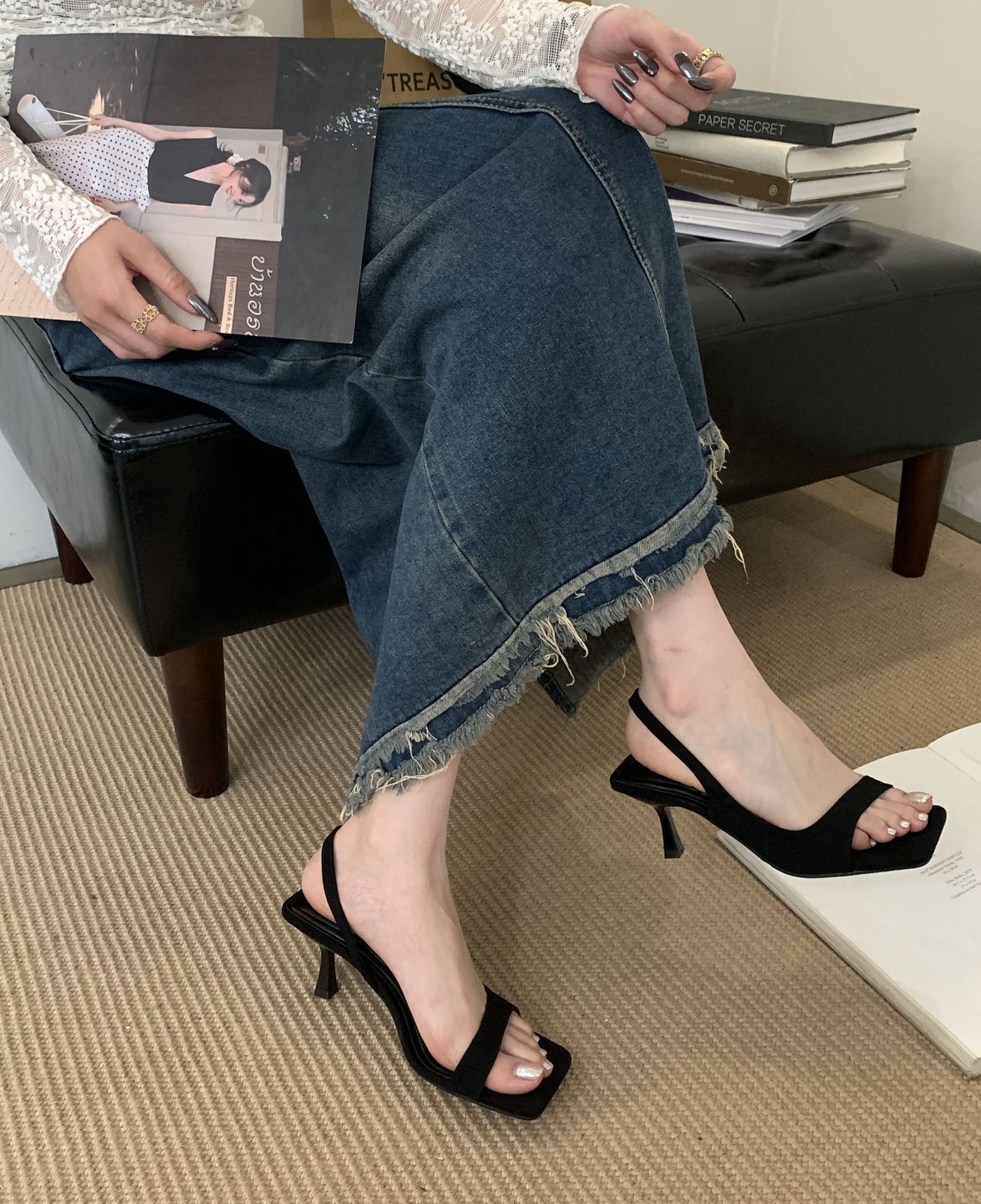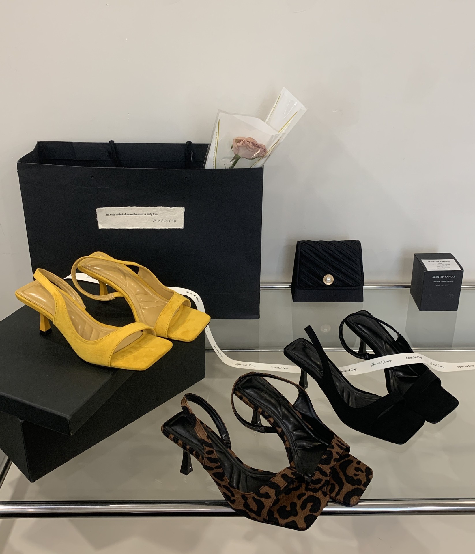 2025 새로운 여름 레오파드 프린트 스웨이드 스퀘어 토 얇은 힐 미드 힐 오픈 토 샌들 하이힐 펌프스 여성 신발스토어 가기