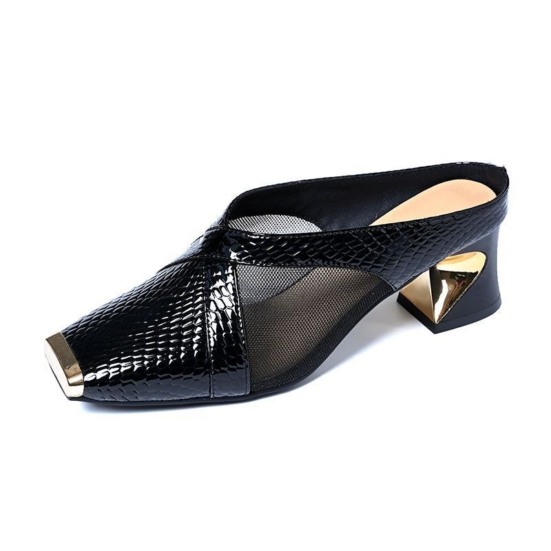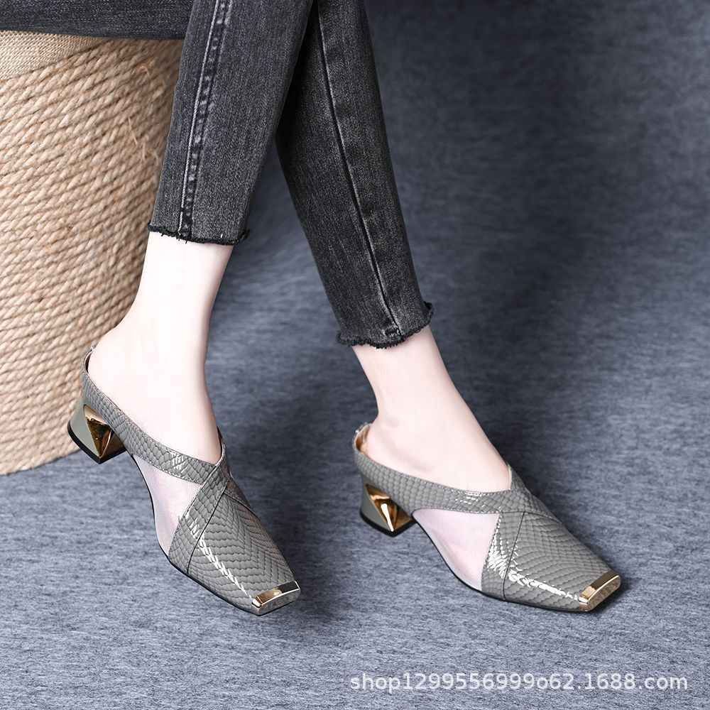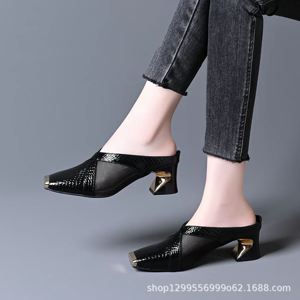 여성용 두꺼운 굽 샌들 2025 여름 새로운 스타일 외투용 여성용 발가락 반슬리퍼 다용도 스퀘어 토 메쉬 뮬스토어 가기