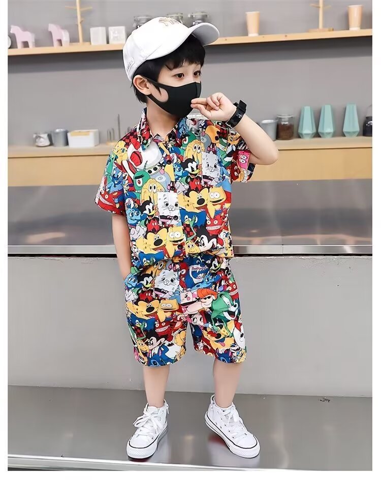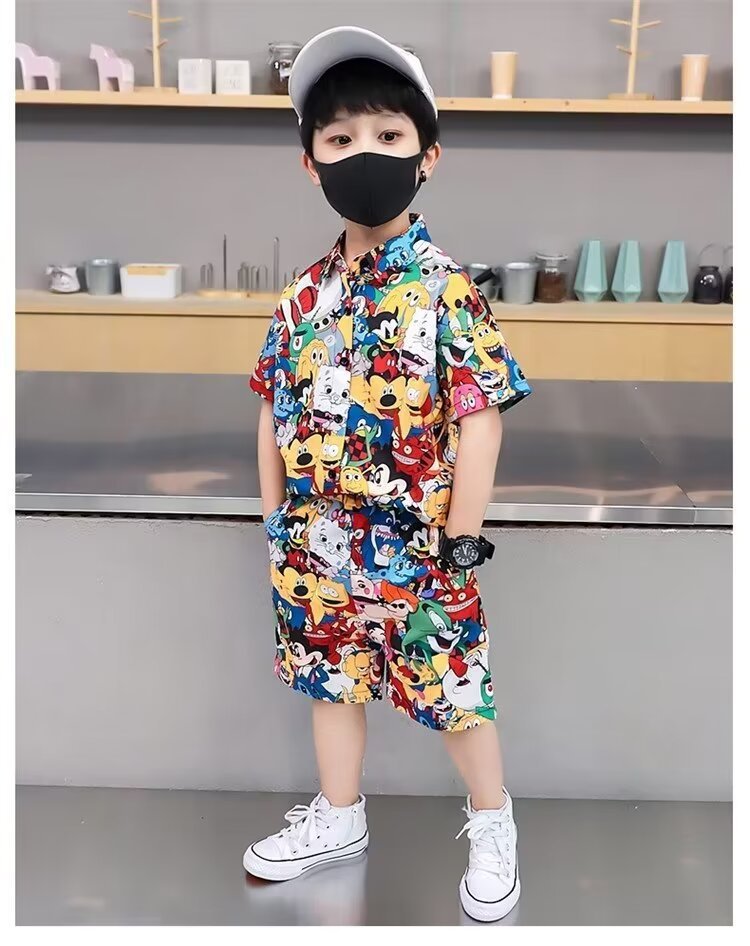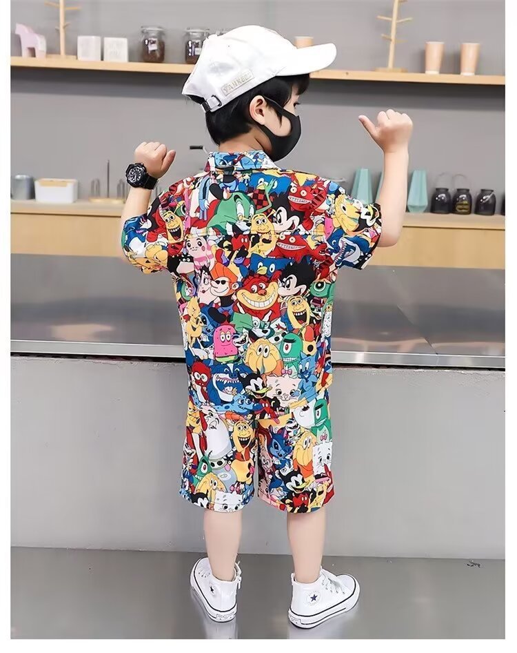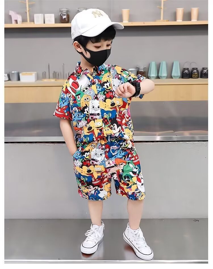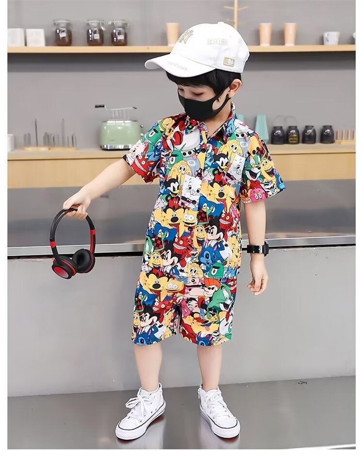 남자들의 여름 세트 2024 새로운 한국 패션 반팔 셔츠 투피스 유행 어린이 만화 거리 옷