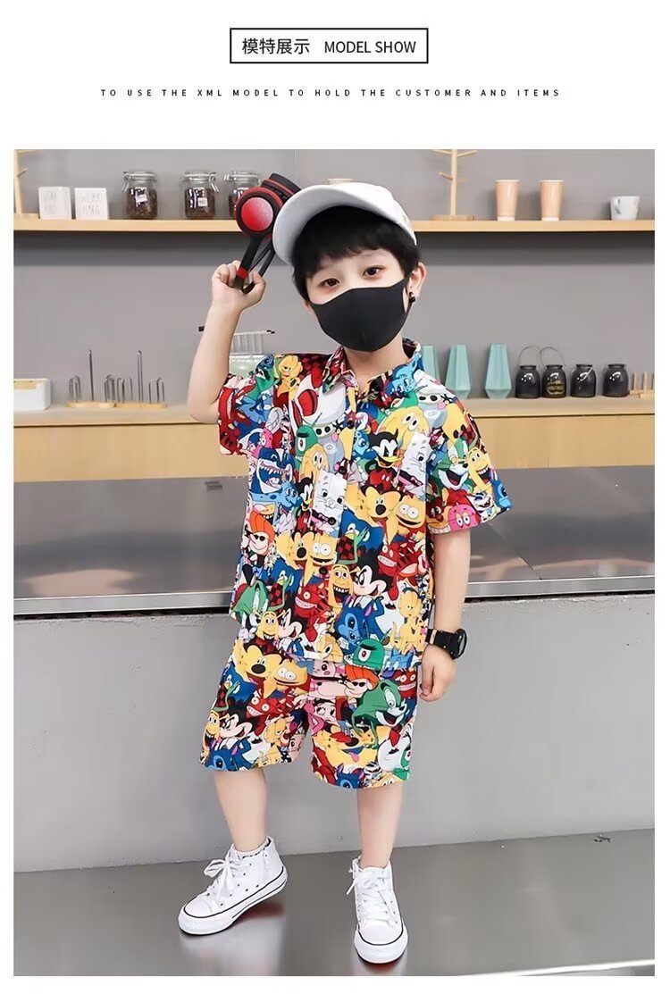 남자들의 여름 세트 2024 새로운 한국 패션 반팔 셔츠 투피스 유행 어린이 만화 거리 옷스토어 가기