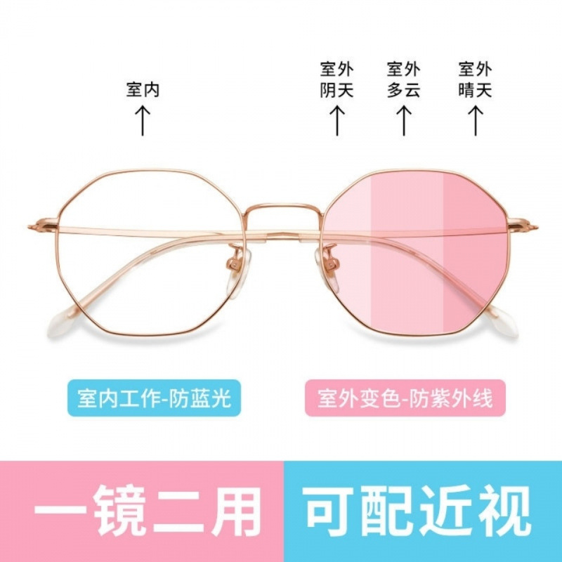 변색거울, 감광변색안경, 평면광, 자외선차단, 근시선글라스, 트렌디한 핑크렌즈가 있는 여성 인터넷 연예인