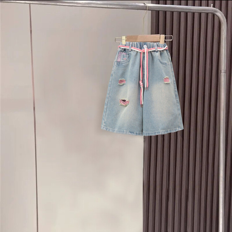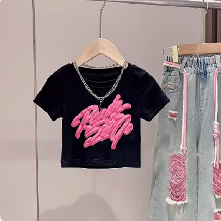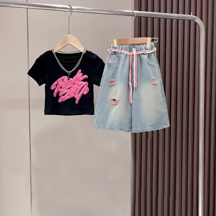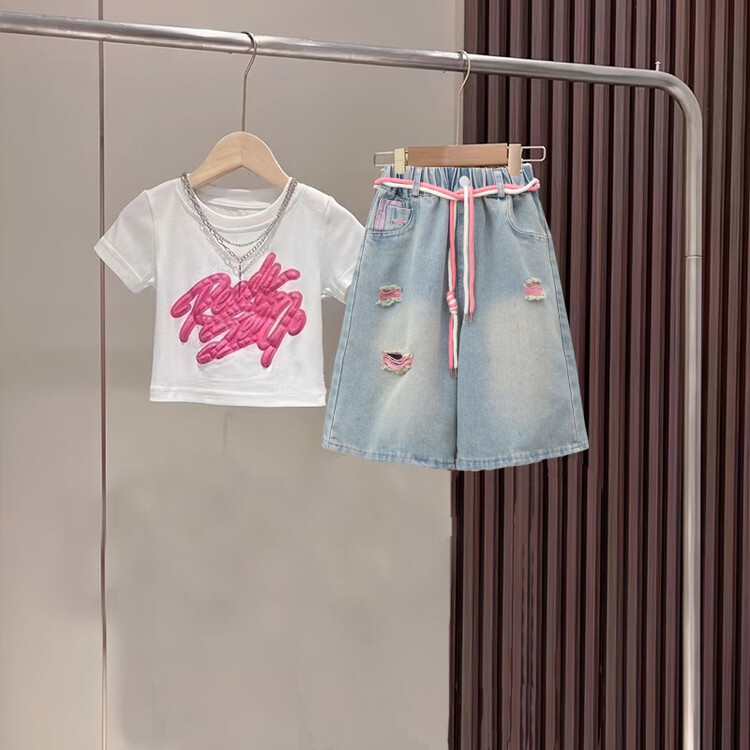 여자 가을 새로운 입체 스프레이 페인팅 낙서 반팔 컬러 데님 찢어진 바지 정장 어린이 스타일 와이드 레그 바지스토어 가기