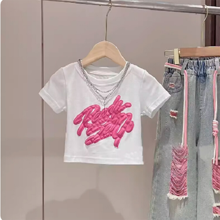 여자 가을 새로운 입체 스프레이 페인팅 낙서 반팔 컬러 데님 찢어진 바지 정장 어린이 스타일 와이드 레그 바지