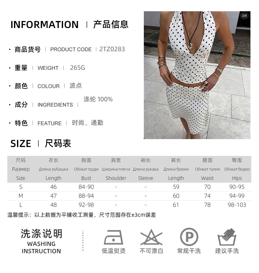 2025 새로운 여름 스타일 폴카 도트 홀터넥 서스펜더 하이 웨이스트 스커트 투피스 세트 여성 디자인 세련되고 섹시한 유럽과 미국스토어 가기