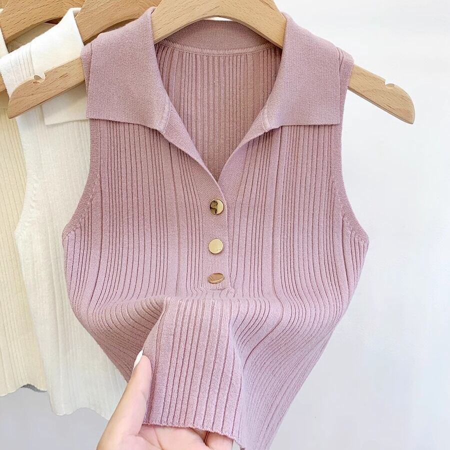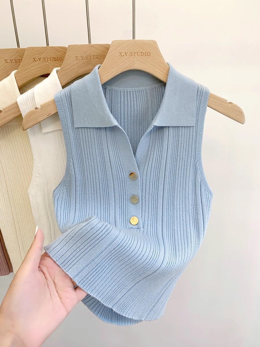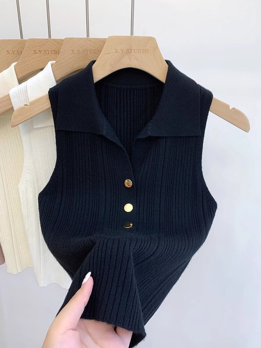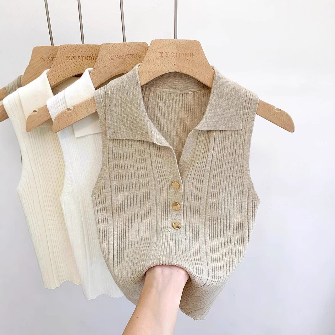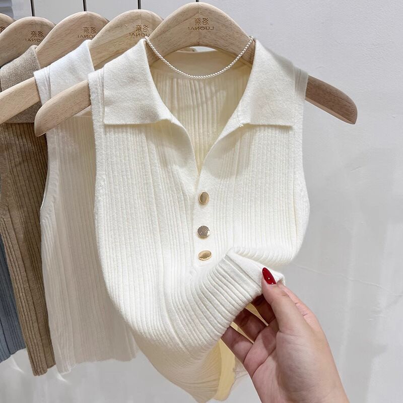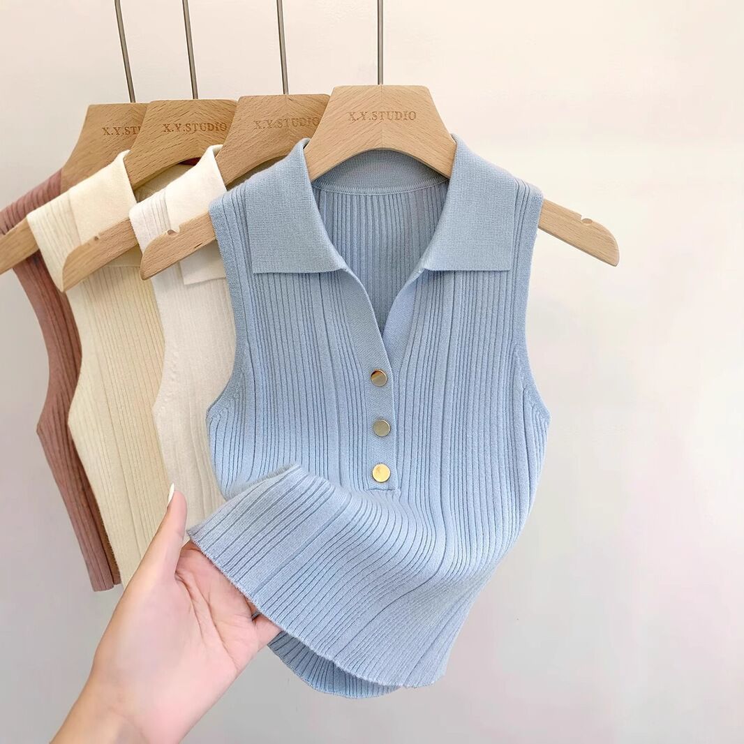 2025 봄 작은 향기로운 스타일 골드 버튼 폴로 칼라 니트 조끼 여성 프렌치 민소매 독특하고 세련된 슬림 탑 트렌디스토어 가기