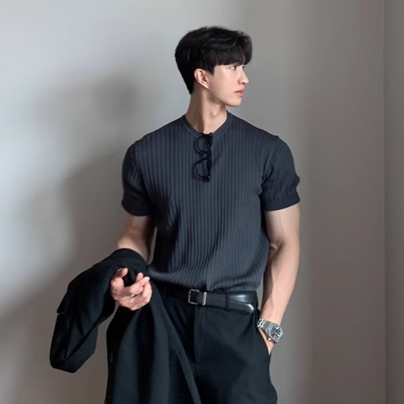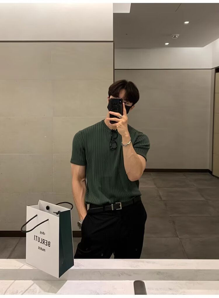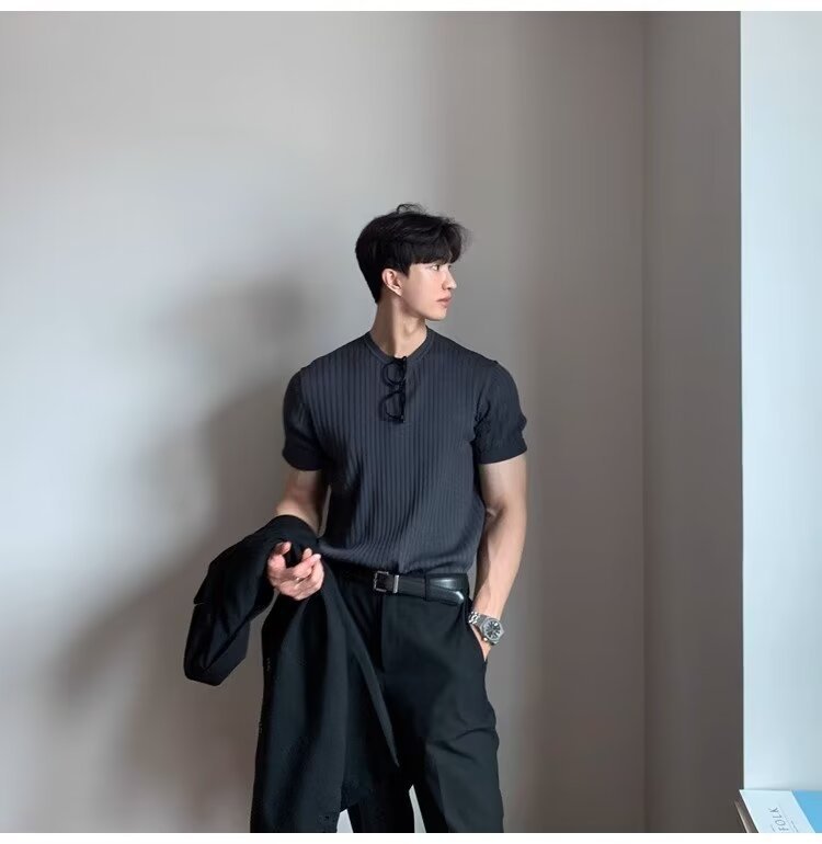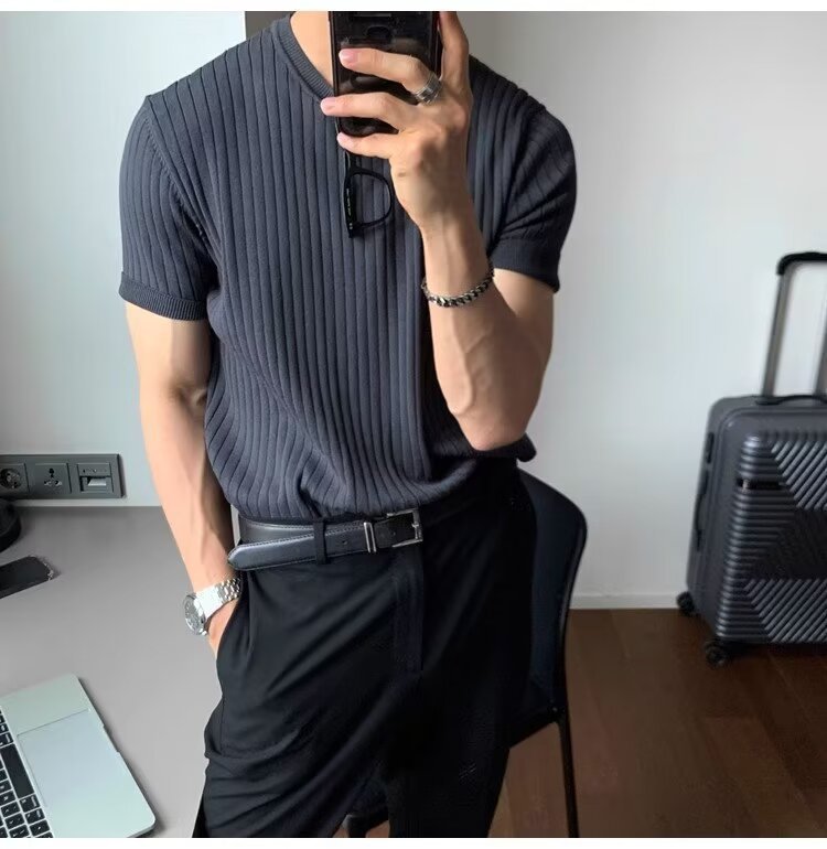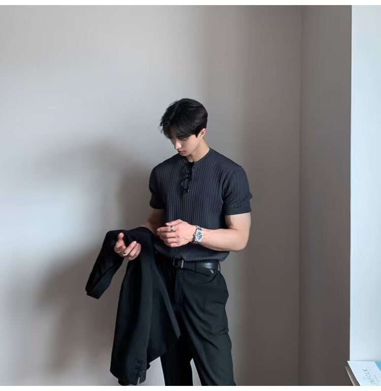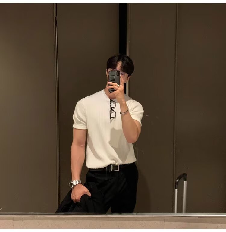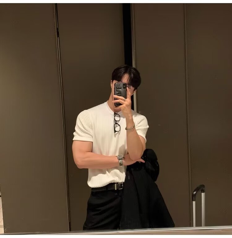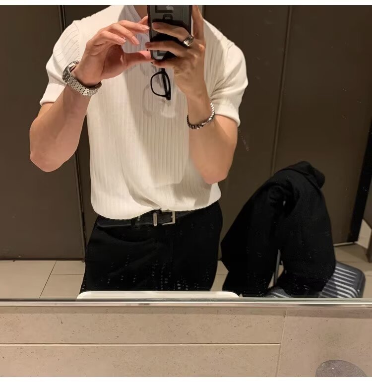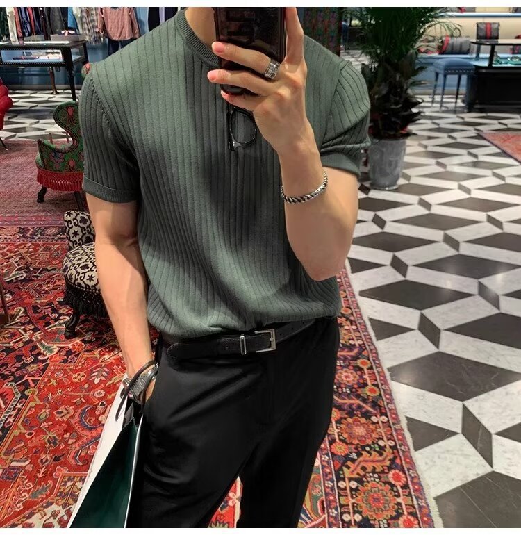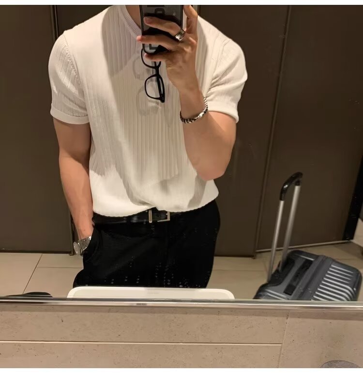 반팔 셔츠 남성 여름 신작 반팔 비즈니스 캐주얼 니트 티셔츠 라운드 넥 슬림 기질 반팔 남성상의