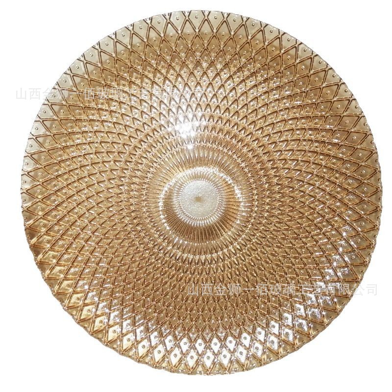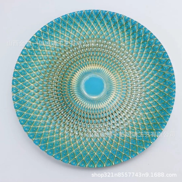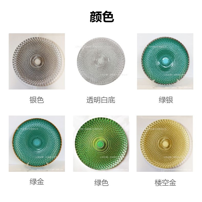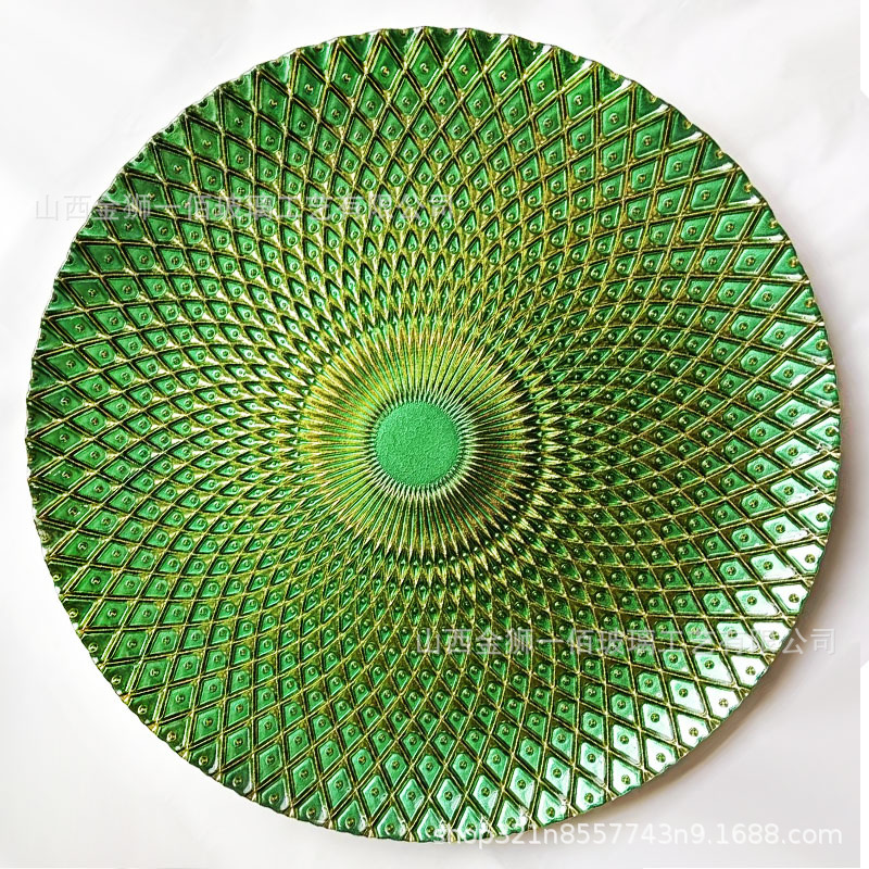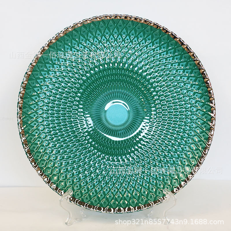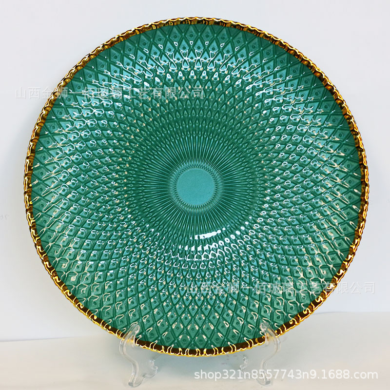 유럽 스타일 엔트리 럭셔리 크리스탈 유리 플레이트 핀치 테일 패턴 골드 그린 과일 플레이트 라운드 웨스턴 플레이트 장식 플레이트 연회 섀시스토어 가기