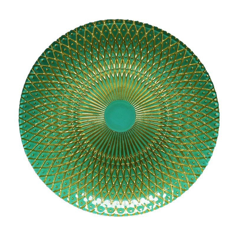 유럽 스타일 엔트리 럭셔리 크리스탈 유리 플레이트 핀치 테일 패턴 골드 그린 과일 플레이트 라운드 웨스턴 플레이트 장식 플레이트 연회 섀시