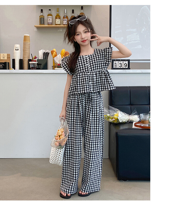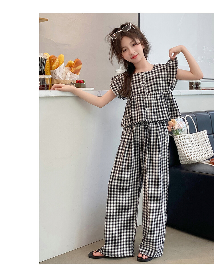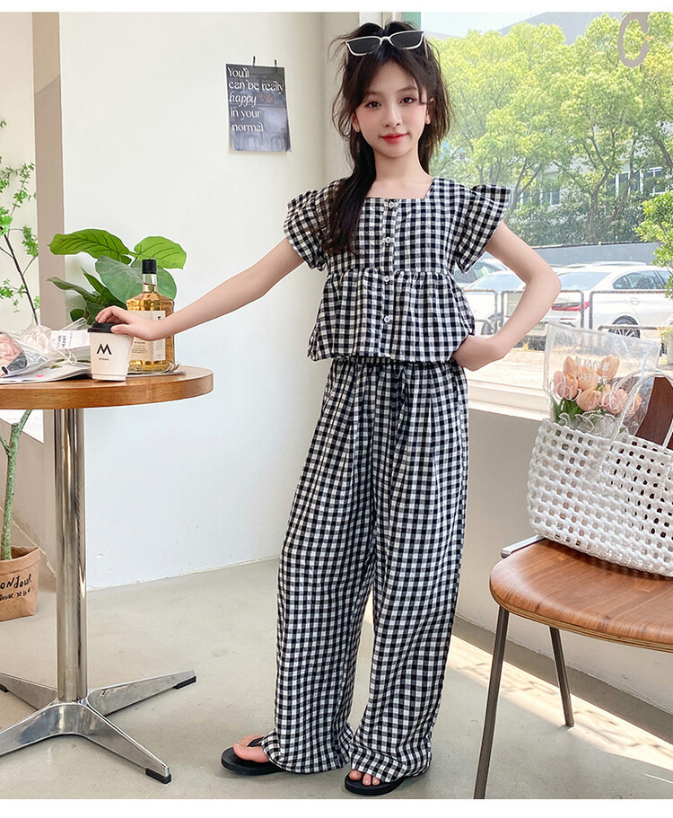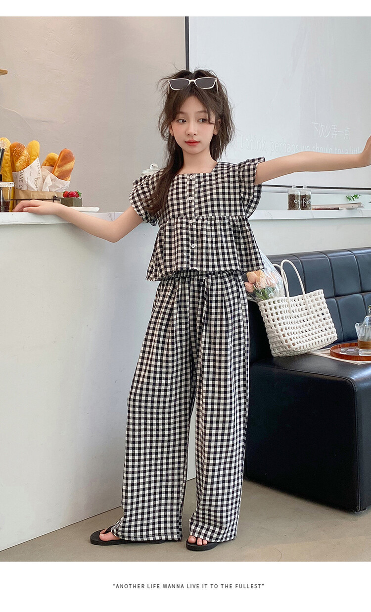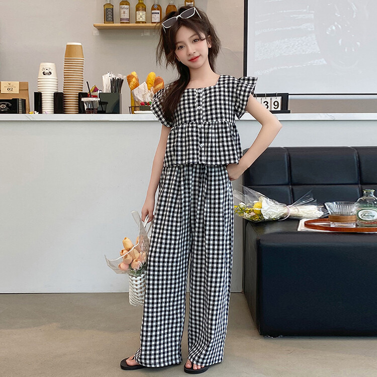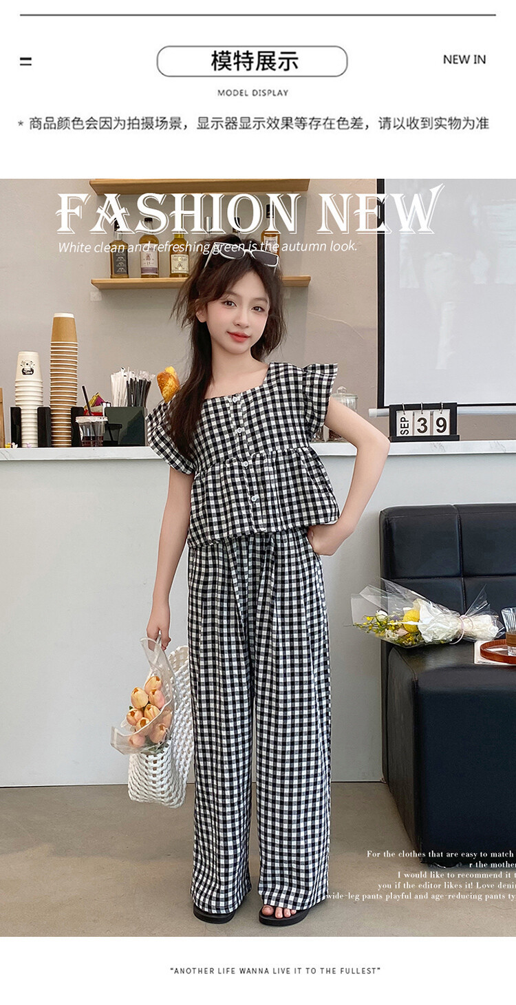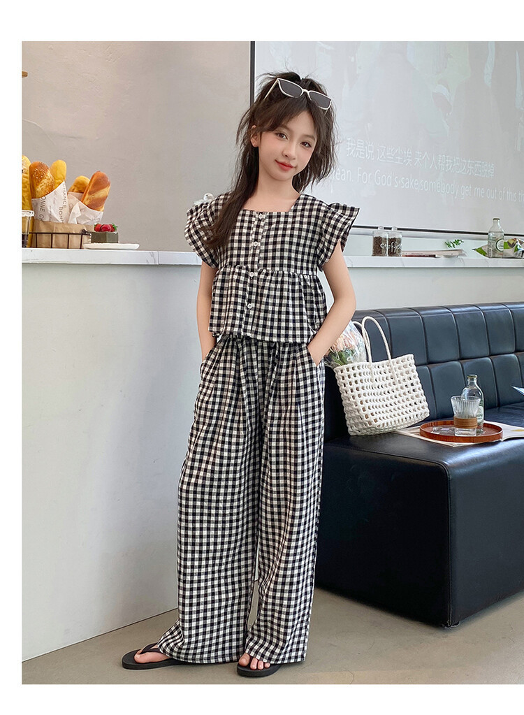 소녀 여름 인터넷 인기있는 격자 무늬 세트 2025 새로운 어린이 한국 스타일 얇은 넓은 다리 바지 어린 소녀의 세련된 여름 원피스