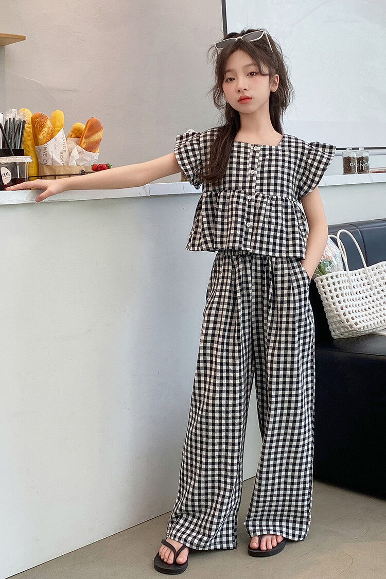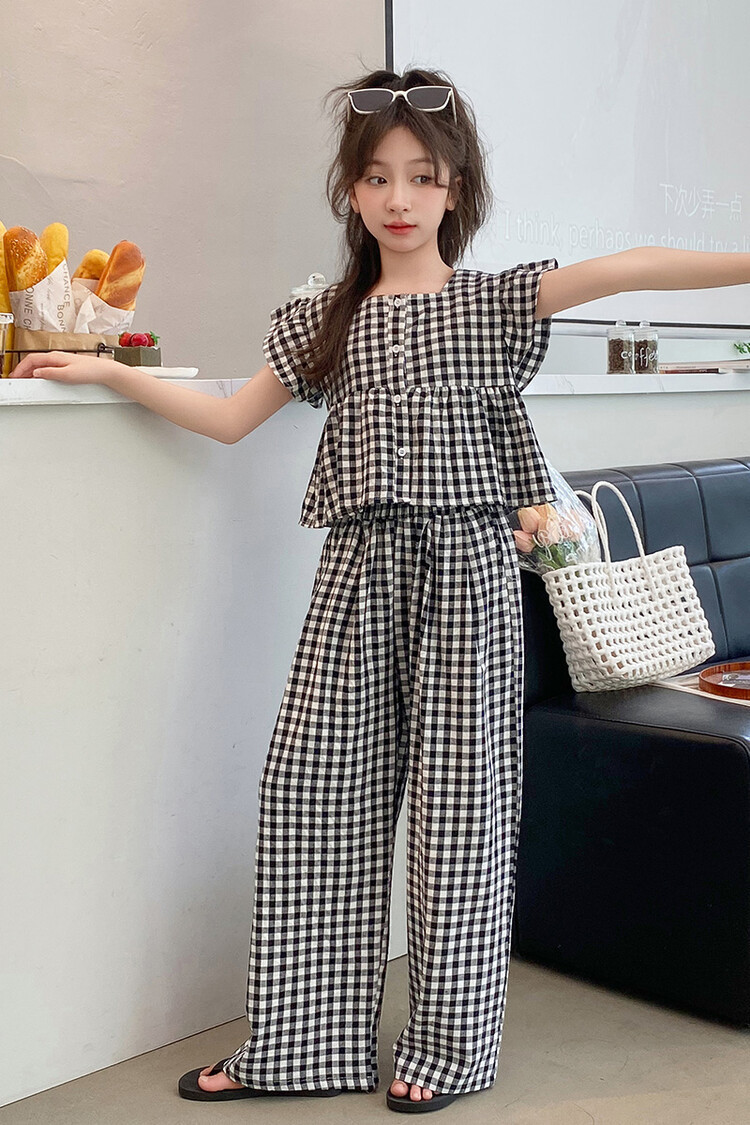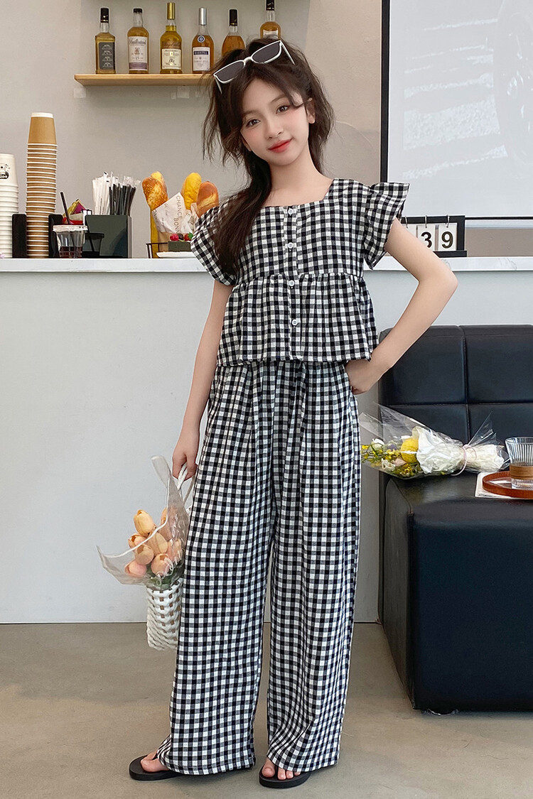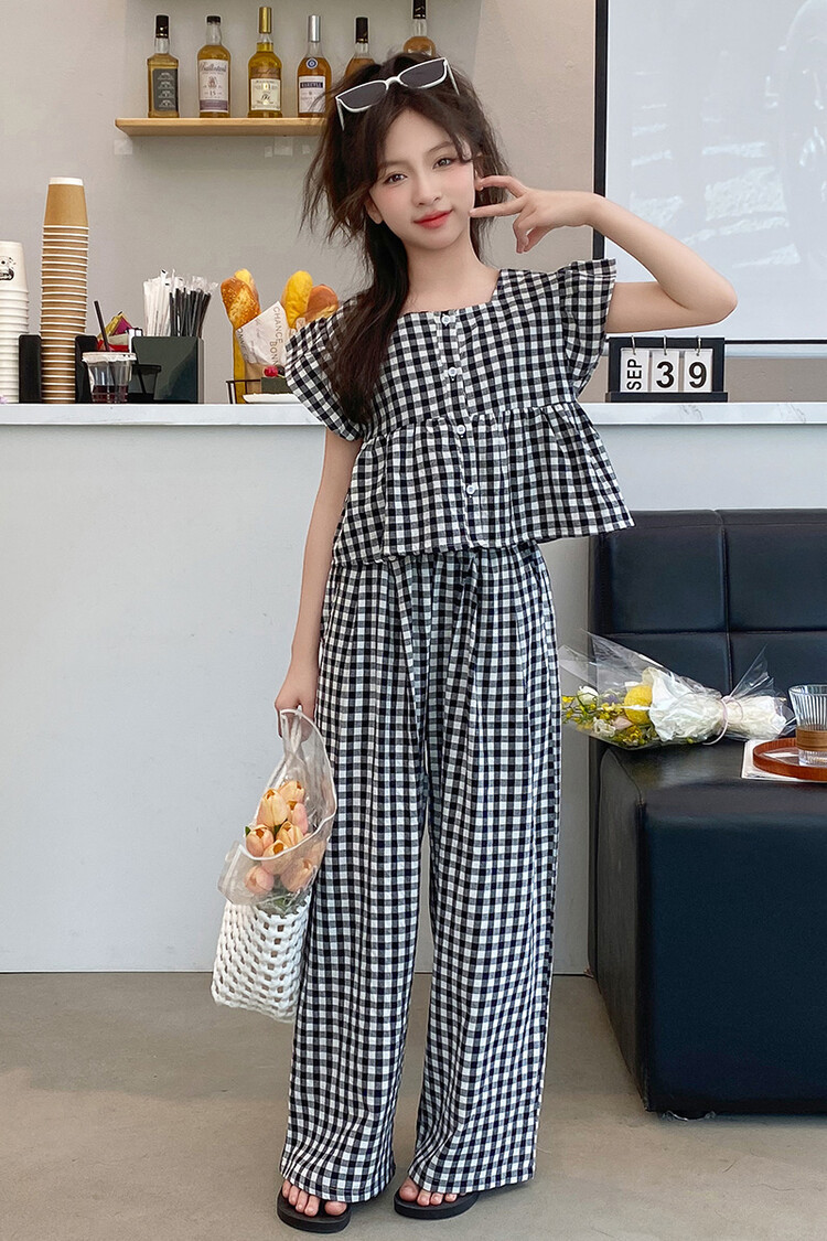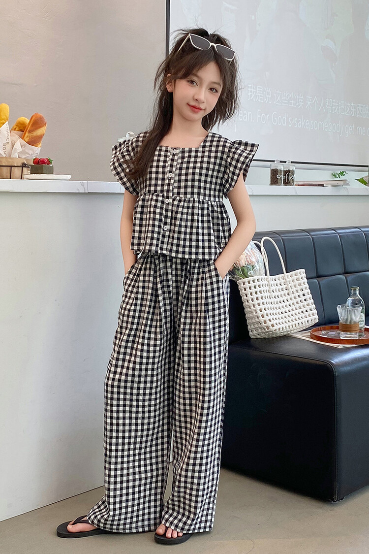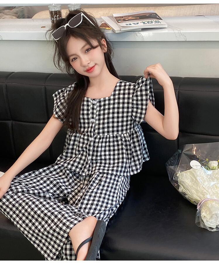 소녀 여름 인터넷 인기있는 격자 무늬 세트 2025 새로운 어린이 한국 스타일 얇은 넓은 다리 바지 어린 소녀의 세련된 여름 원피스