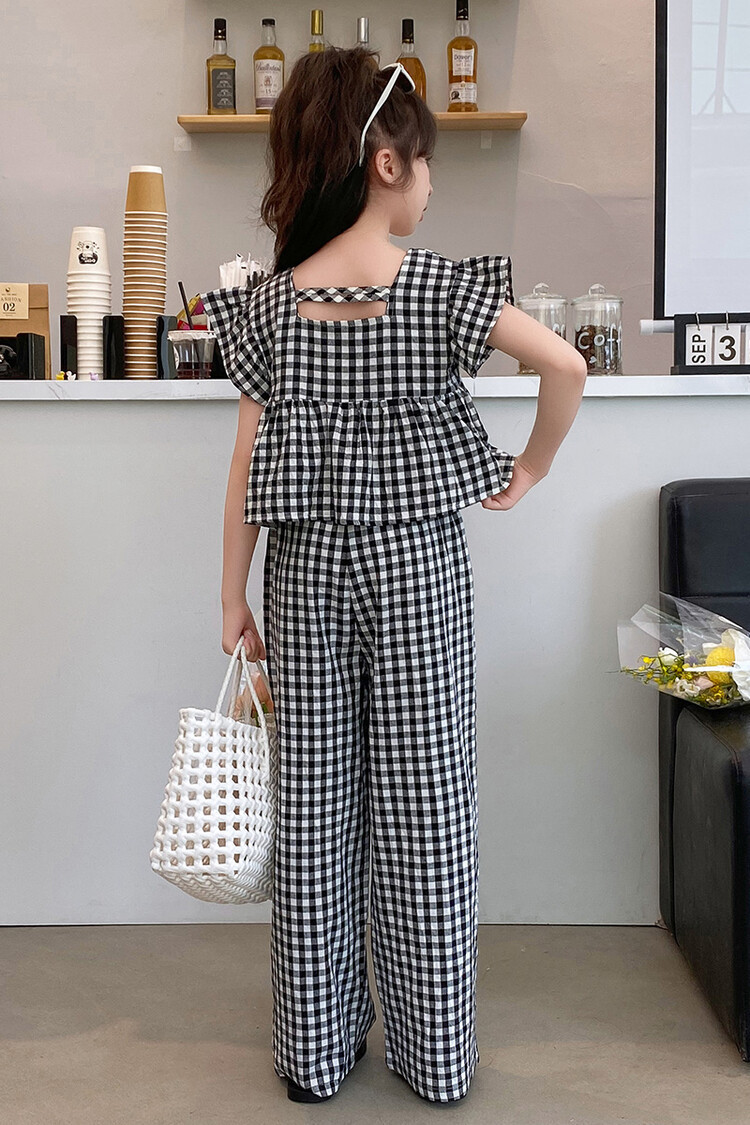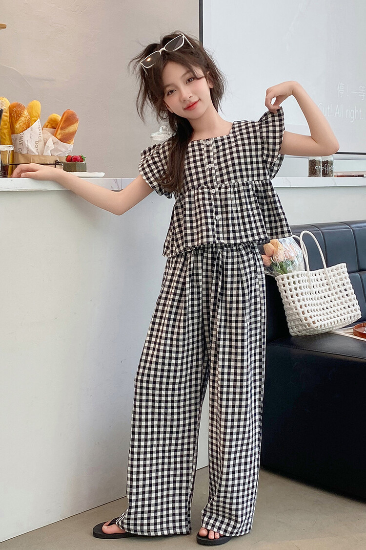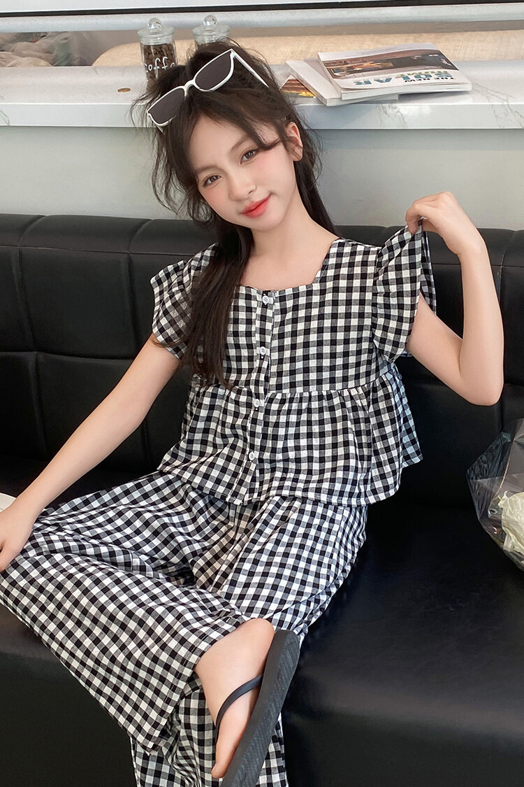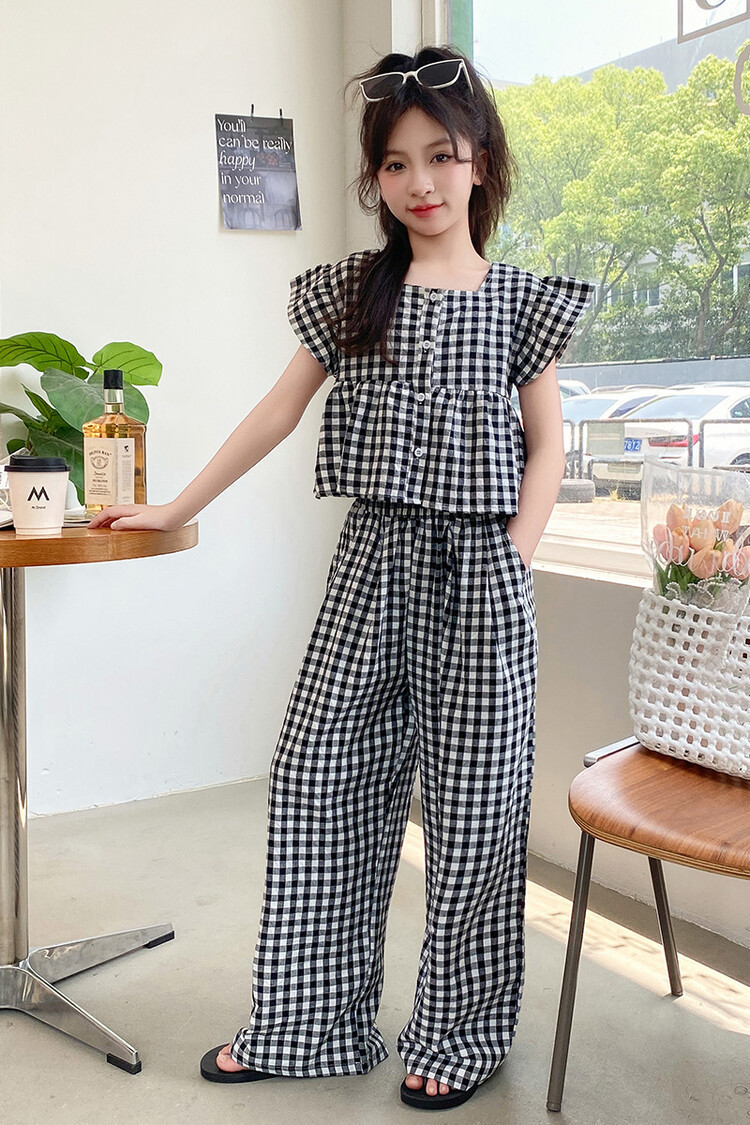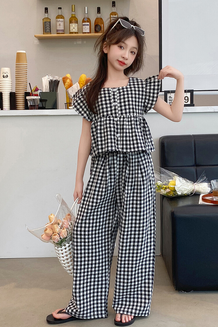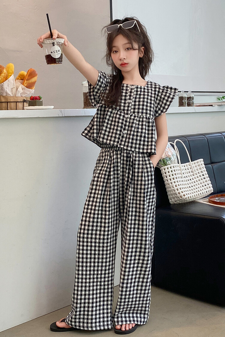 소녀 여름 인터넷 인기있는 격자 무늬 세트 2025 새로운 어린이 한국 스타일 얇은 넓은 다리 바지 어린 소녀의 세련된 여름 원피스