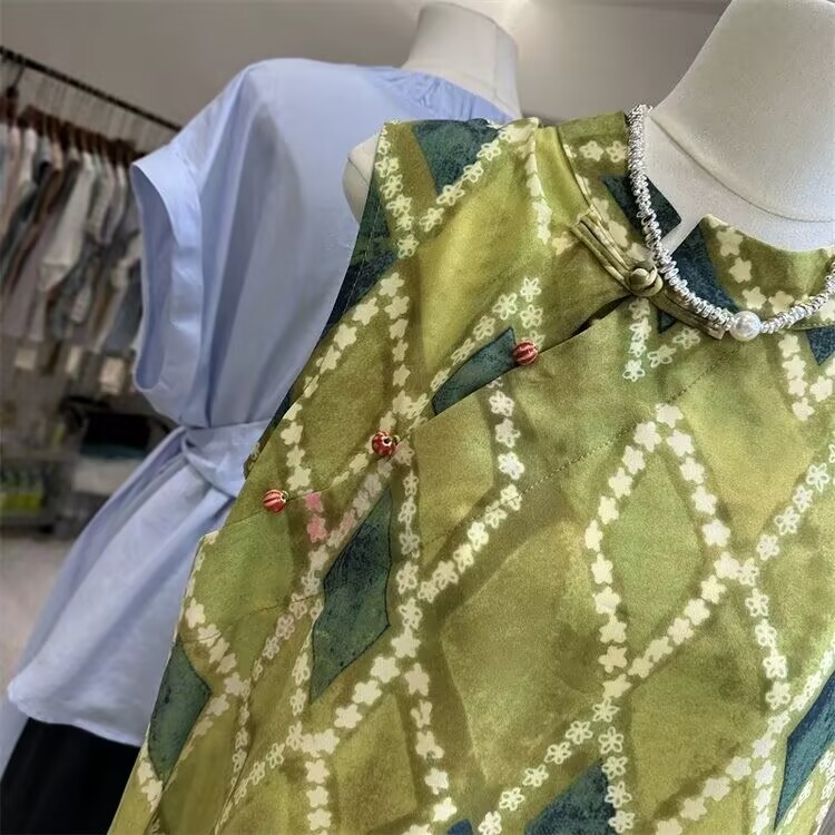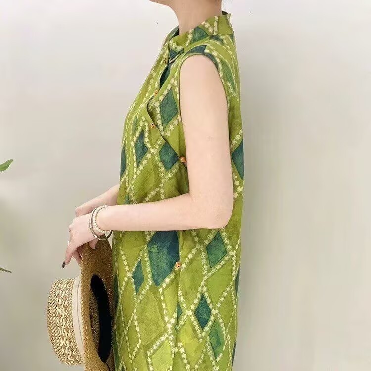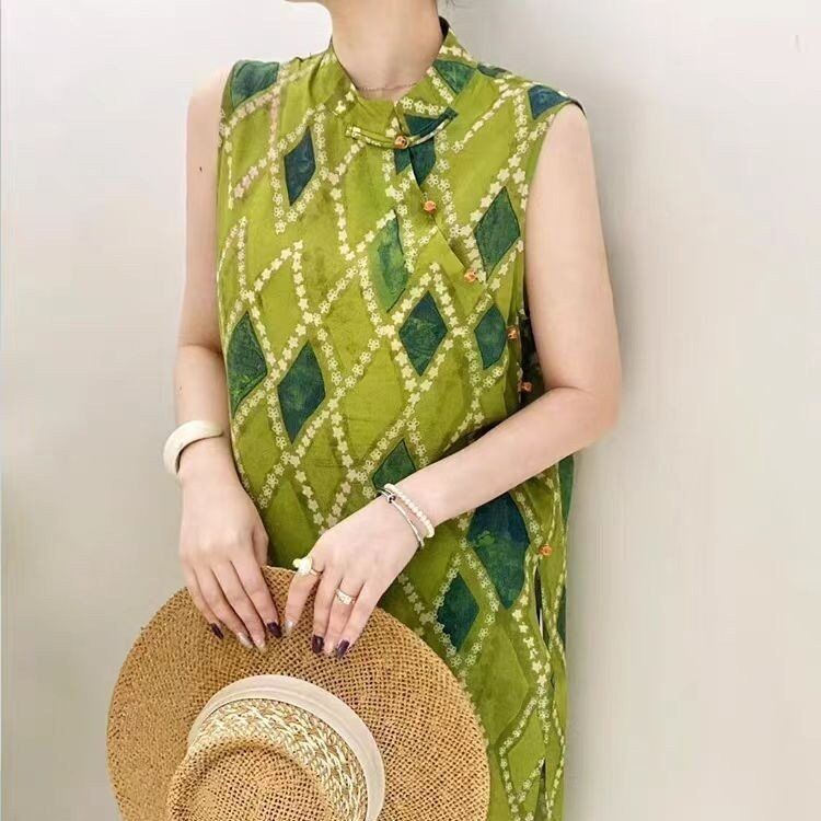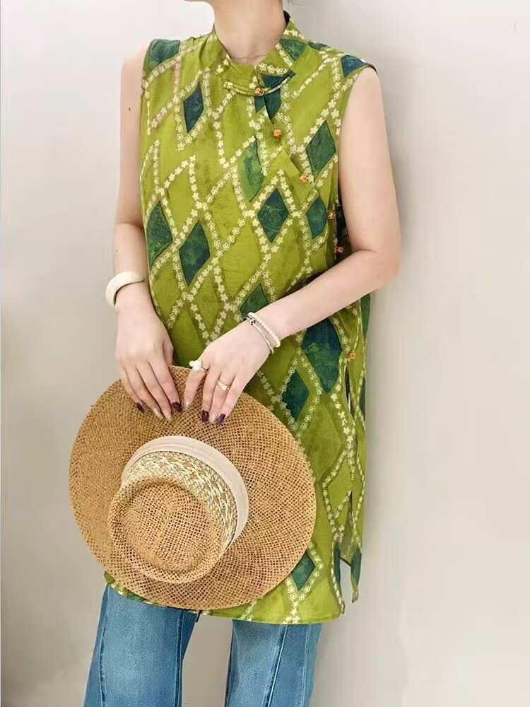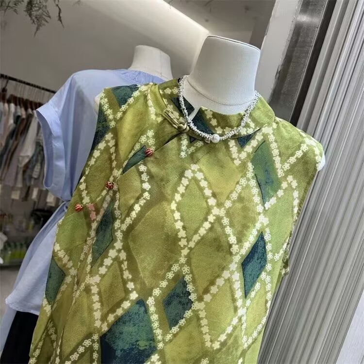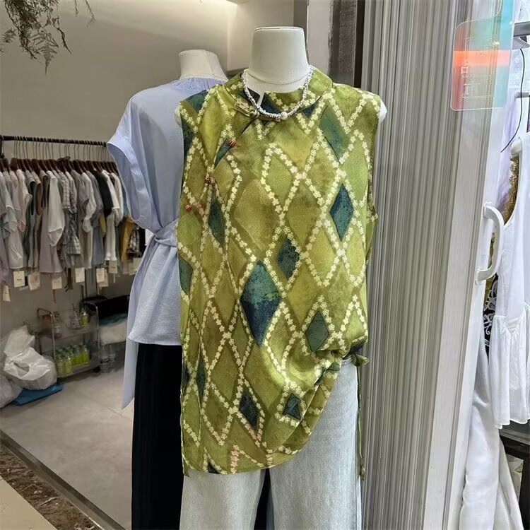 빈티지 스탠드 칼라 민소매 셔츠 여성용 2025 년 여름 새로운 스타일의 경사 플래켓 버클 중국 스타일 다이아몬드 체크 무늬 조끼 탑스토어 가기