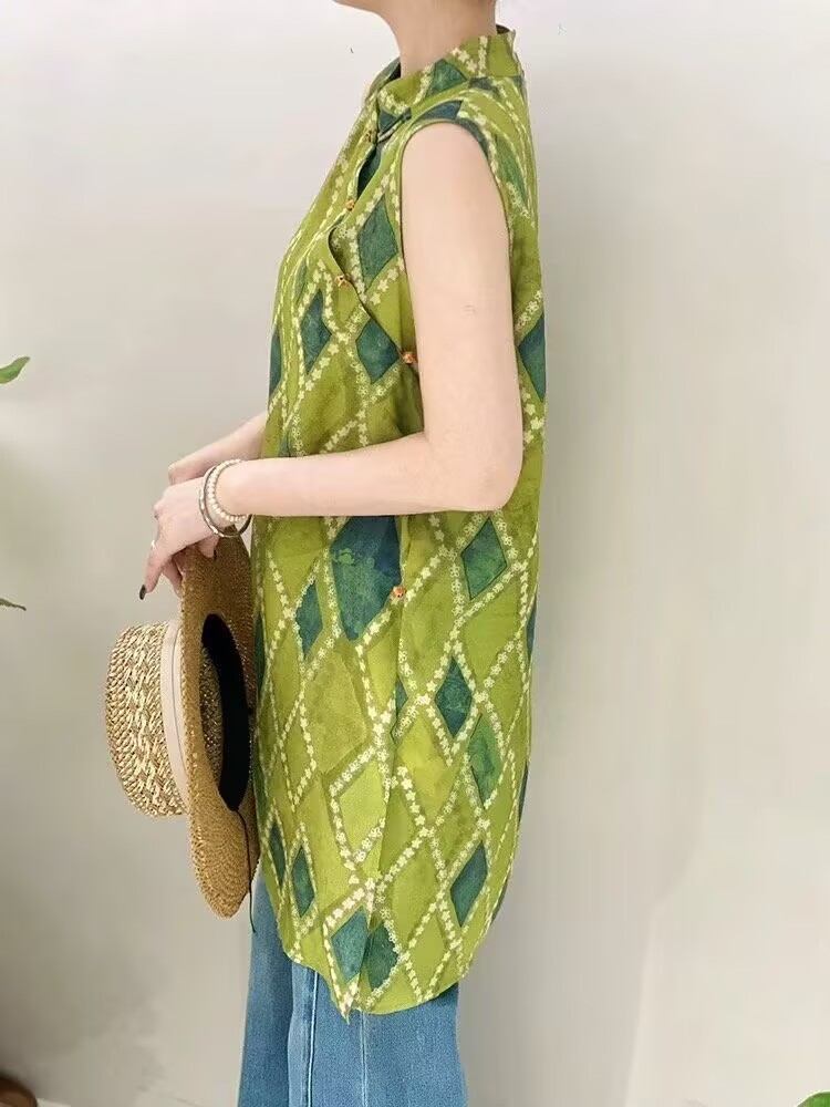 빈티지 스탠드 칼라 민소매 셔츠 여성용 2025 년 여름 새로운 스타일의 경사 플래켓 버클 중국 스타일 다이아몬드 체크 무늬 조끼 탑