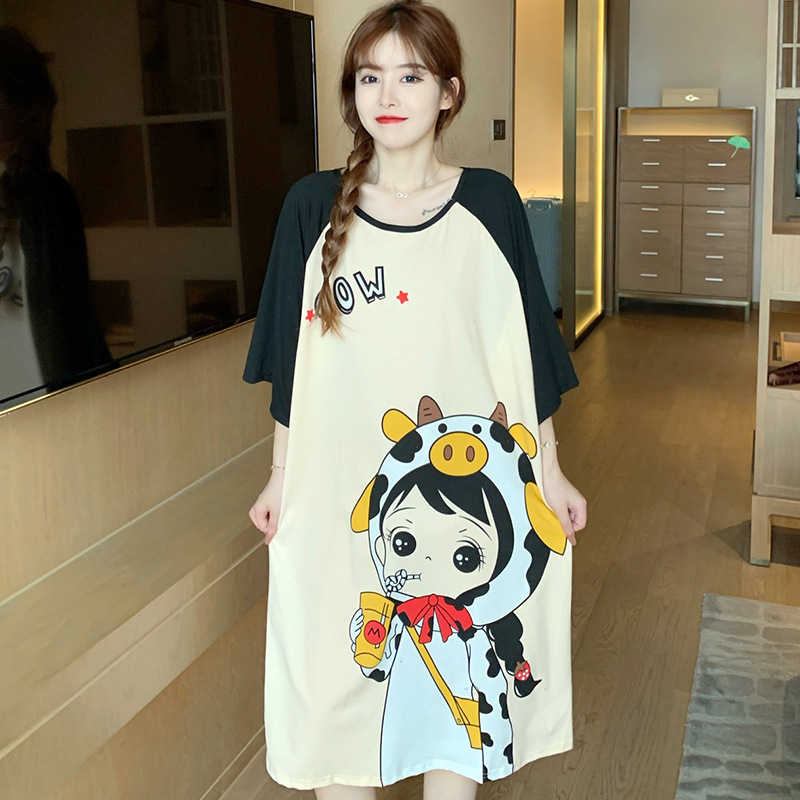 여성 여름 느슨한 소매 여름 플러스 사이즈 반팔 얇은 달콤한 중간 길이 잠옷 임산부는 홈 옷을 입을 수 있습니다