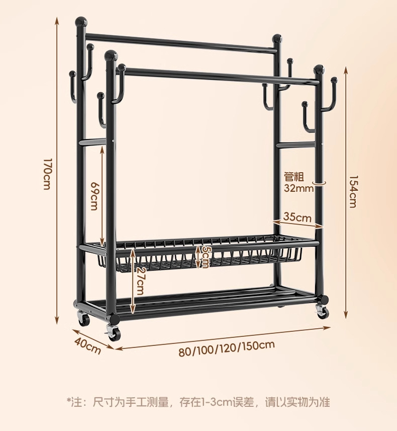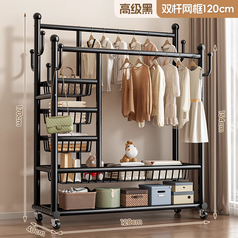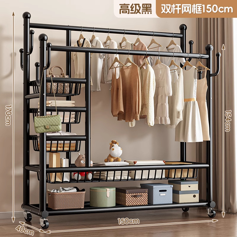 • [거대 두꺼운 32 튜브] 고급 검정색 150cm - 이중 행 걸이 막대 + 측면 3층 메쉬 프레임 + 메쉬 바구니 - 프리 메탈 휠 + 발