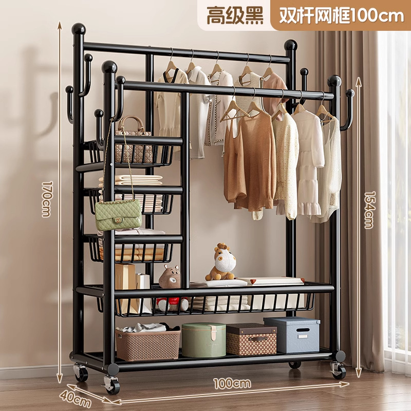• [거대 두꺼운 32 튜브] 고급 검정색 100cm - 이중 행 걸이 막대 + 측면 3층 메쉬 프레임 + 메쉬 바구니 - 프리 메탈 휠 + 발