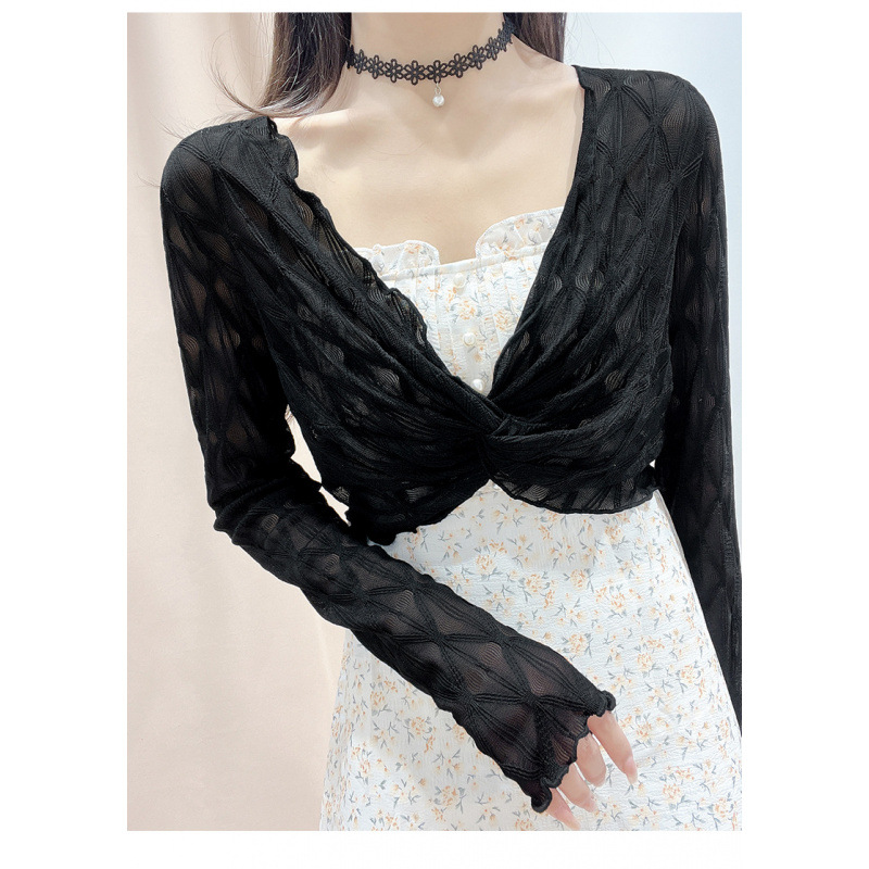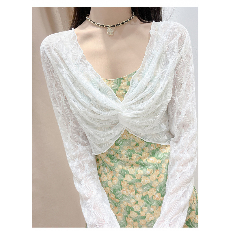여름 V 넥 레이스 목도리 새로운 여성의 짧은 메쉬 선 스크린 슬립 스커트 외부 긴 소매 얇은 풀오버 블라우스스토어 가기
