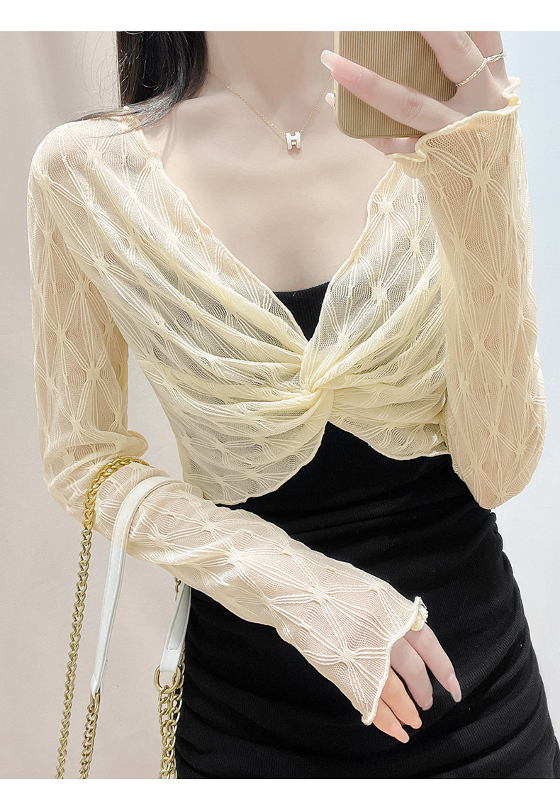 여름 V 넥 레이스 목도리 새로운 여성의 짧은 메쉬 선 스크린 슬립 스커트 외부 긴 소매 얇은 풀오버 블라우스