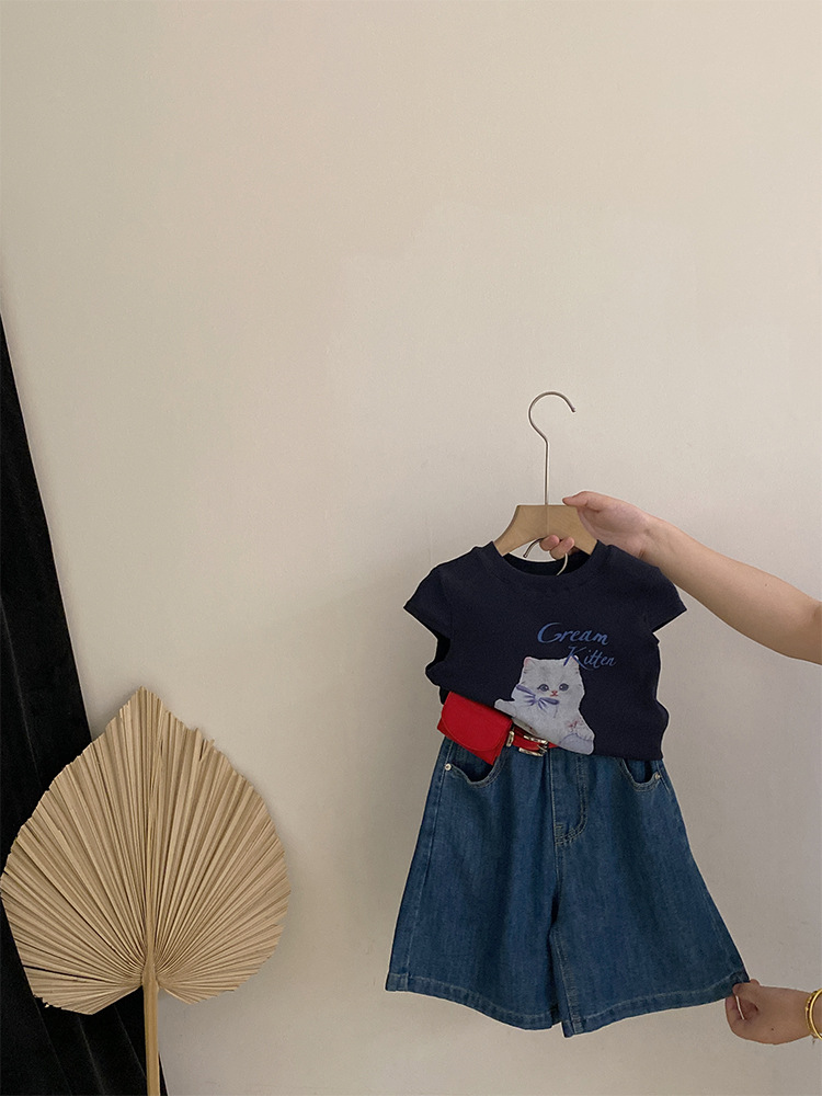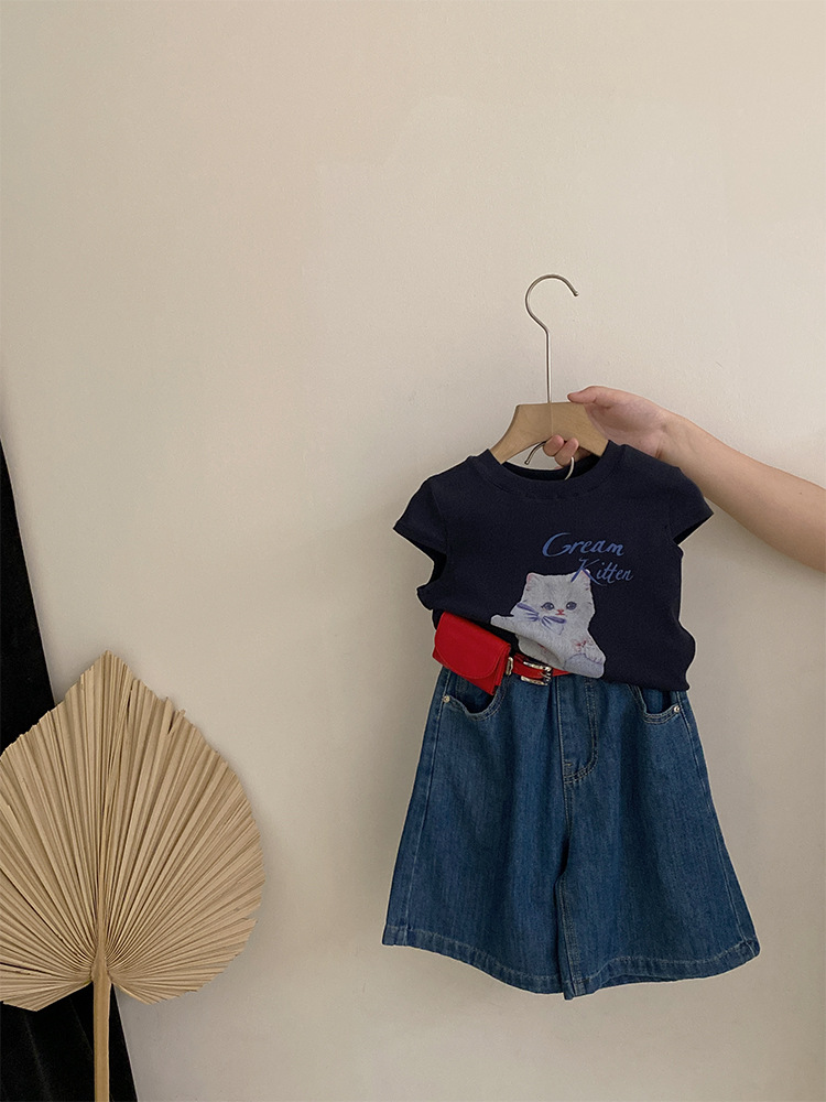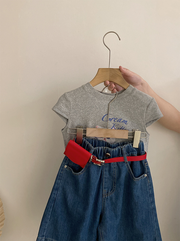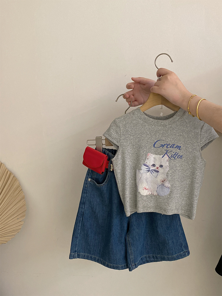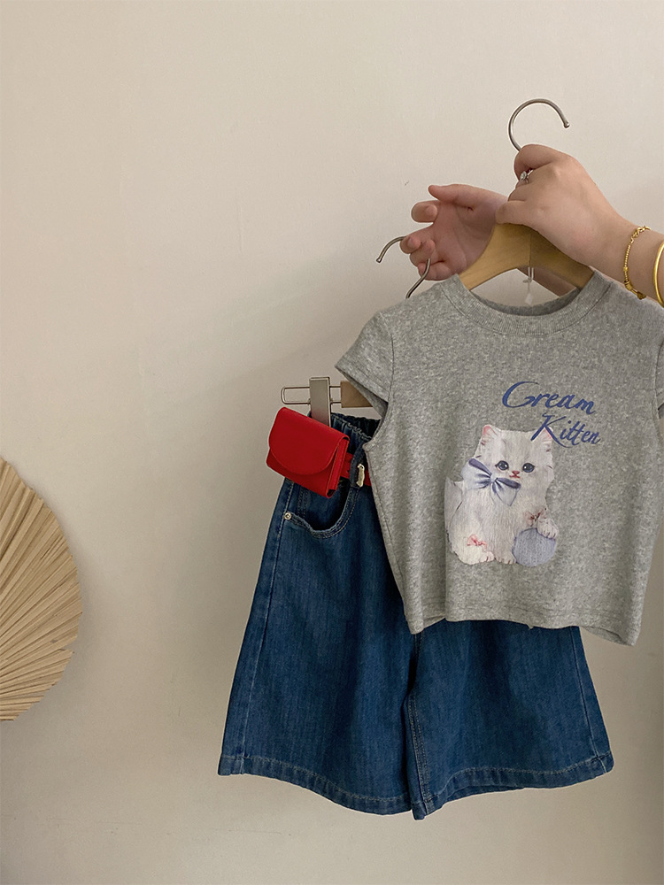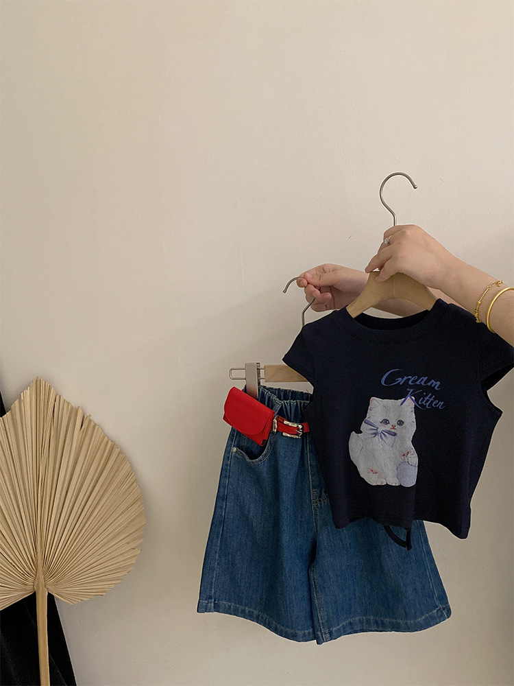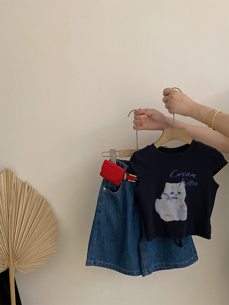 여자 여름 착용 세트 2025 새로운 스타일 중첩 어린이 반팔 티셔츠 걸스 여름 데님 바지 투피스 트렌디스토어 가기