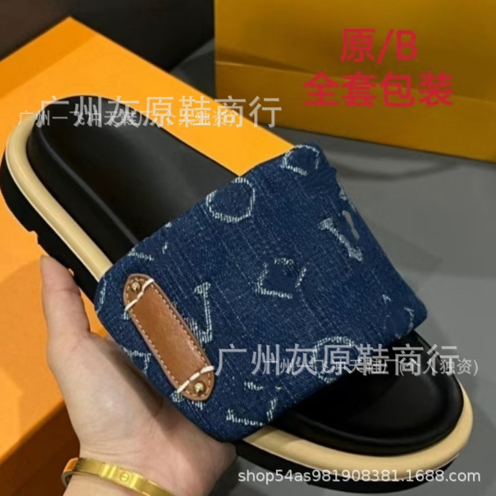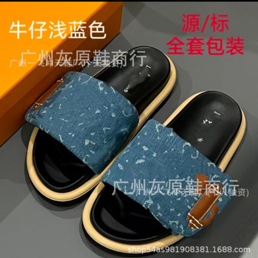 여성을위한 Donkeyjia 두꺼운 밑창 벨크로 슬리퍼 2024 새로운 겉옷 패션 미끄럼 방지 데님 문자 슬리퍼 대외 무역스토어 가기
