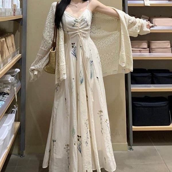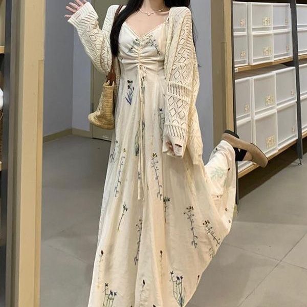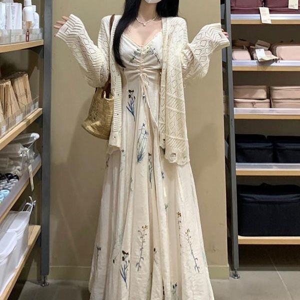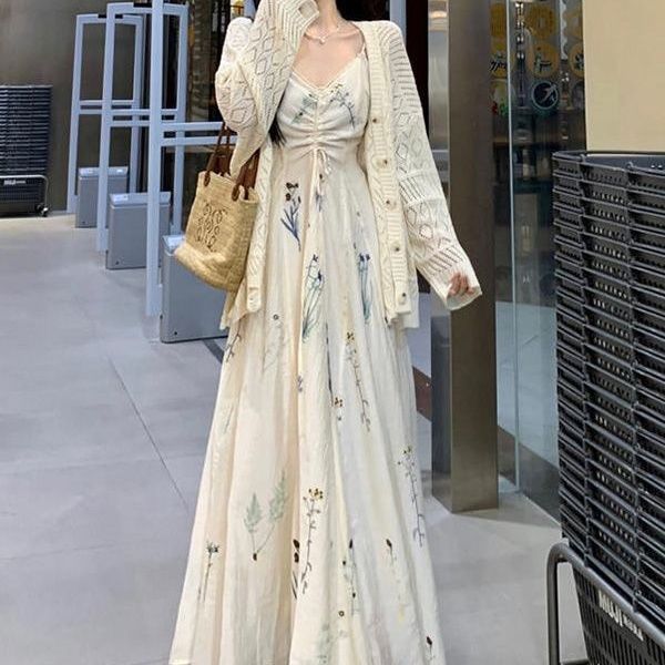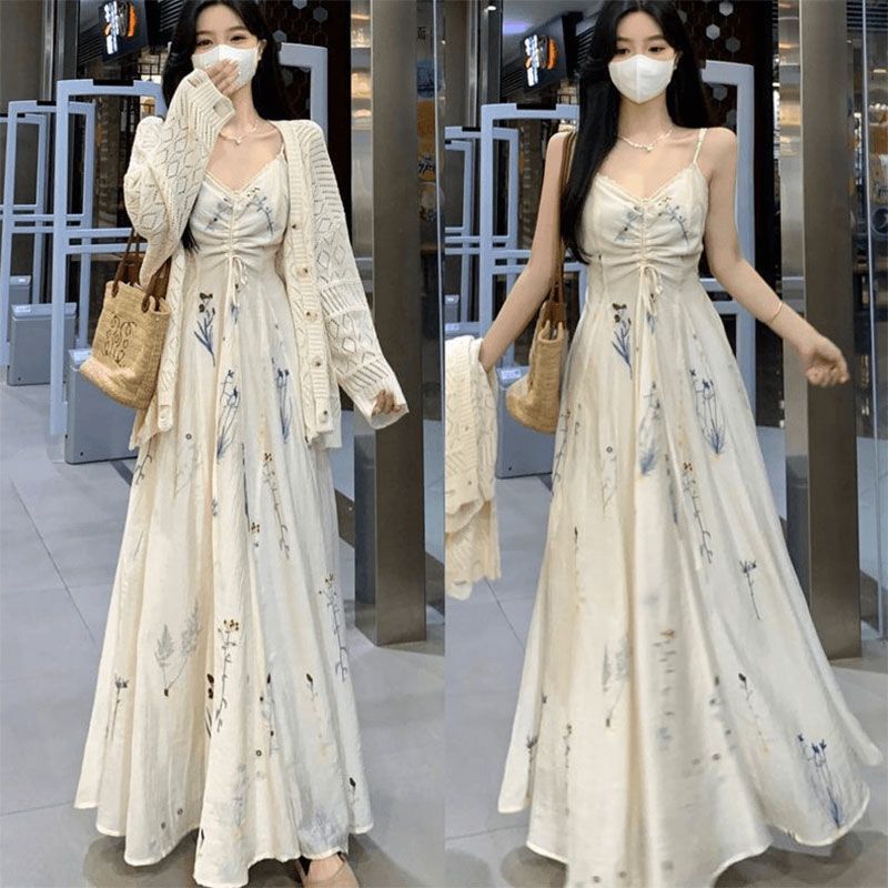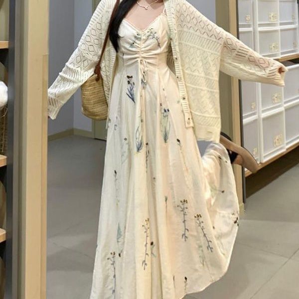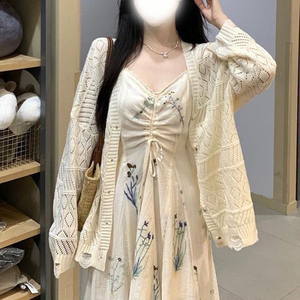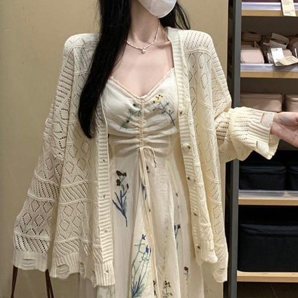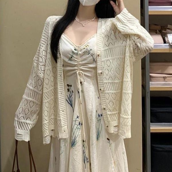 플러스 사이즈 프렌치 배 모양의 바디 드레스 여성 여름 복고풍 프린트 서스펜더 스커트 긴 소매 중공 카디건 투피스 세트