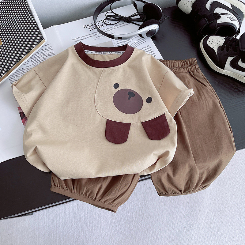 소년 여름 반팔 양복 2025 새로운 어린이 여름 스타일 투피스 세트 아기 만화 캐주얼 의류 유행스토어 가기
