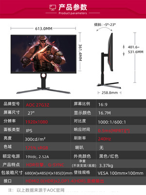 AOC 27G3Z 27인치 2K HD 240Hz IPS HD 게이밍 e스포츠 모니터 수직 회전스토어 가기