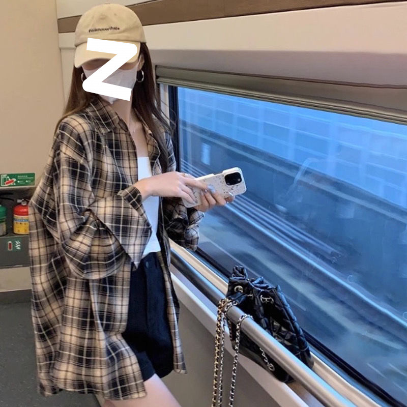 复古新款格子衬衫女内慵懒休闲遮肉衬衣外套宽松上衣显瘦防晒长袖