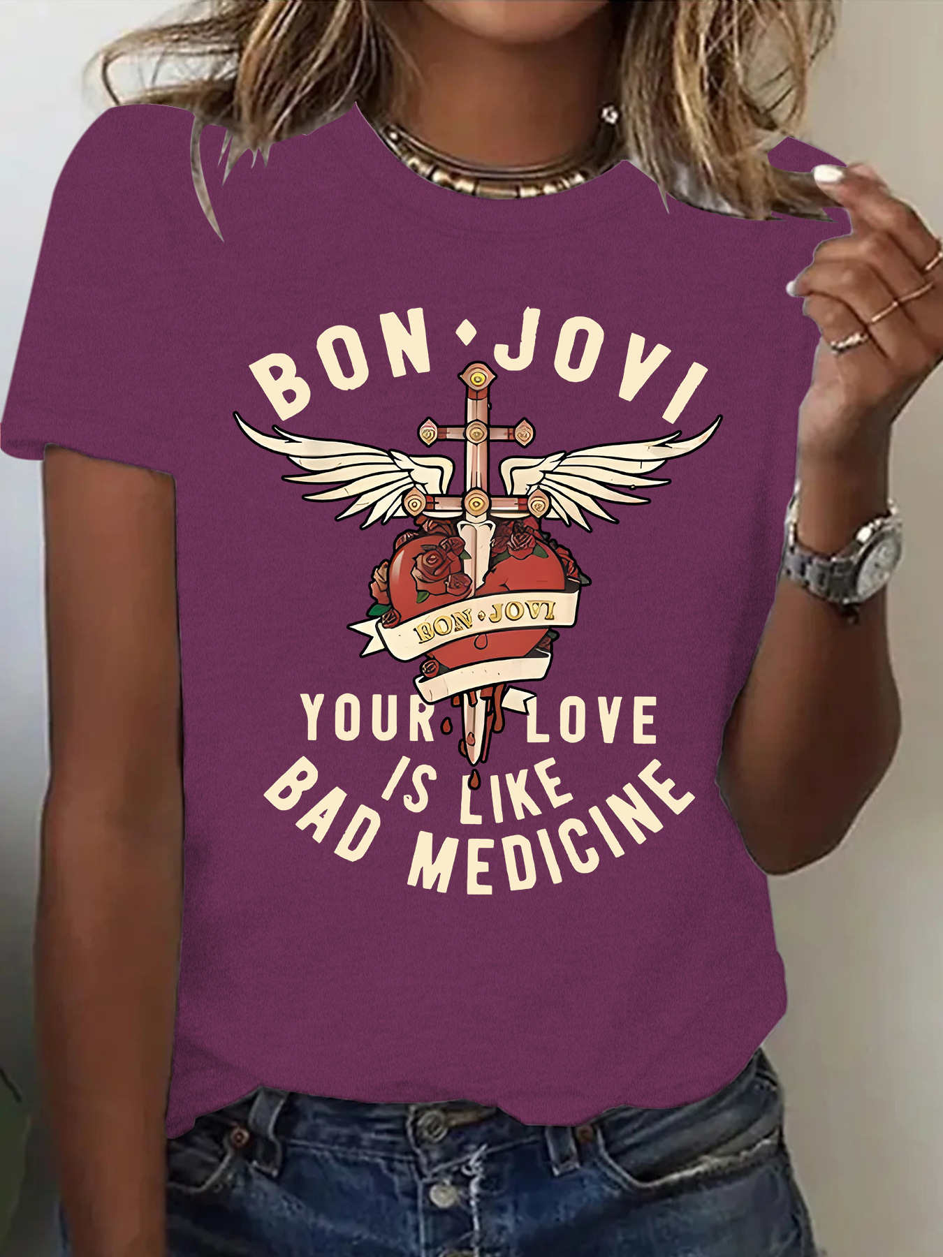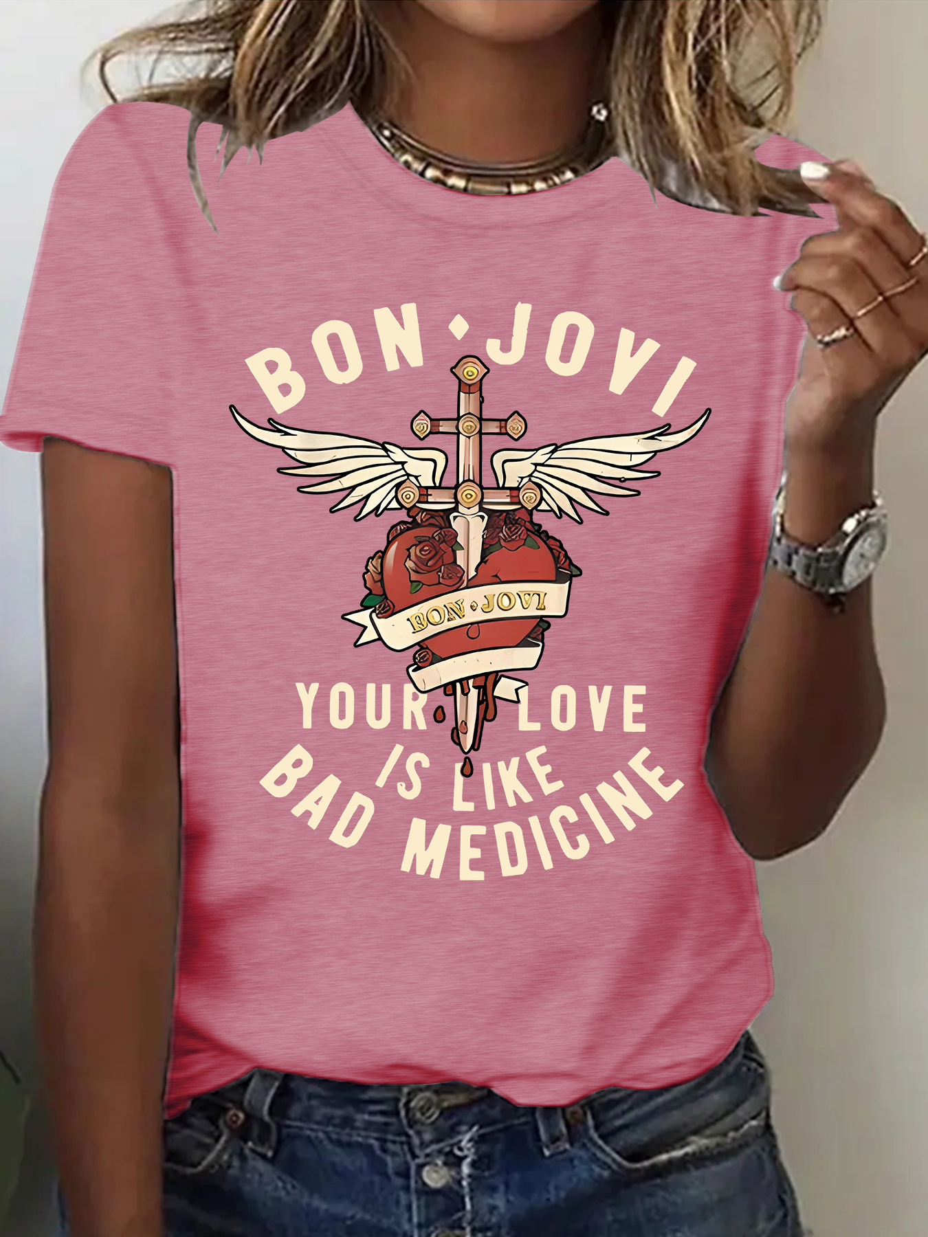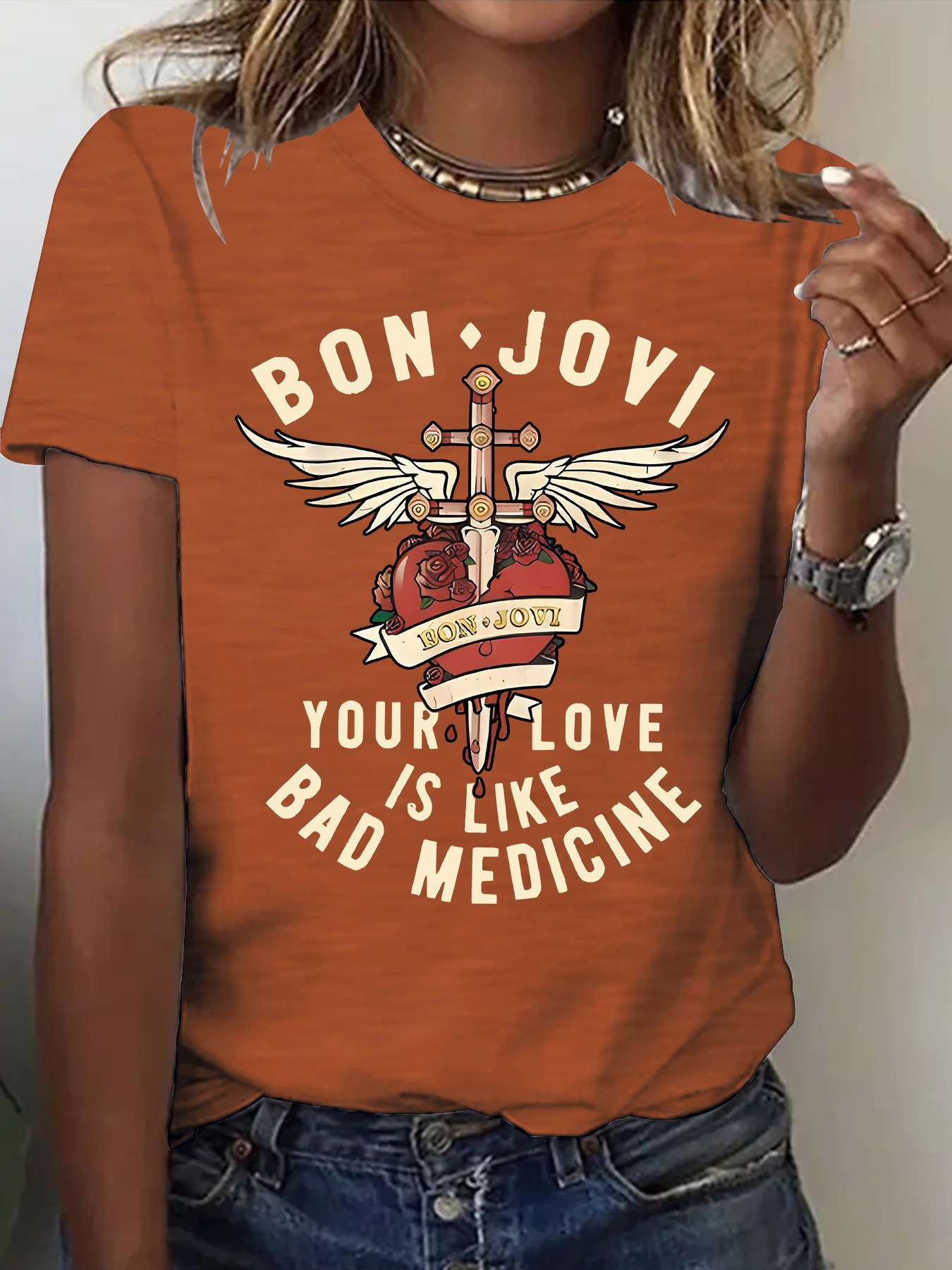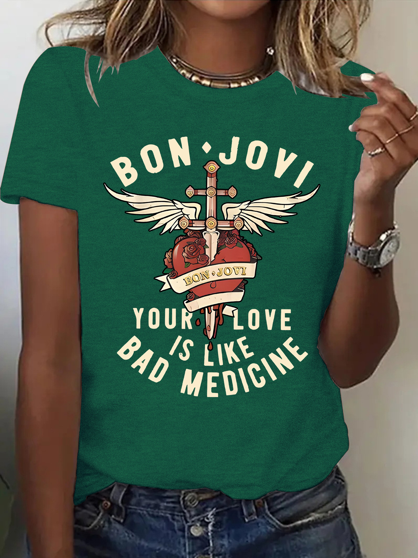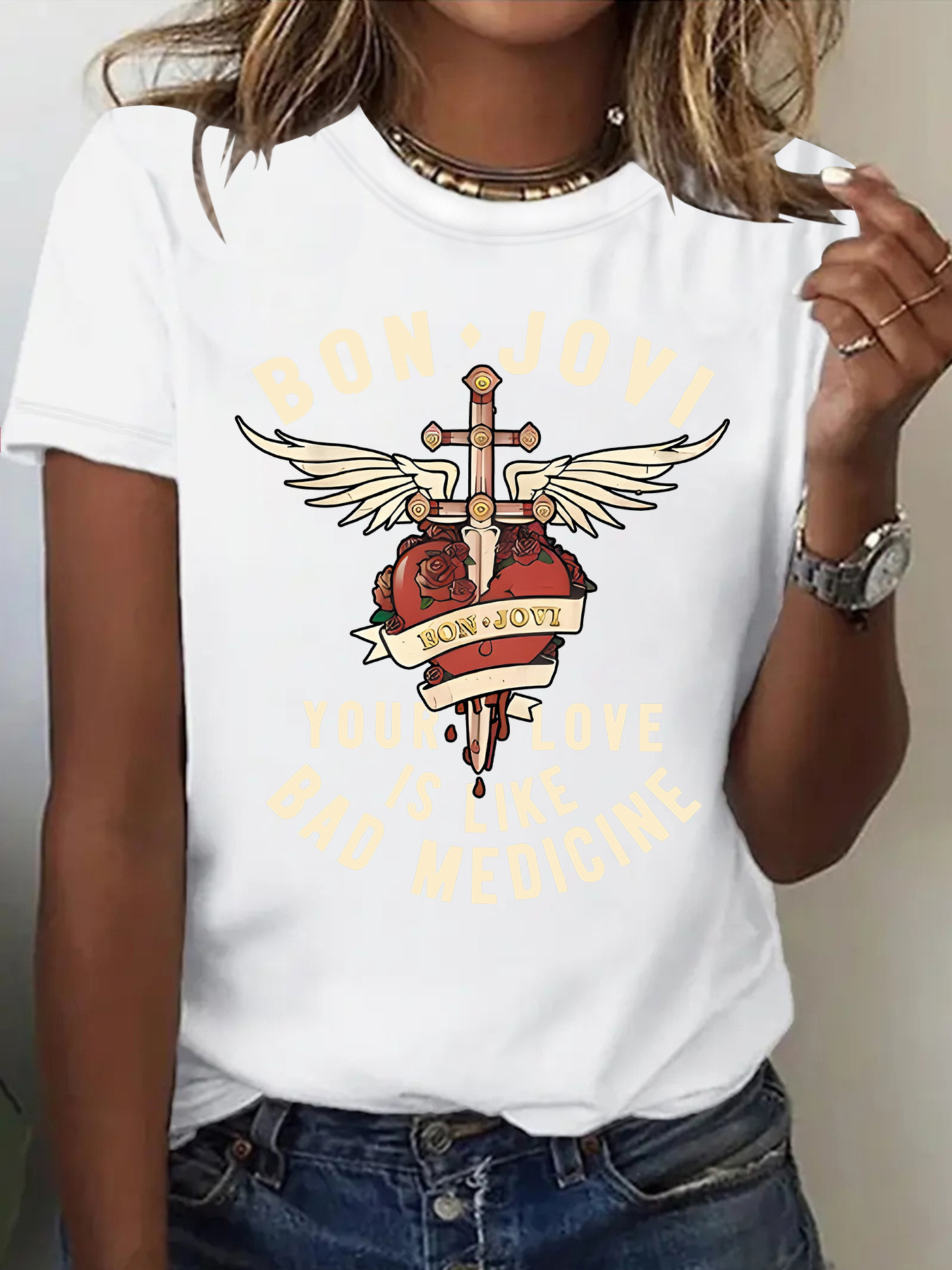Amazon eBay 새로운 패션 반팔 BON JOVI 밴드 여름 유럽과 미국 여성 티셔츠 여성상의 재고 있음스토어 가기