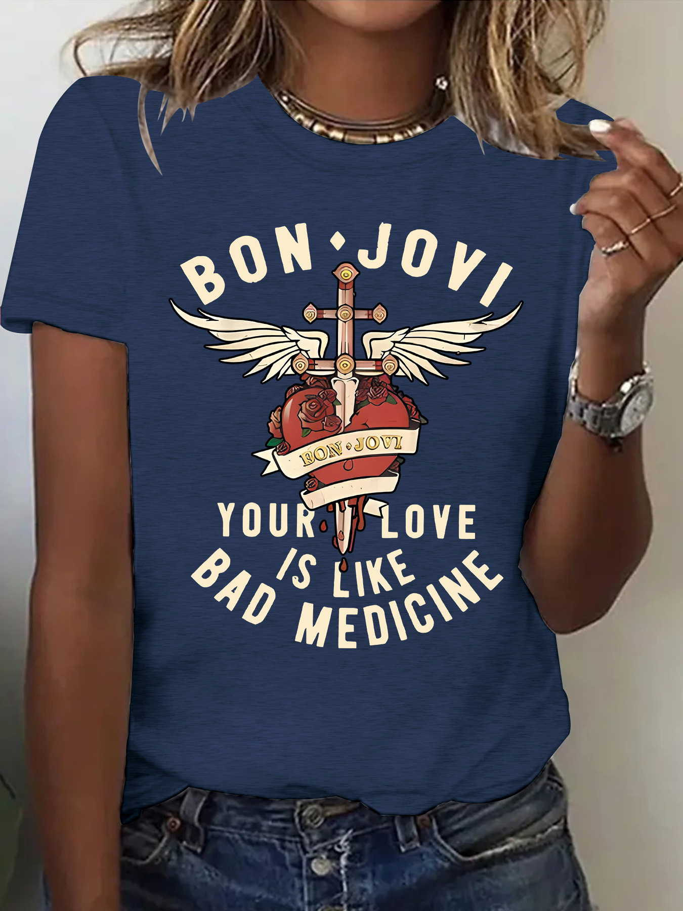 Amazon eBay 새로운 패션 반팔 BON JOVI 밴드 여름 유럽과 미국 여성 티셔츠 여성상의 재고 있음