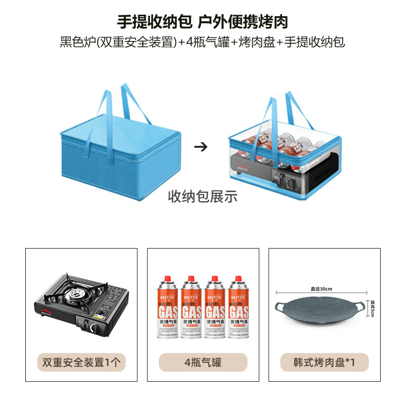 • [캠핑 휴대용 바비큐 모델] 이중 안전장치 블랙 스토브 + 가스탱크 4개 + 바비큐 플레이트 + 휴대용 수납가방