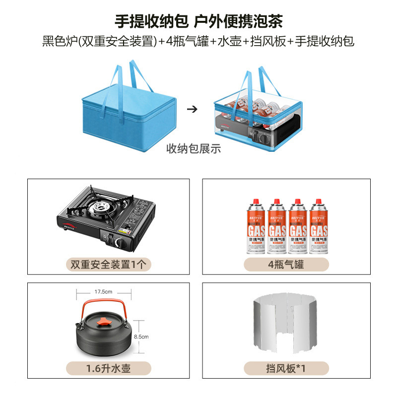 • [캠핑 휴대용 차 만들기 모델] 이중 안전 장치 블랙 스토브 + 가스 탱크 4개 + 1.6L 주전자 + 앞 유리 + 휴대용 보관 가방