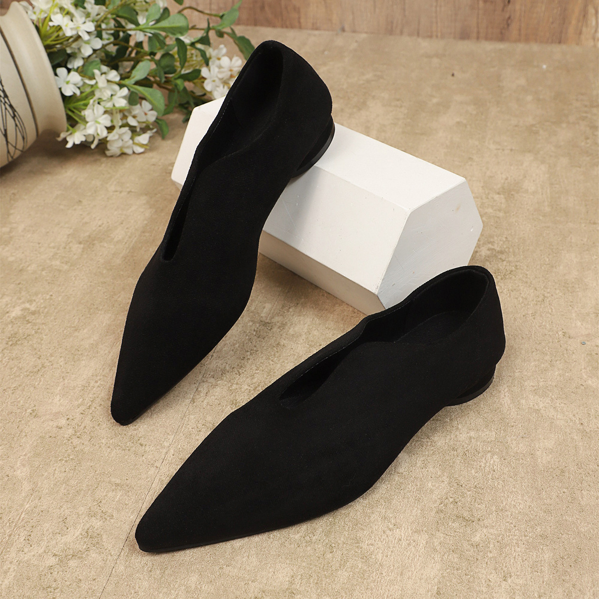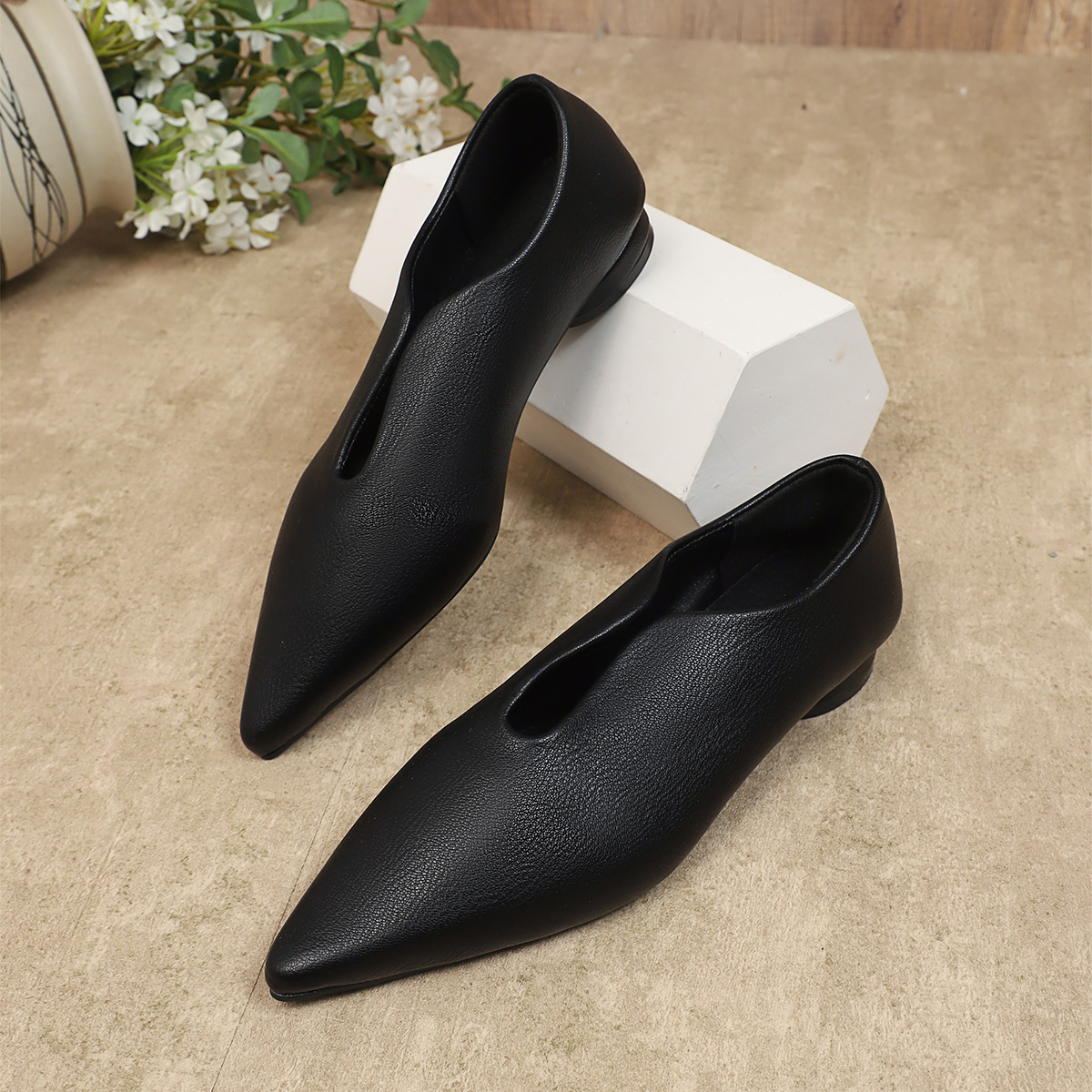여성용 대형 대외 무역 포인티드 슈즈 2025 복고풍 기질 V 입 슬립 온 로우 탑 소형 가죽 신발 로우 힐 대형 신발스토어 가기