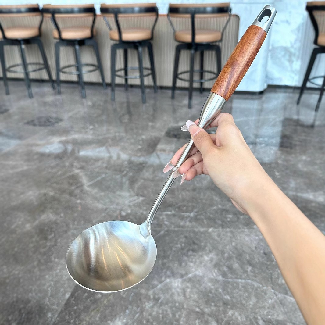 도매 304 스테인레스 스틸 가정용 주방 로즈 우드 주걱 요리 용 긴 손잡이 수프 스푼 주걱 고온 방지 화상 방지 주걱스토어 가기