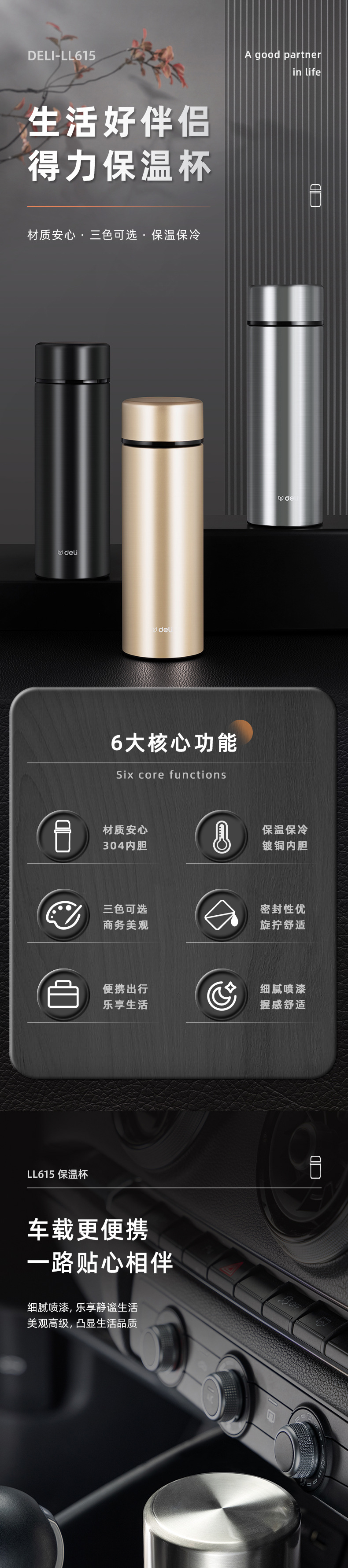 델리 LL615 비즈니스 보온병 컵 500ML 대용량 304 라이너 홈 오피스 자동차 보온 및 냉각 컵스토어 가기