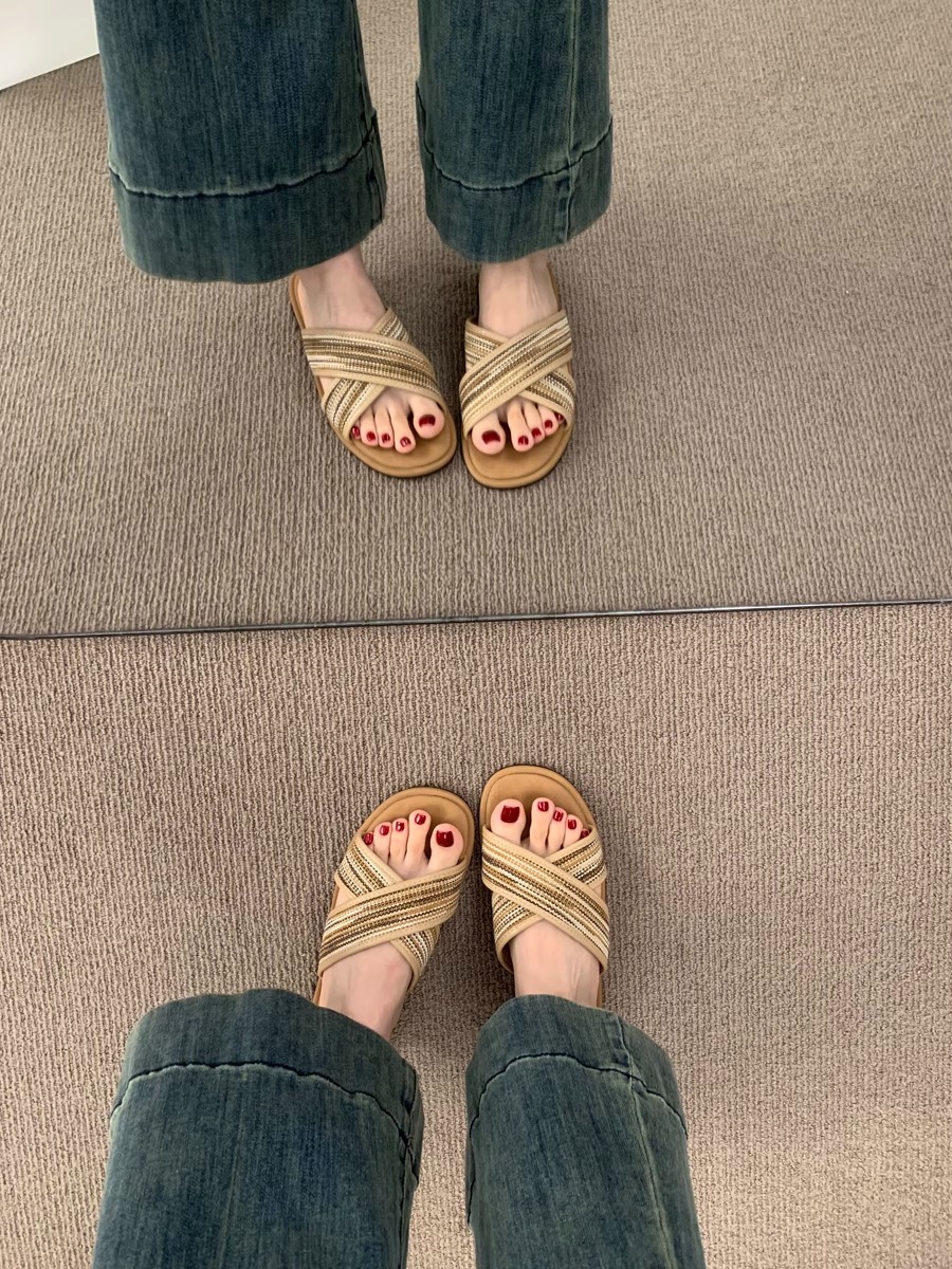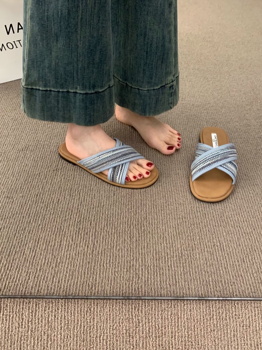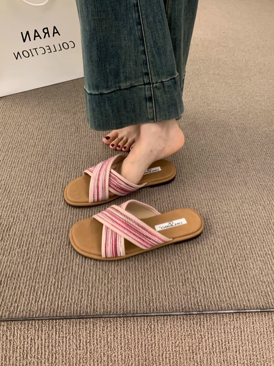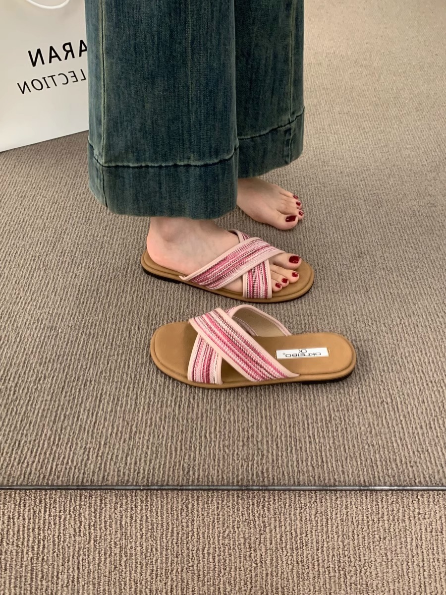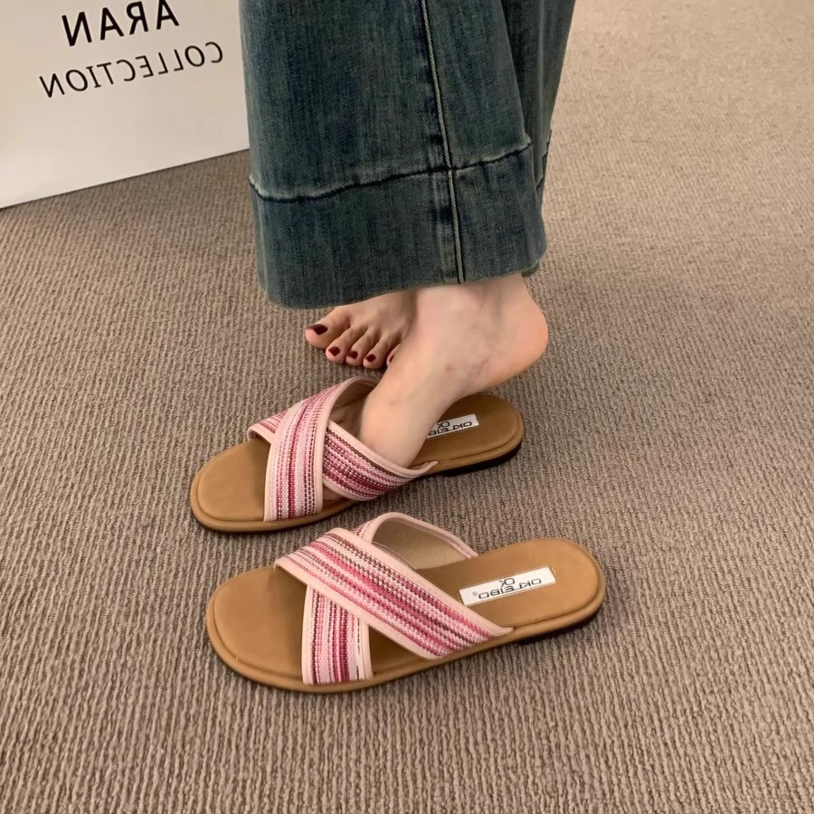 캘리포니아 비치~여성용 휴가용 우븐 컬러 블록 크로스 스트랩 샌들, 여성용 아우터용 부드러운 밑창의 다용도 비치 슬리퍼스토어 가기