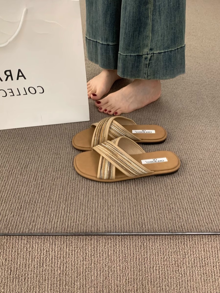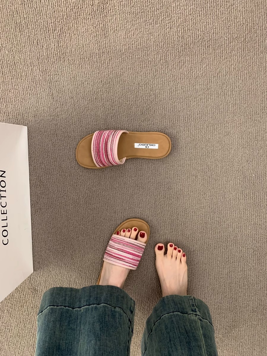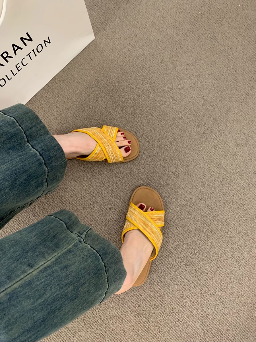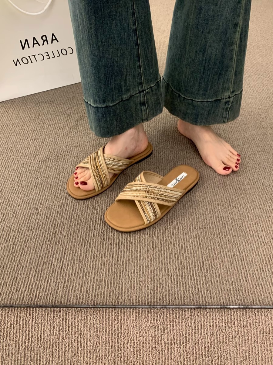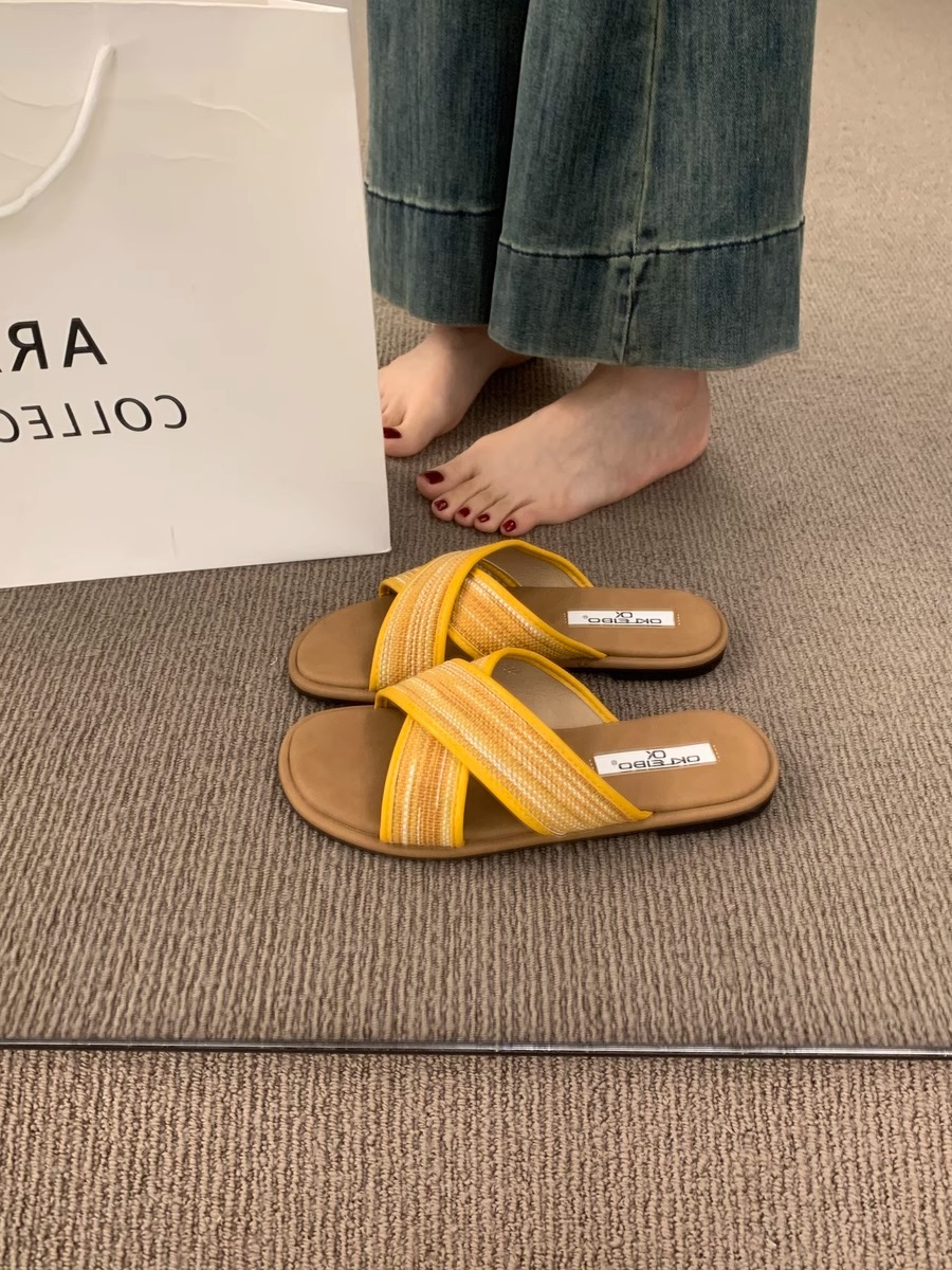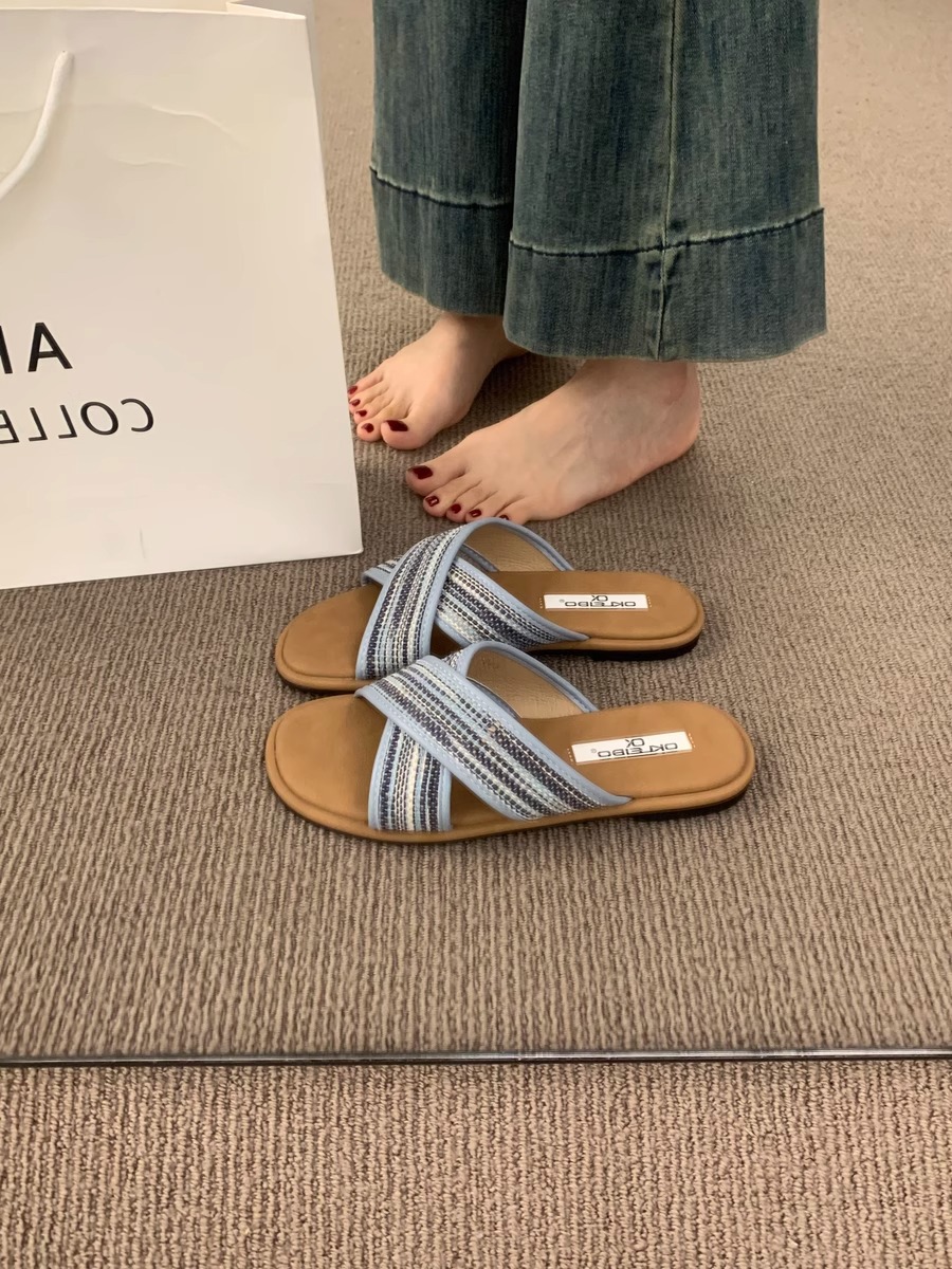 캘리포니아 비치~여성용 휴가용 우븐 컬러 블록 크로스 스트랩 샌들, 여성용 아우터용 부드러운 밑창의 다용도 비치 슬리퍼스토어 가기
