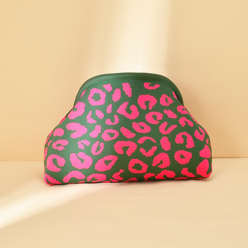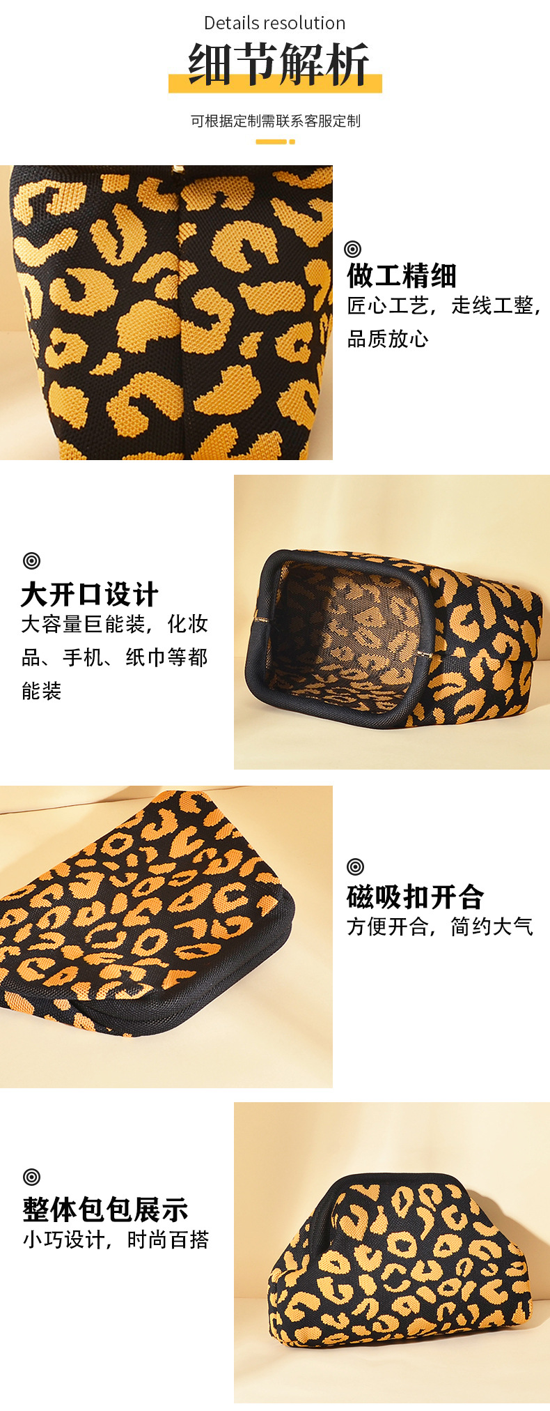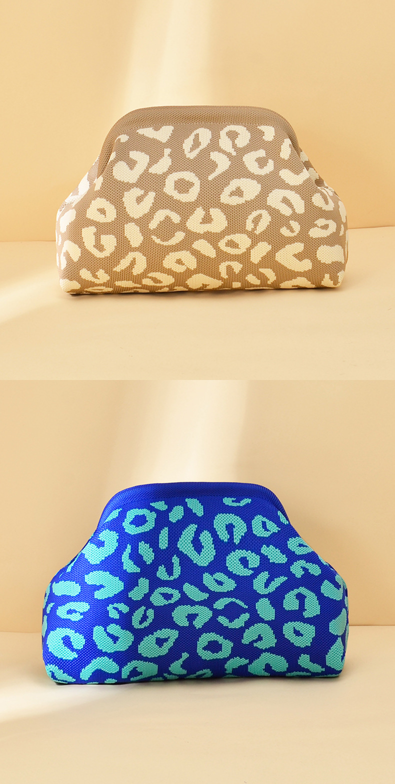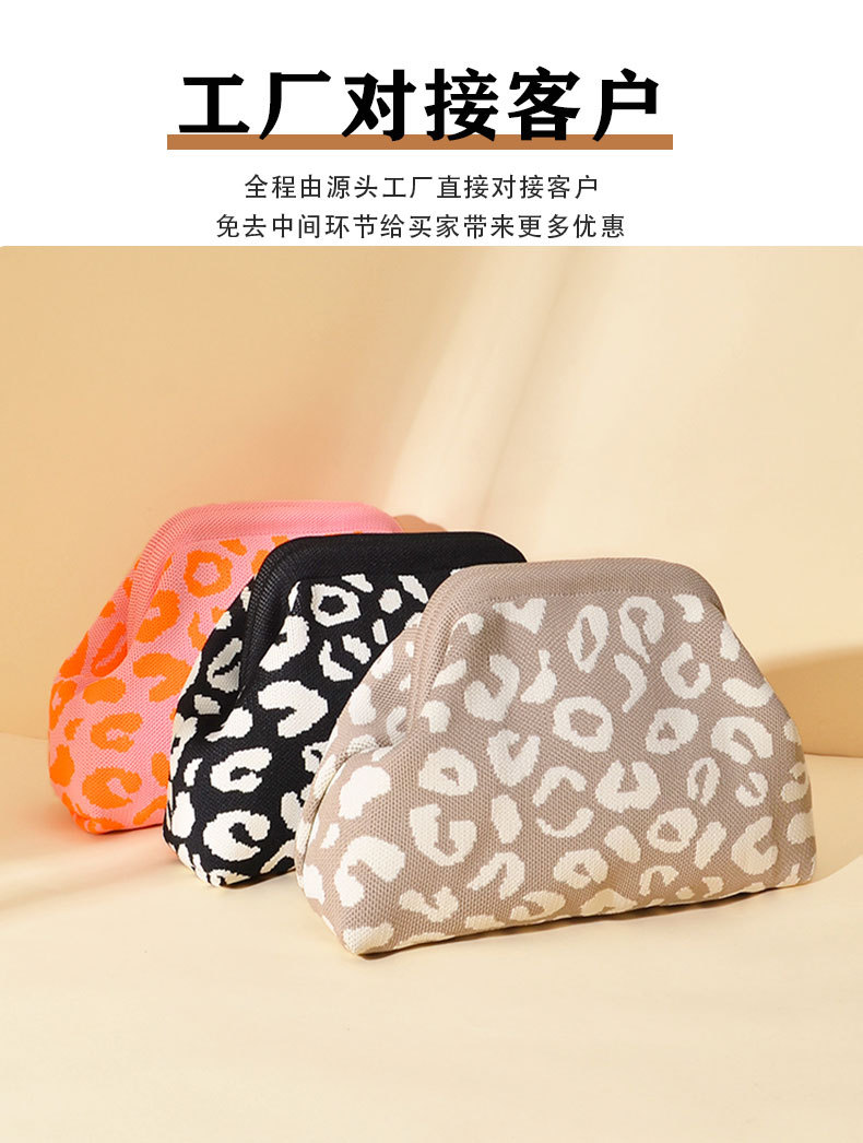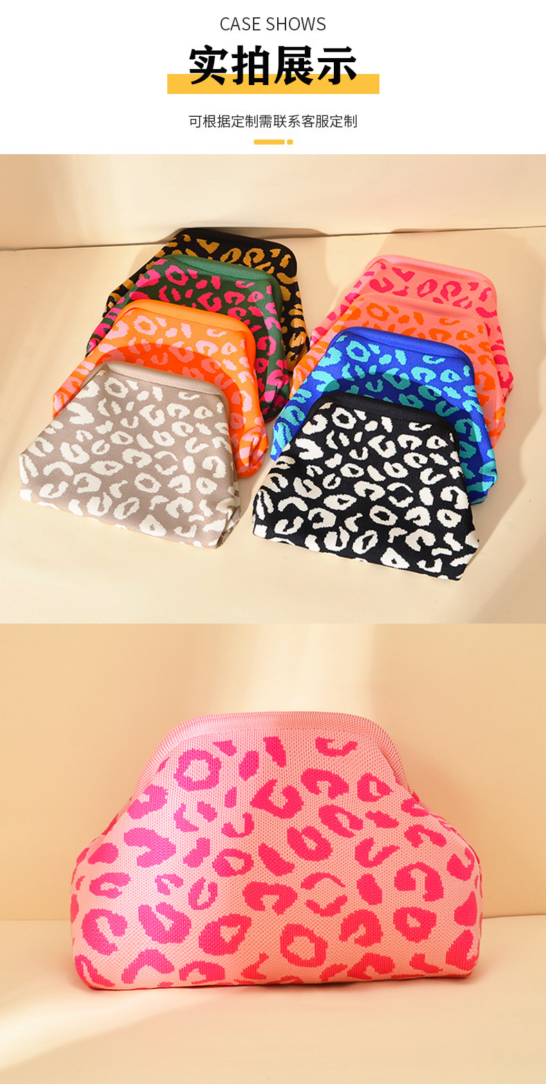 국경을 넘는 인기 레오파드 프린트 클러치백, 고급스러운 배색 니트 클립백, 대용량 패셔너블하고 다용도로 활용 가능한 화장품 가방