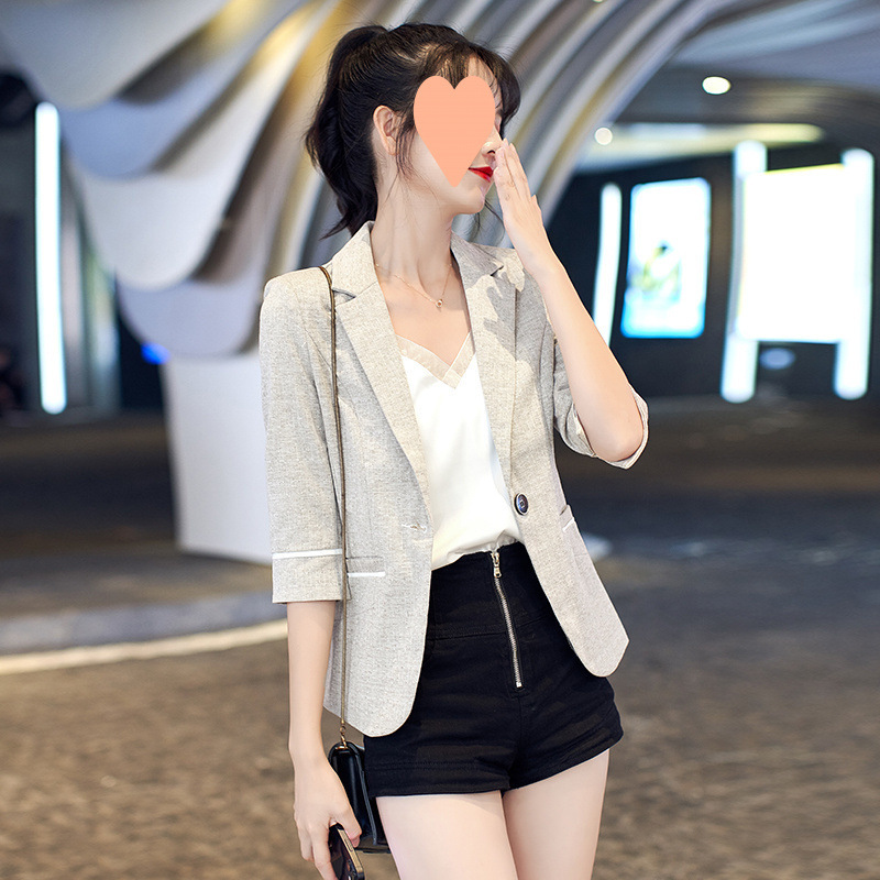 여성을위한 중간 소매 검은 정장 재킷 여름 얇은 2023 새로운 슬림 피트 짧은 작은 정장 탑스토어 가기
