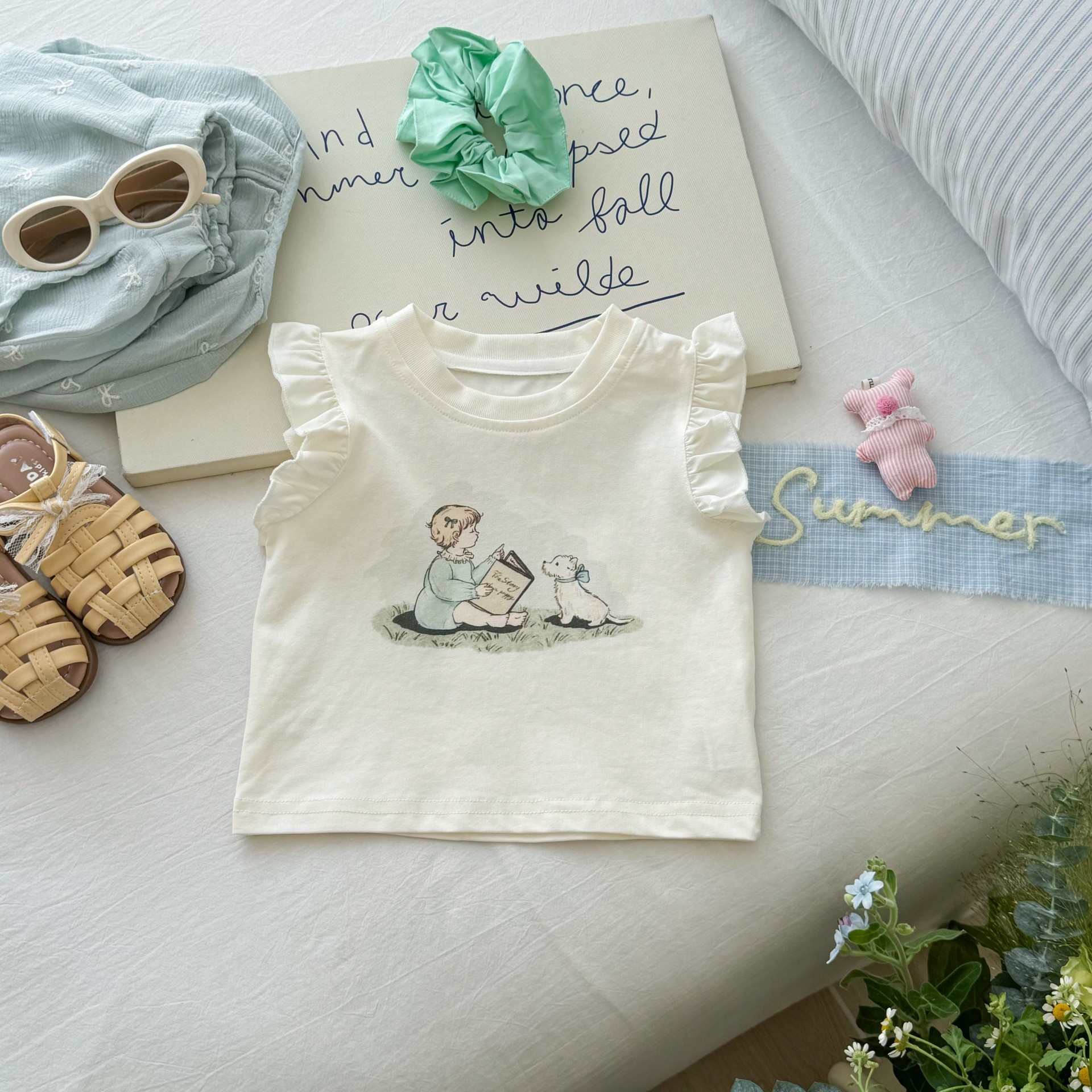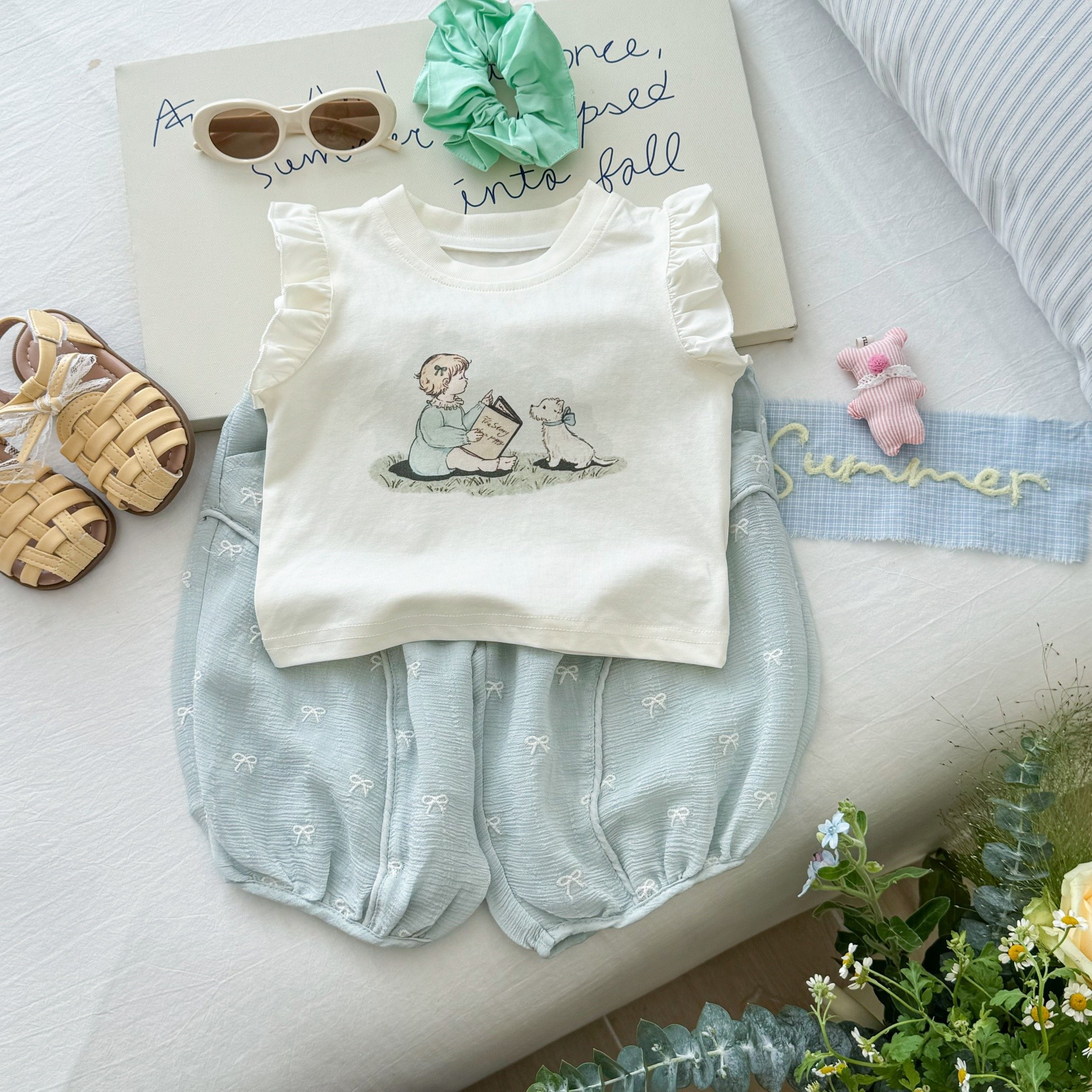 닝리 소녀 2025 새로운 편안한 귀여운 비행 소매 티셔츠 아기 소녀 활 블루머 투피스 세트스토어 가기