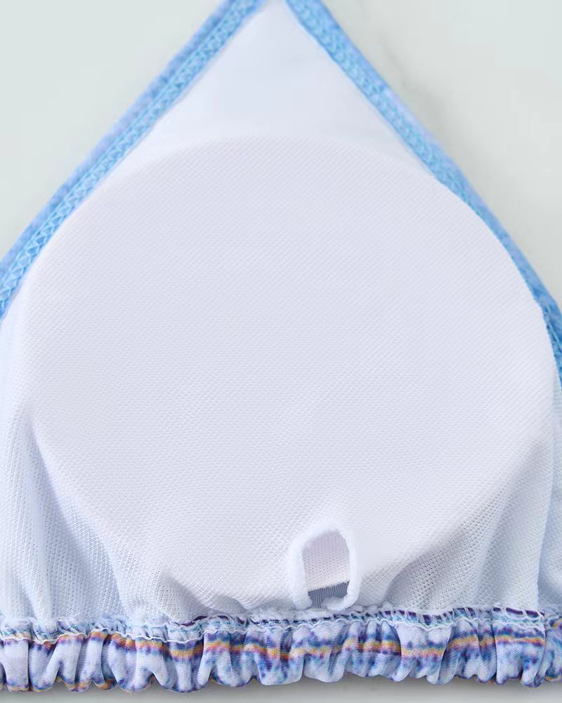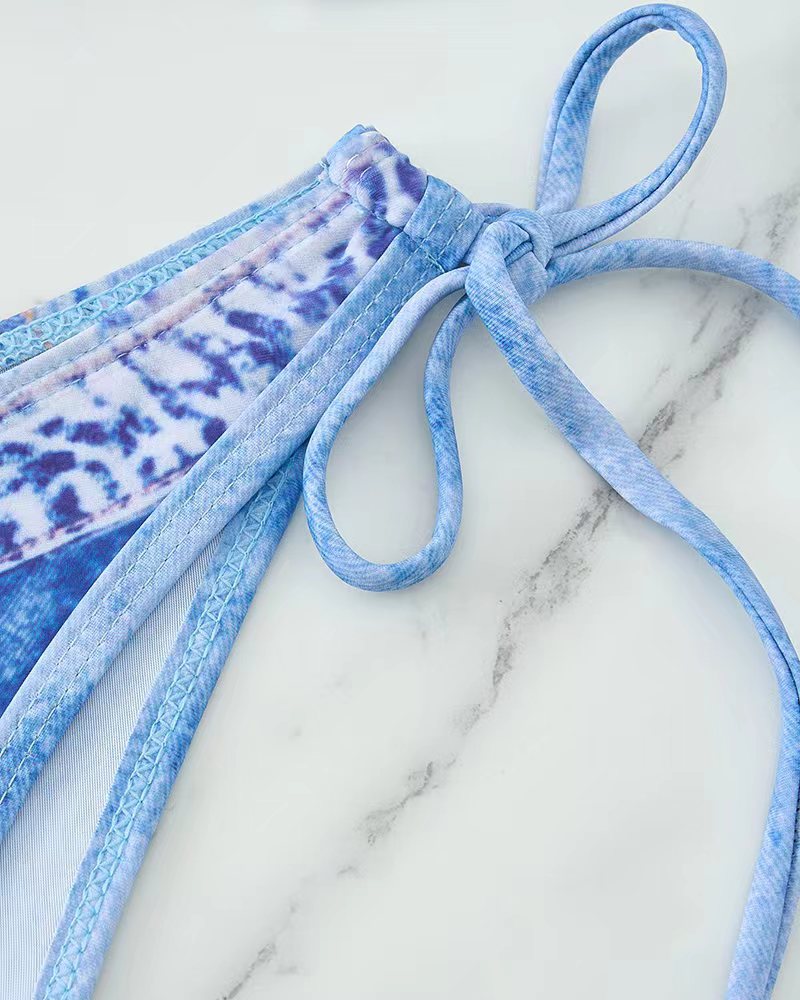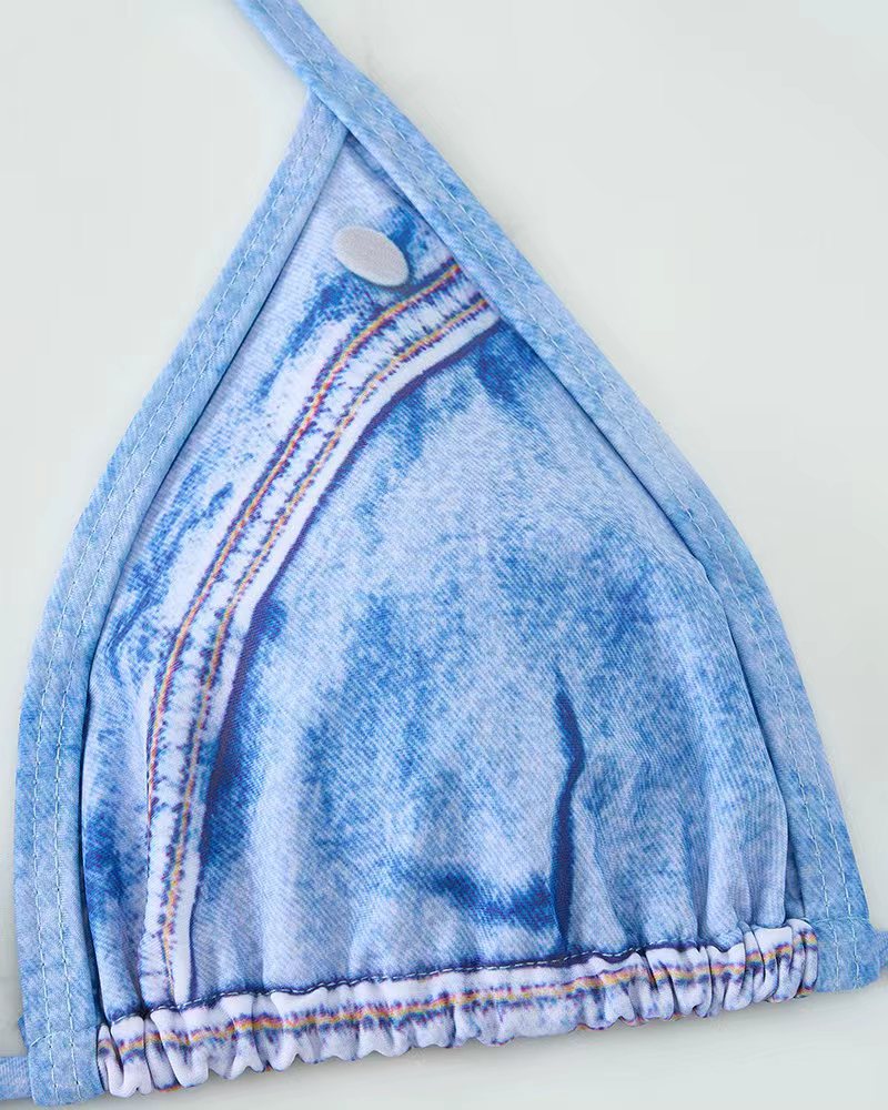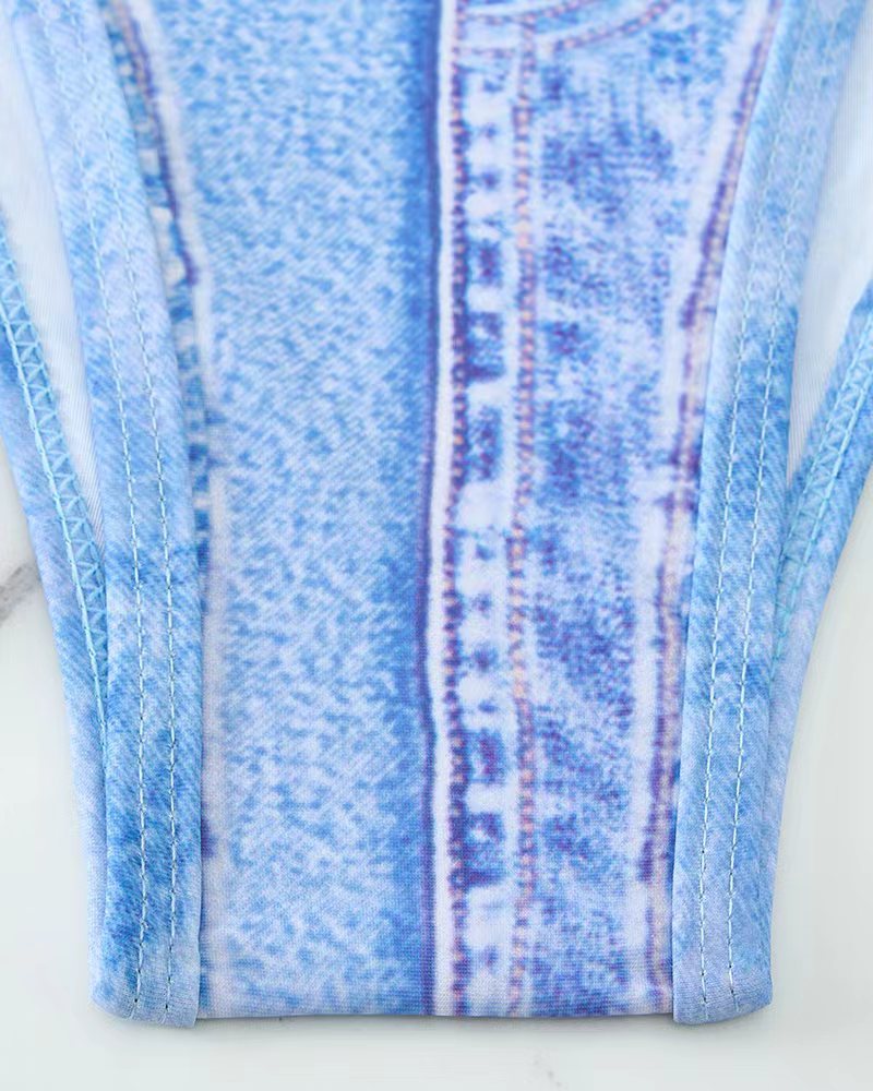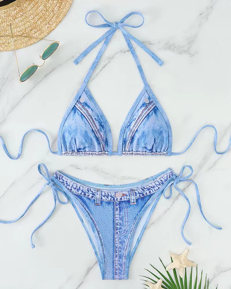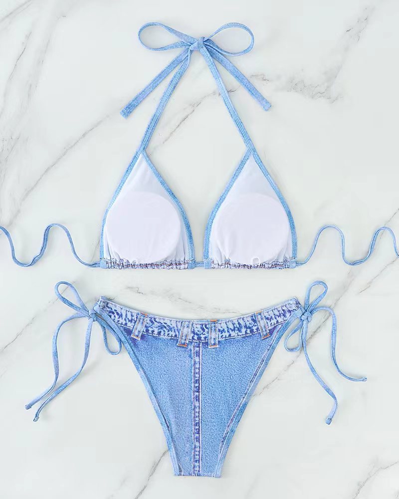 2025 유럽과 미국의 섹시한 모조 데님 여성 비키니 스플릿 수영복 백리스 홀터넥 스트랩 패션 수영복 새로운 스타일