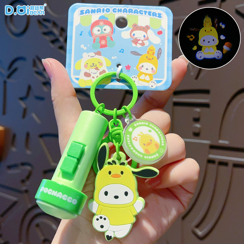 정품 Sanrio 프로젝션 작은 손전등 키 체인 크리 에이 티브 감압 작은 장난감 가방 작은 펜던트 자동차 열쇠 고리