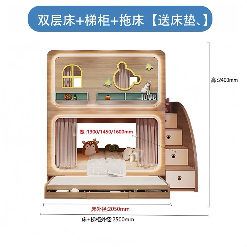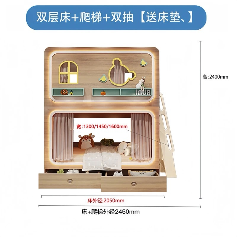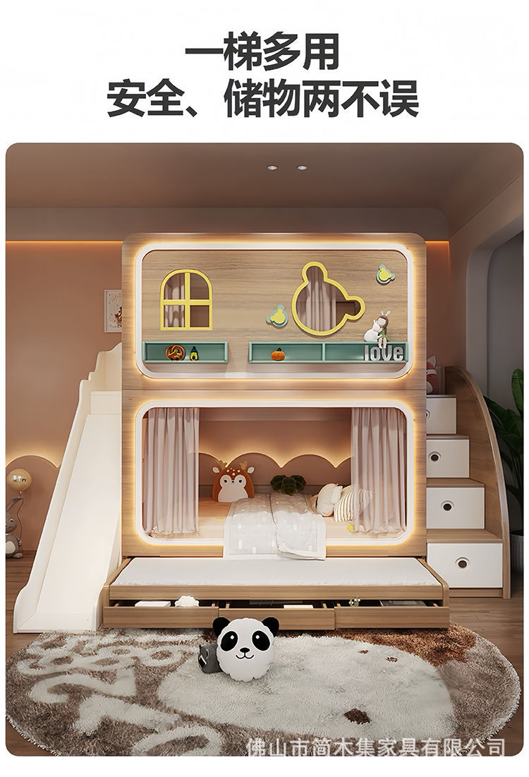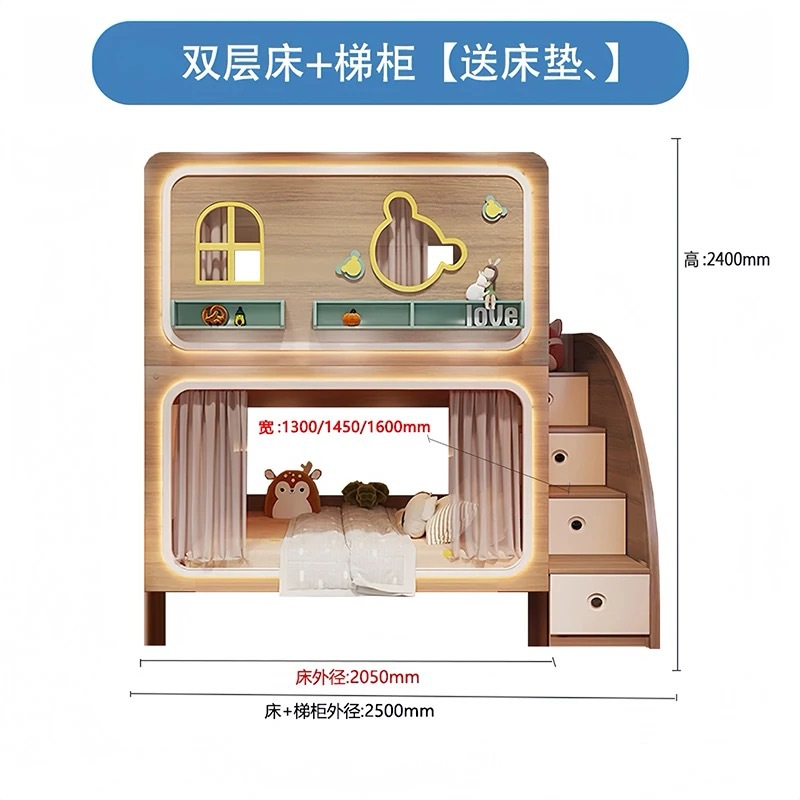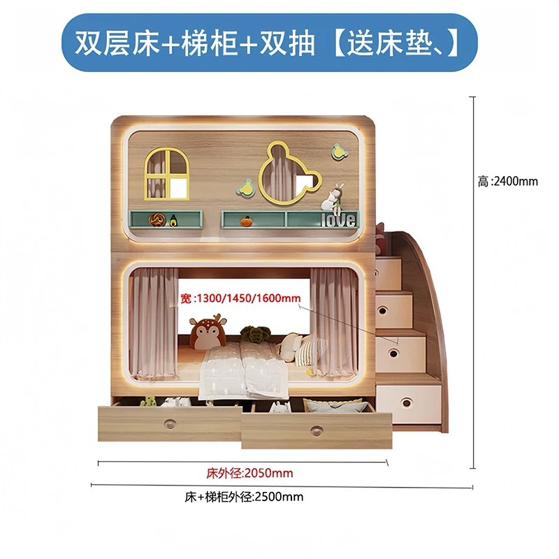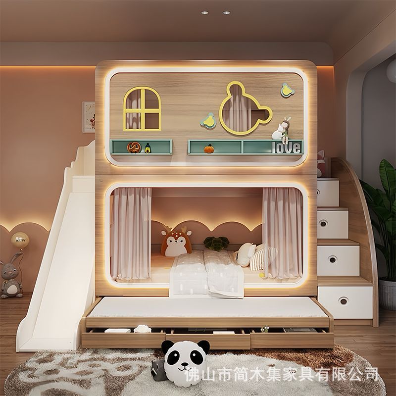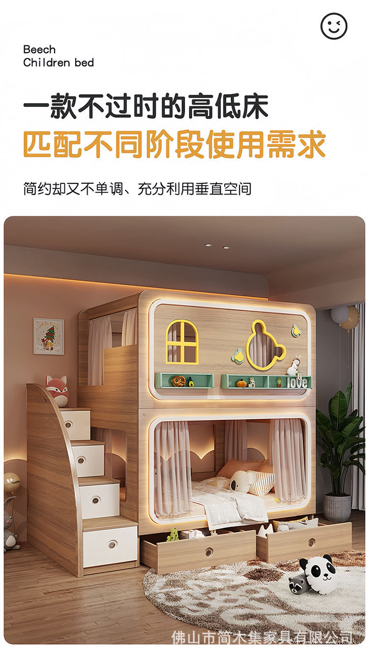 나무색 어린이 이층침대, 높낮이침대, 사다리가 있는 심플하고 모던한 캐비닛, 어머니침대 슬라이드, 이층침대 조합침대