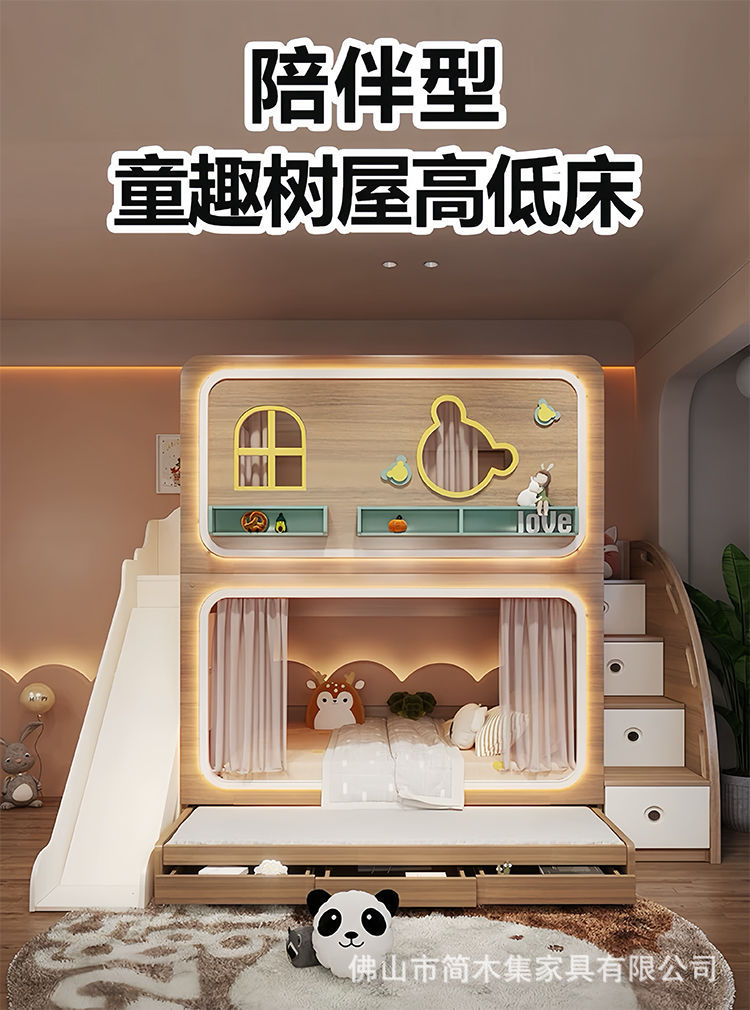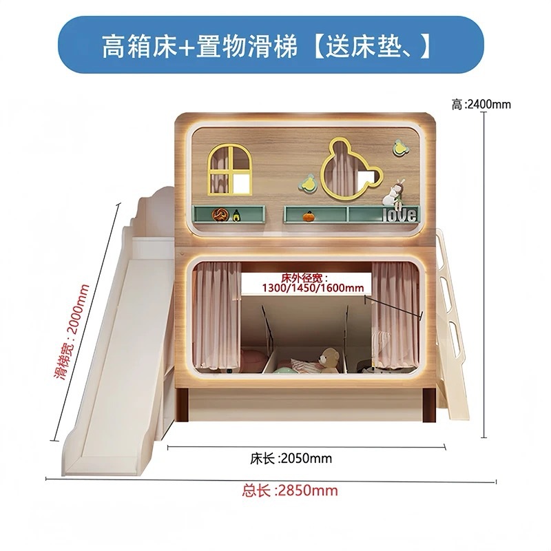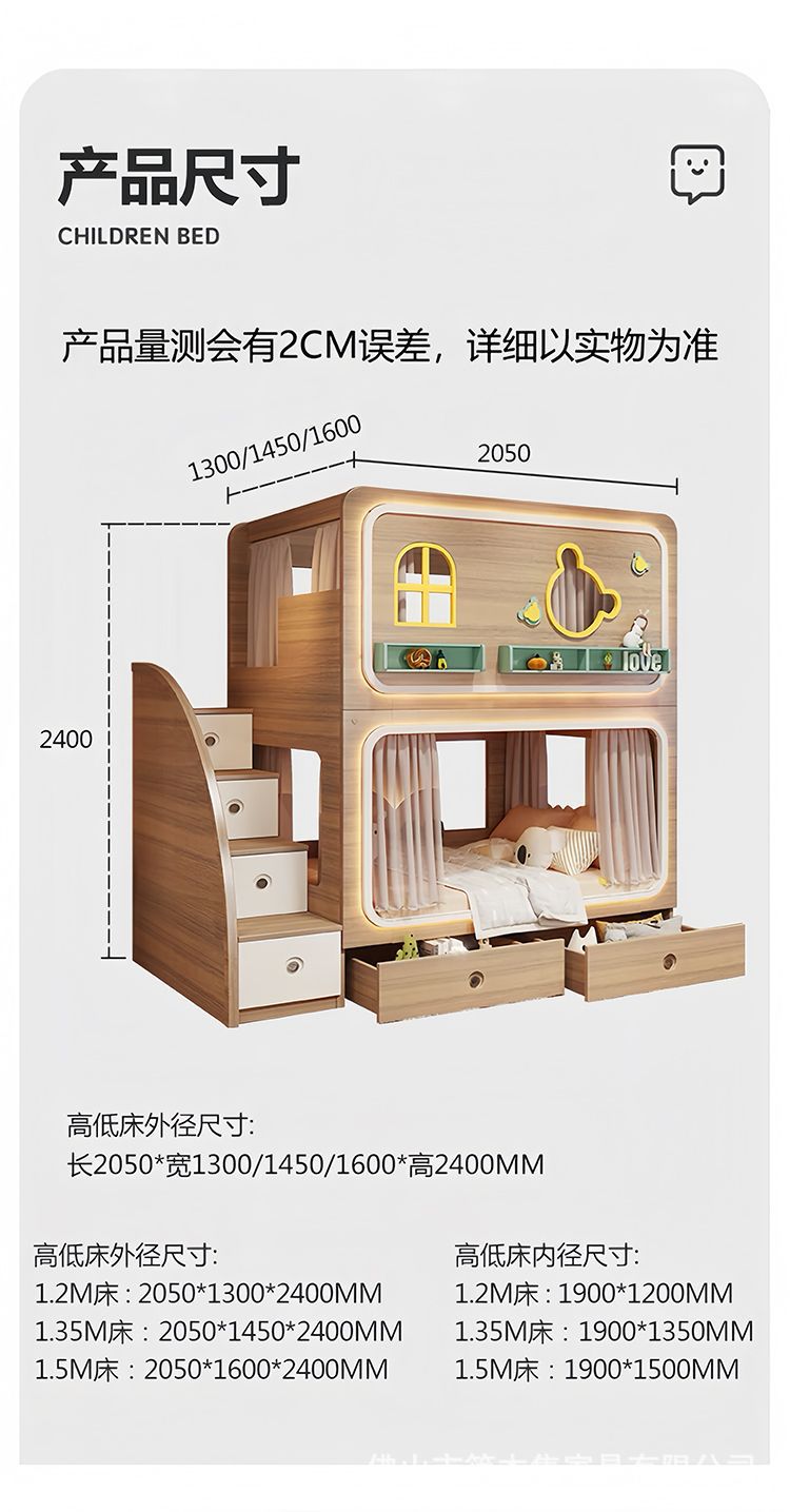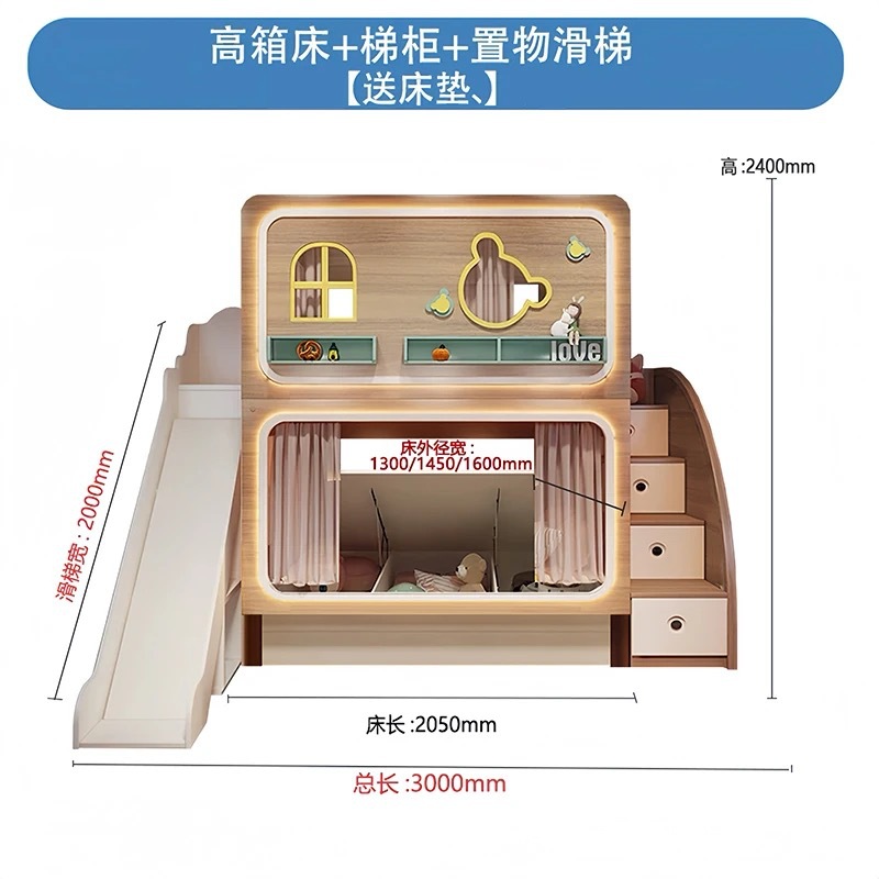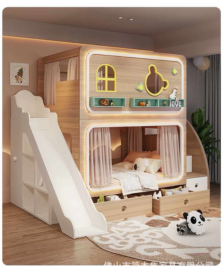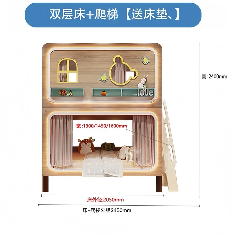 나무색 어린이 이층침대, 높낮이침대, 사다리가 있는 심플하고 모던한 캐비닛, 어머니침대 슬라이드, 이층침대 조합침대