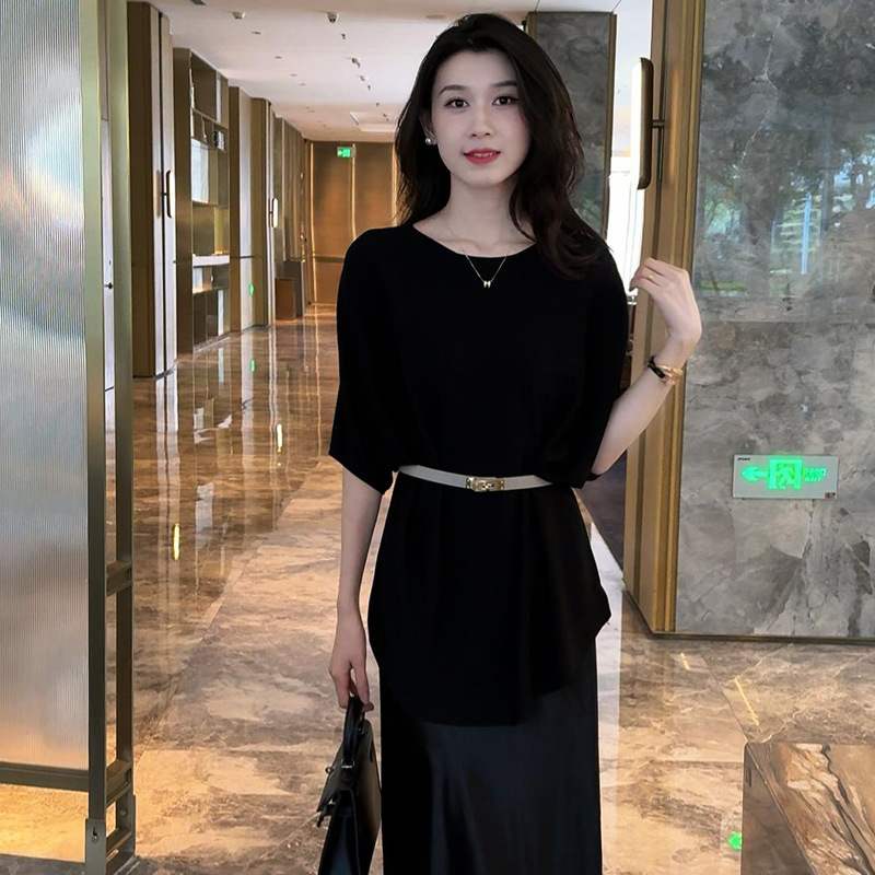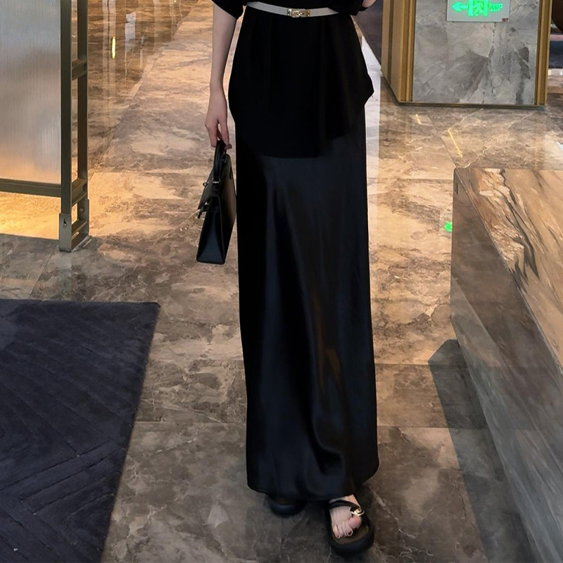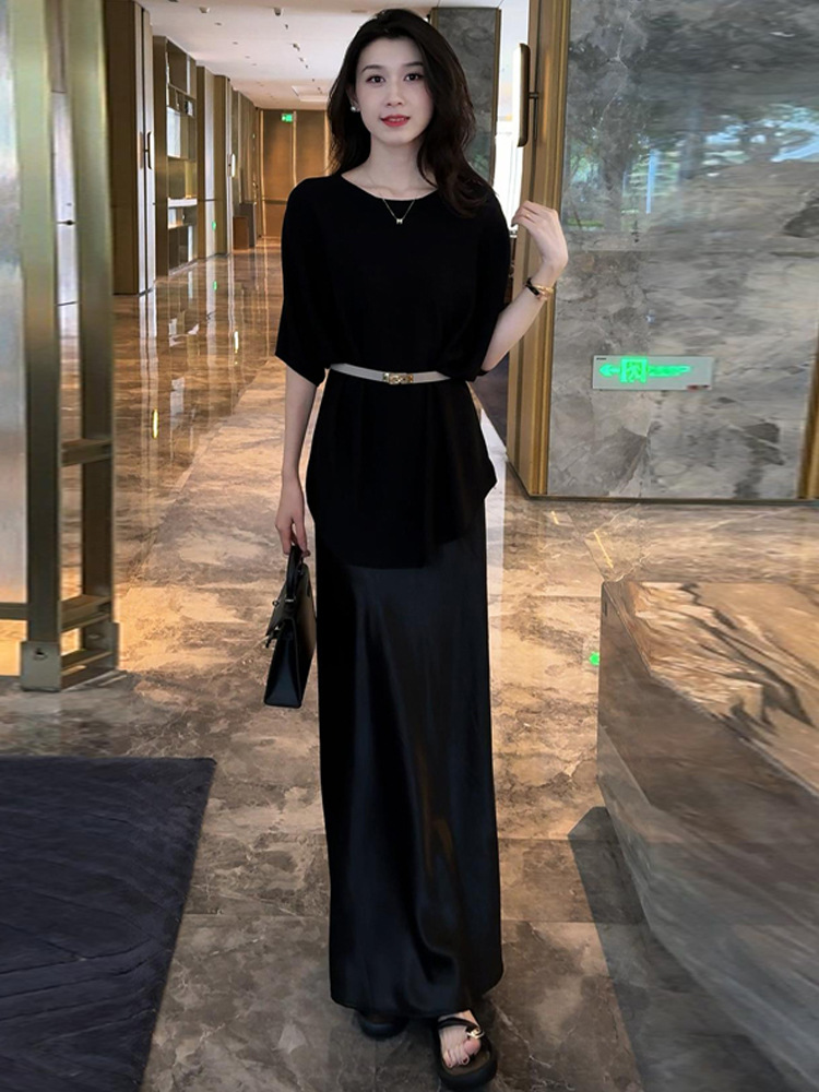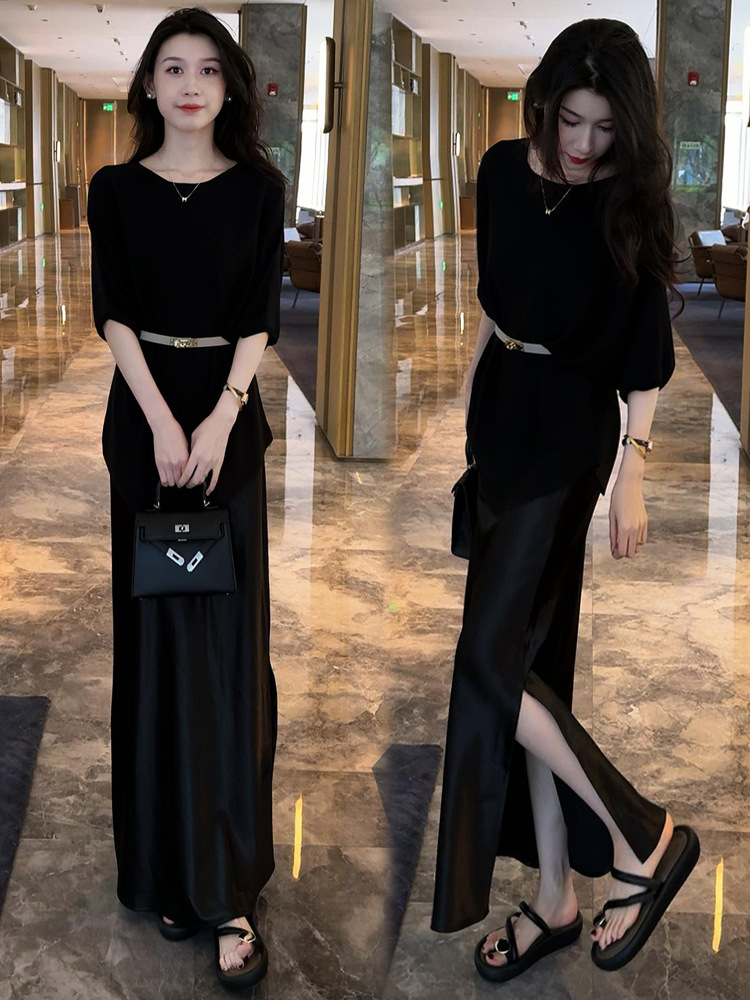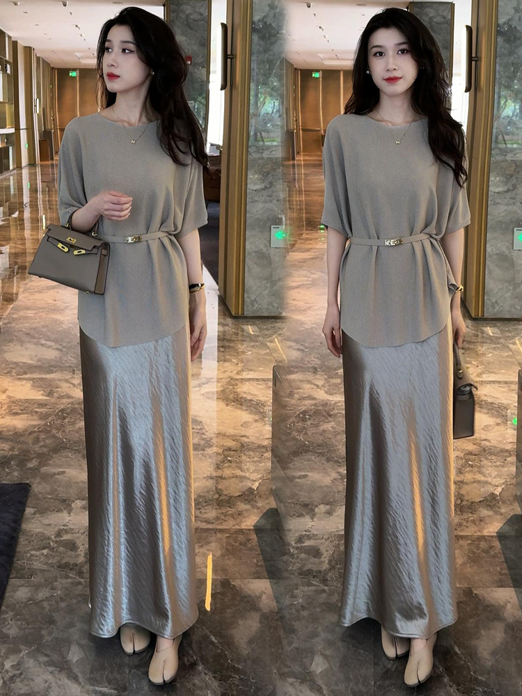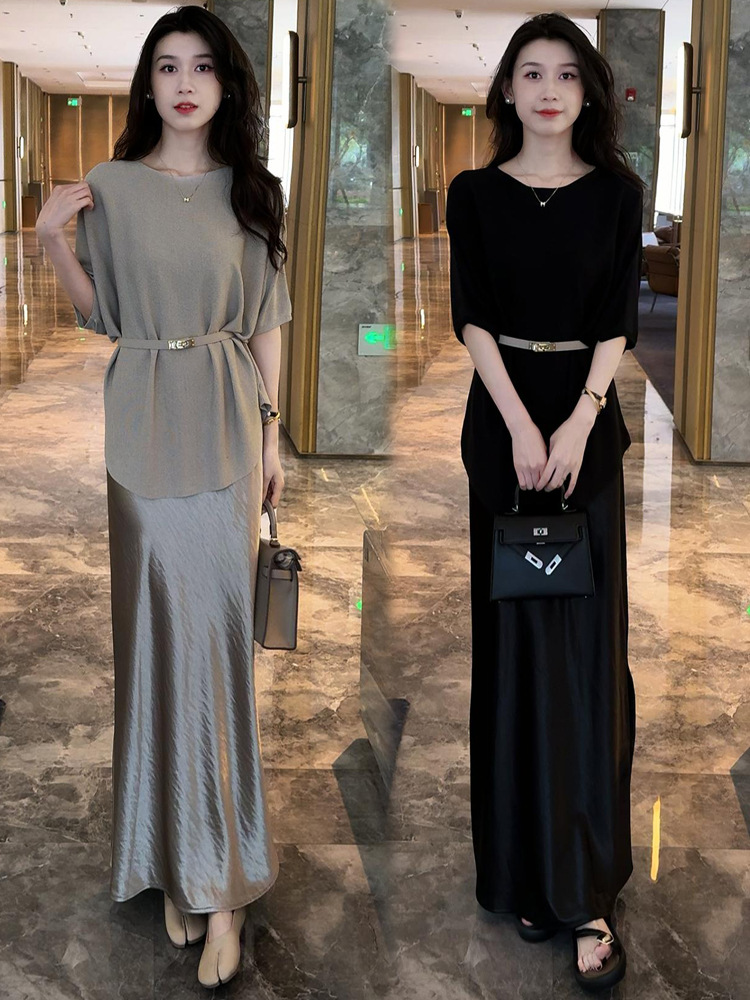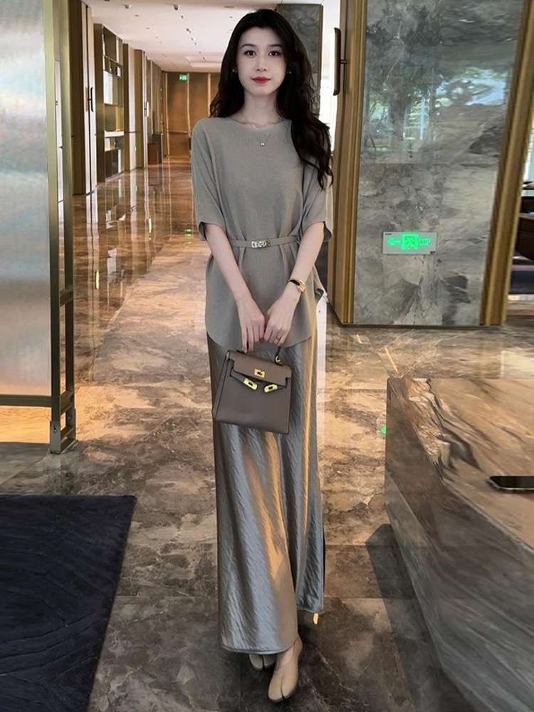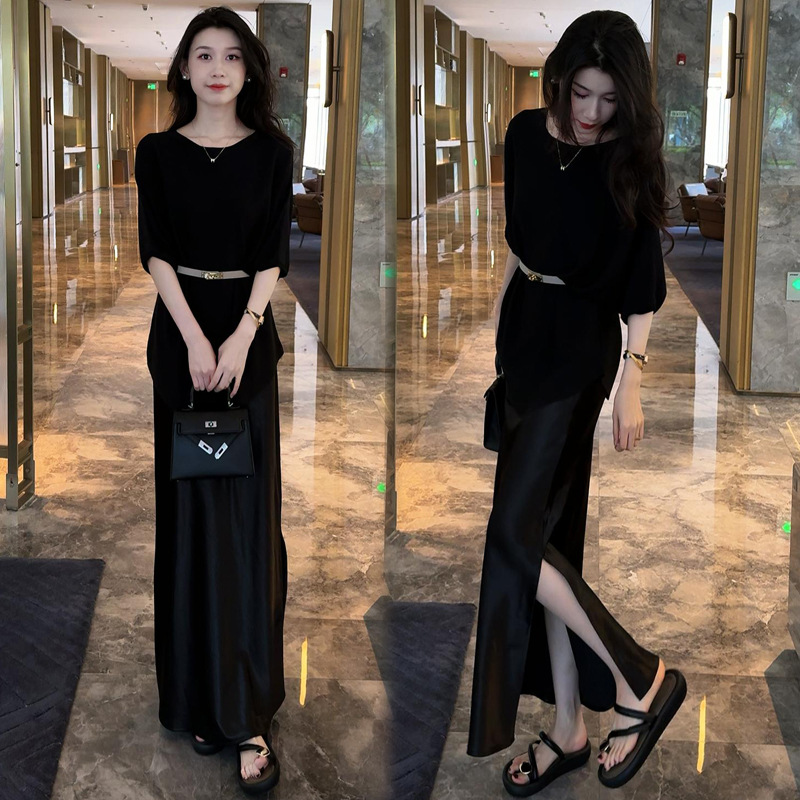 여성을위한 패션 정장 스커트 2025 여름 새로운 유행 느슨한 얼음 실크 탑 슬릿 스커트 투피스 세트