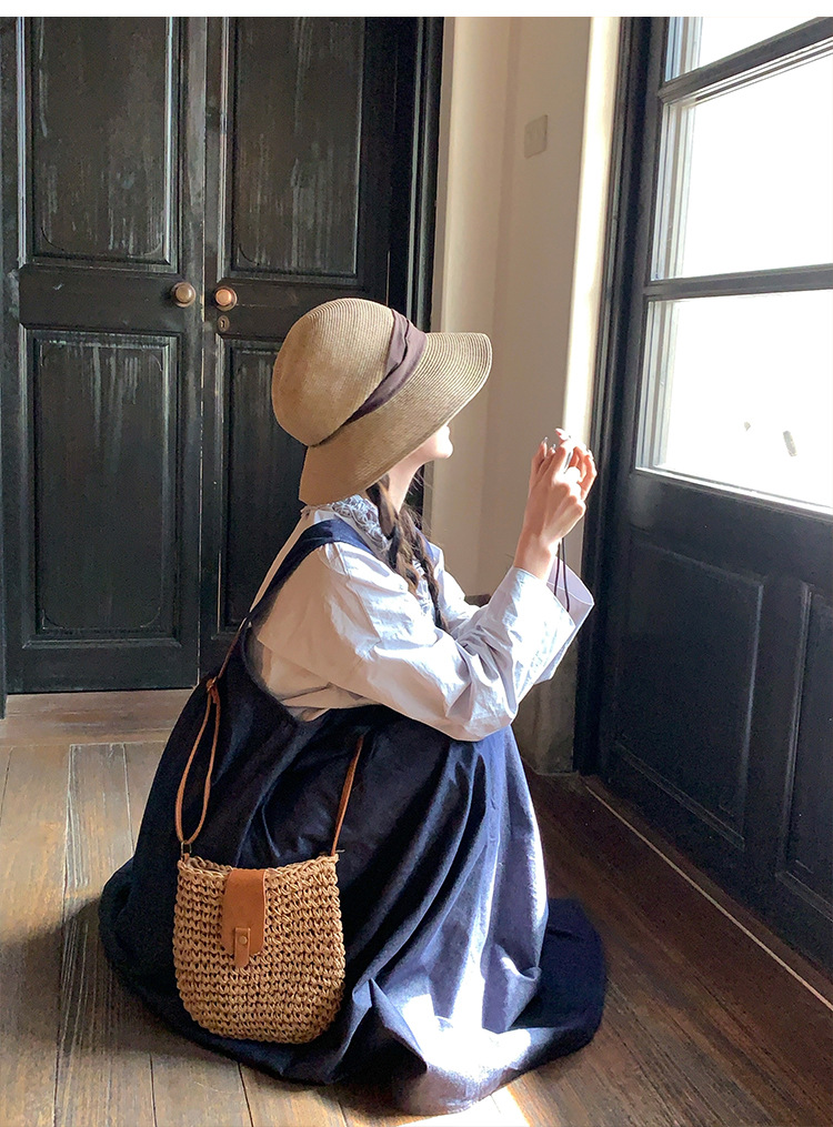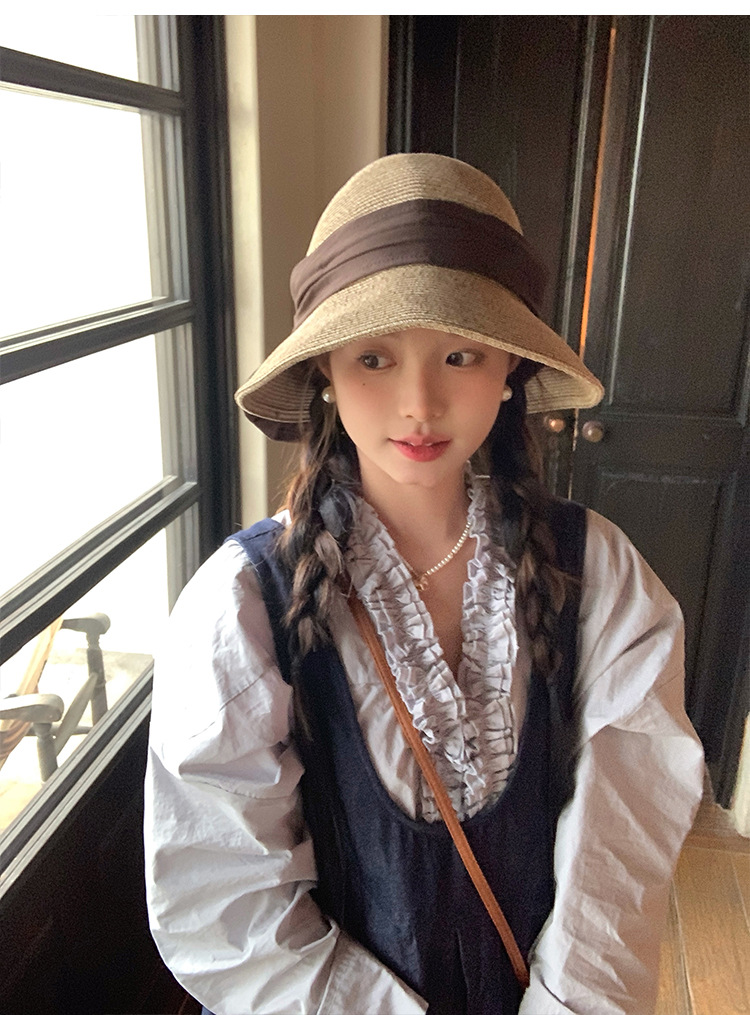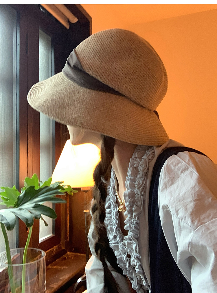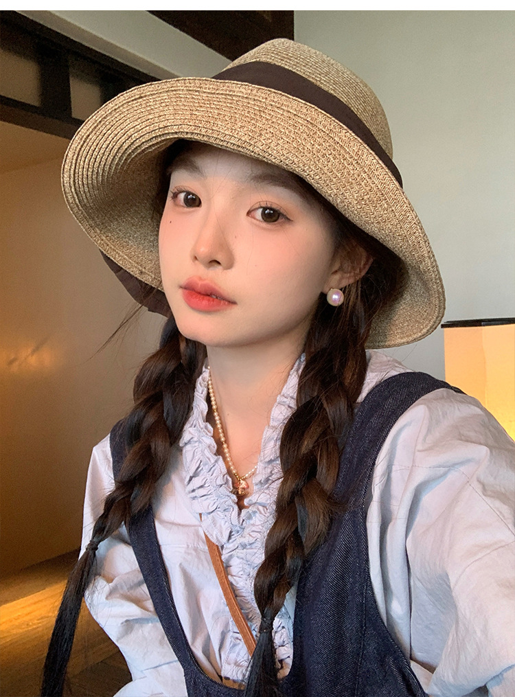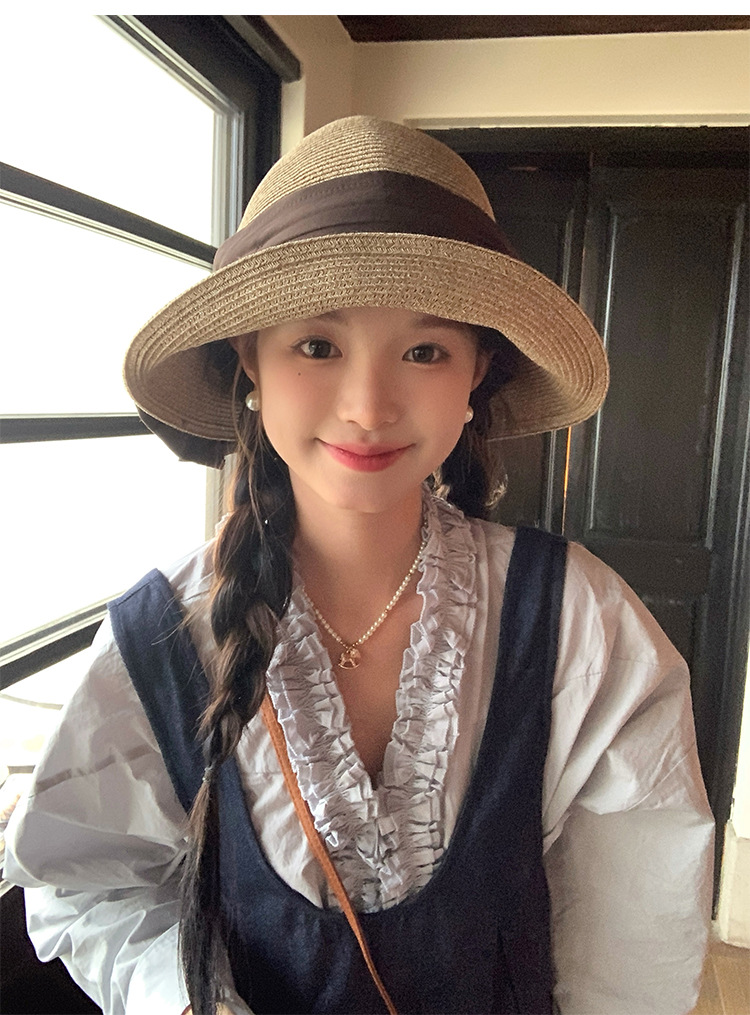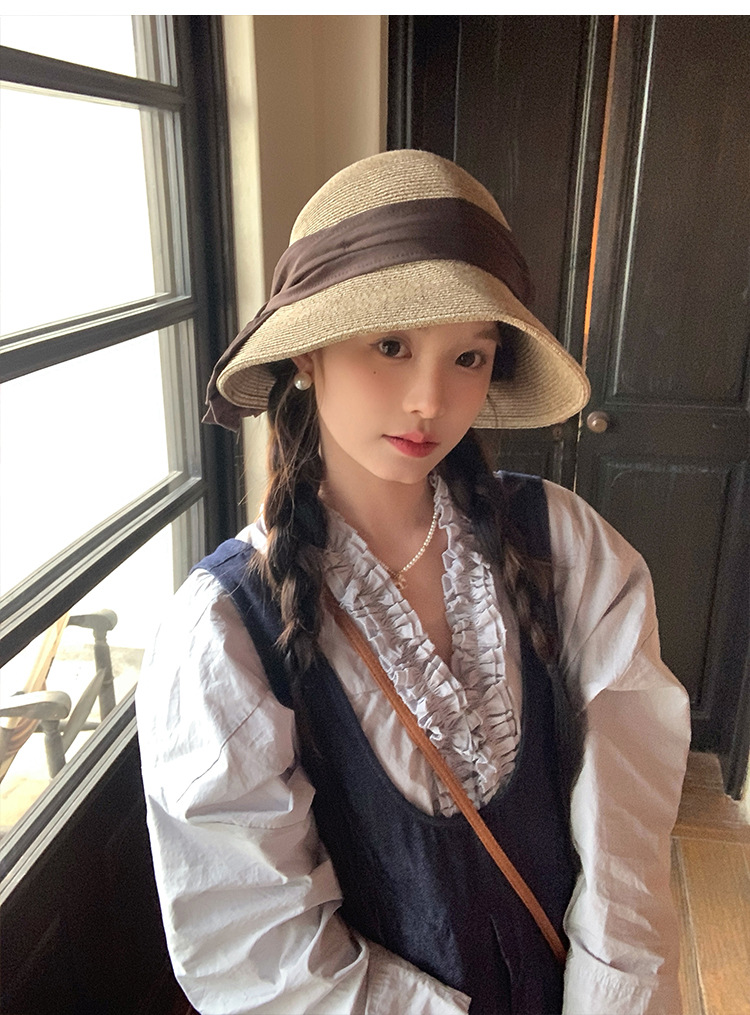 日系优雅蝴蝶结草编渔夫帽女夏季海边度假大檐遮阳草帽防晒太阳帽