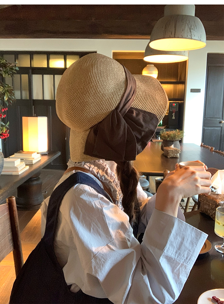 여성을위한 일본 우아한 나비 매듭 밀짚 어부 모자 여름 해변 휴가 큰 챙 태양 모자 태양 보호 태양 모자
