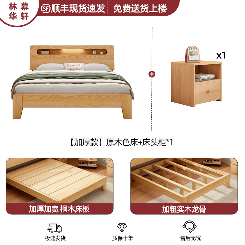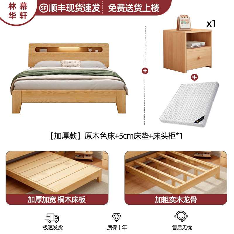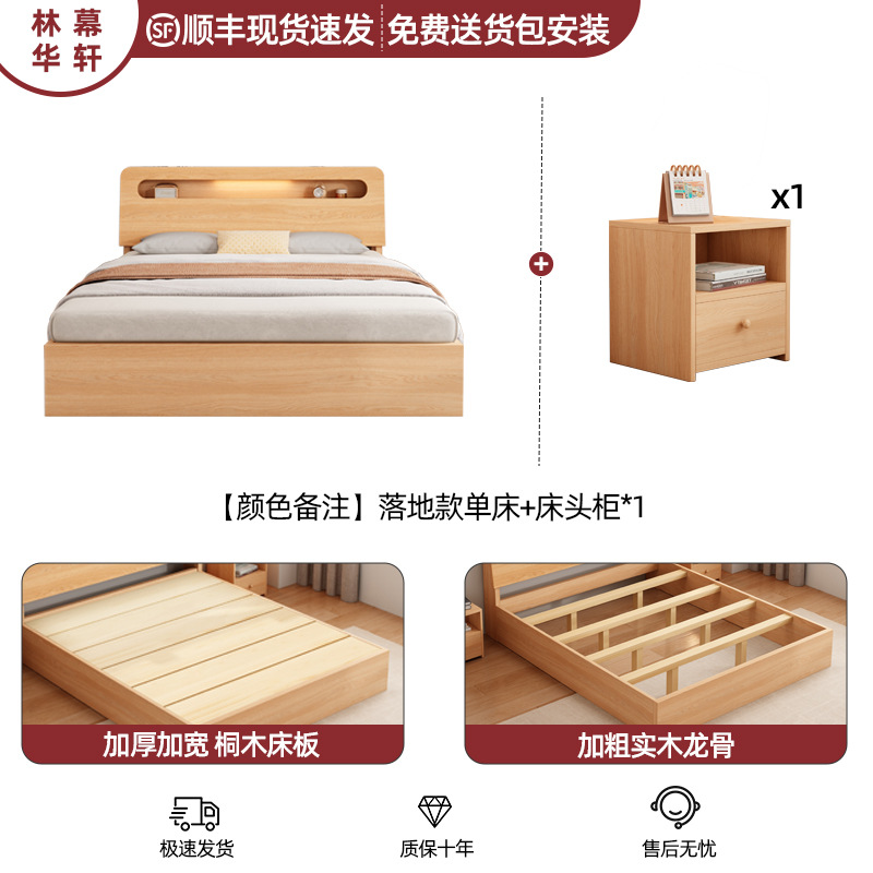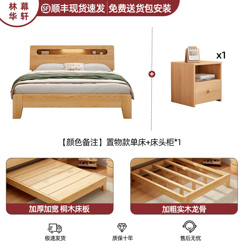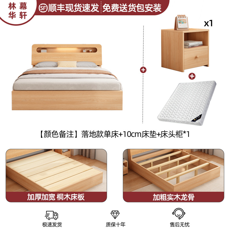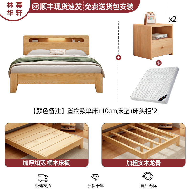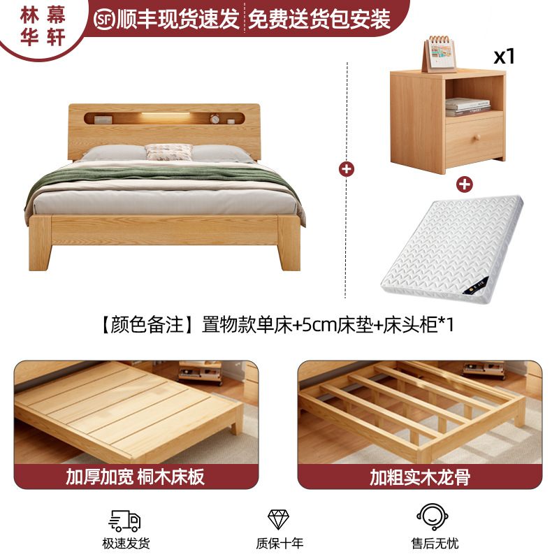 • [오동나무 판자] 플로어 스탠딩 우드 컬러 싱글 침대 + 5CM 코코넛 야자 매트리스 + 침대 옆 테이블 * 2 [집으로 배송]