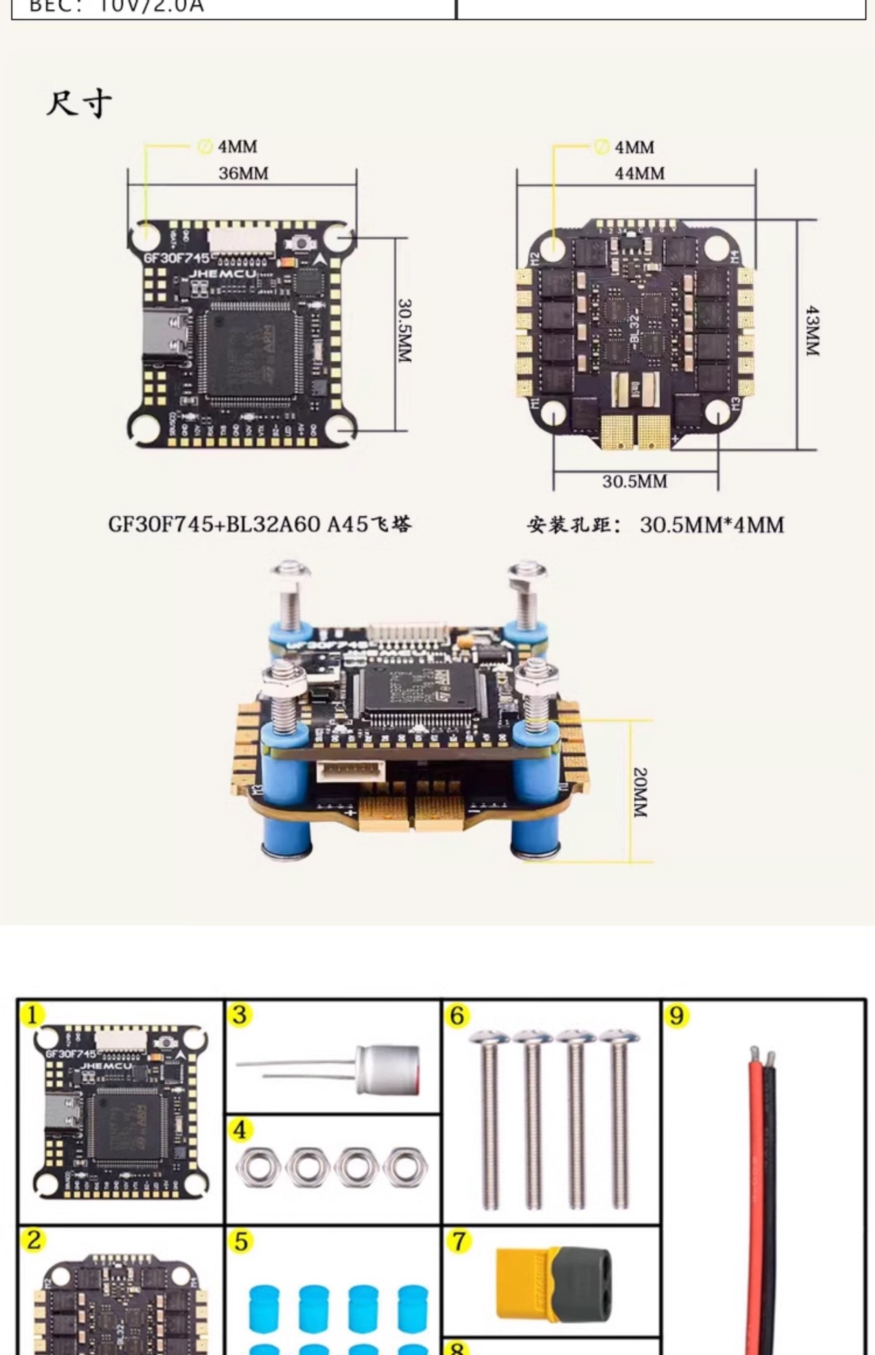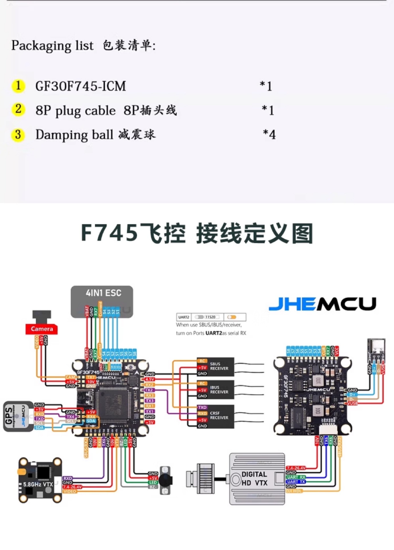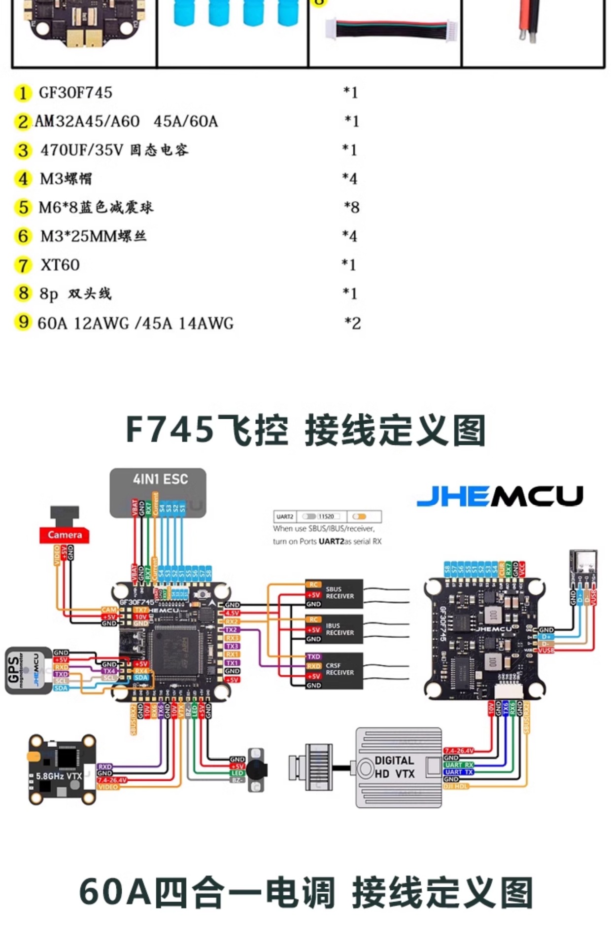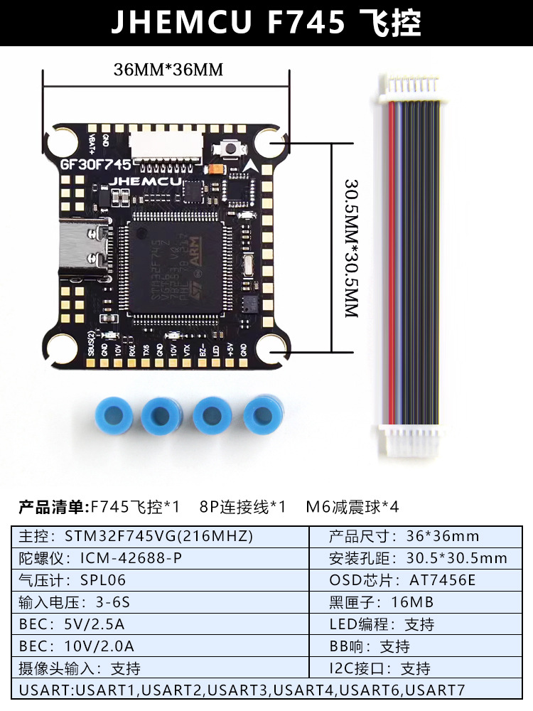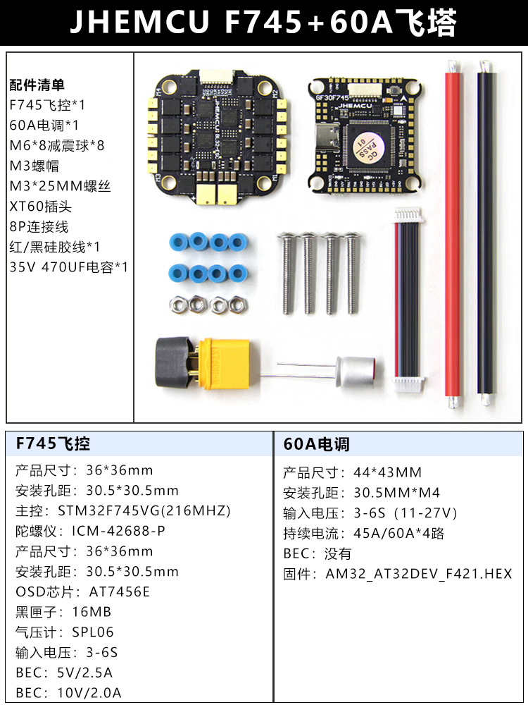 JHEMCU Jinhang F745 비행 제어 모델 비행기 60A 4-in-one ESC AM32 비트 FPV 드론 비행 타워